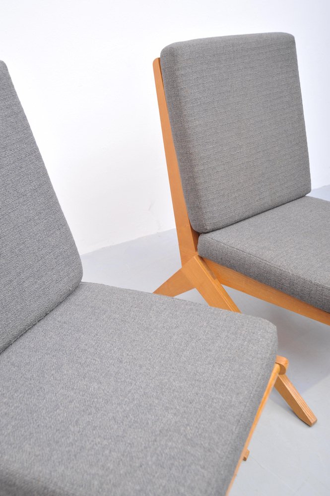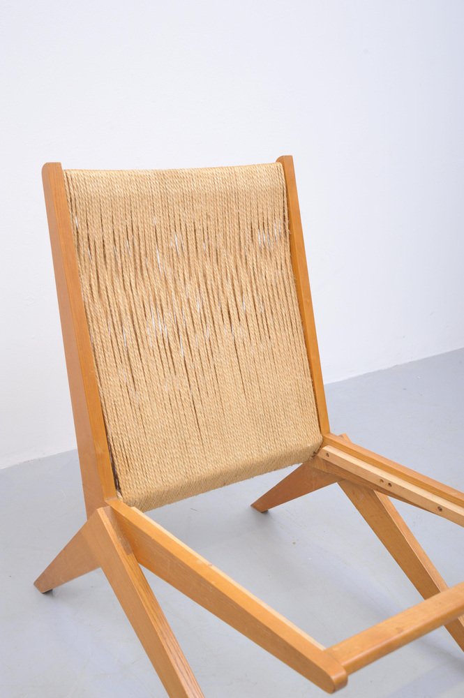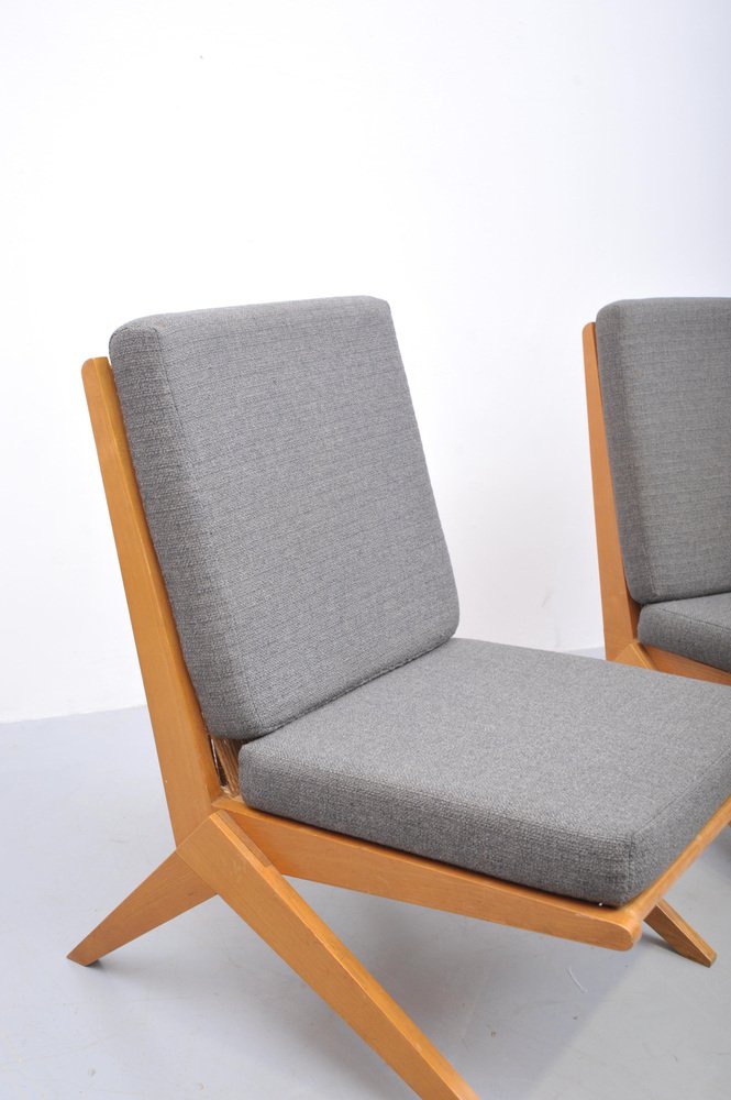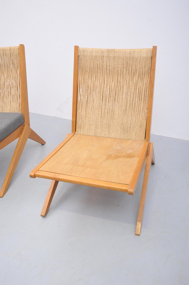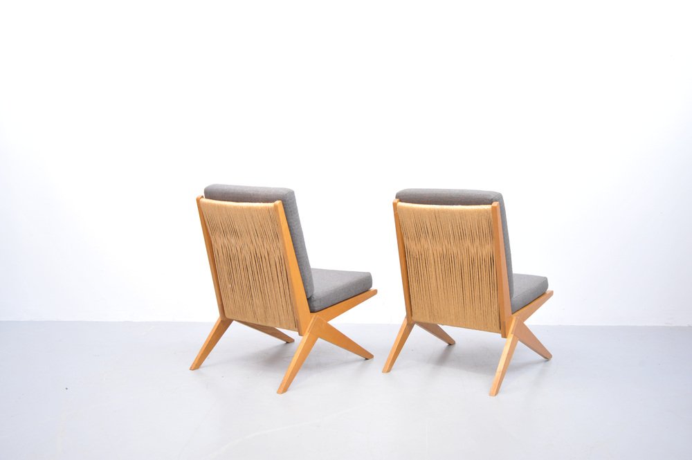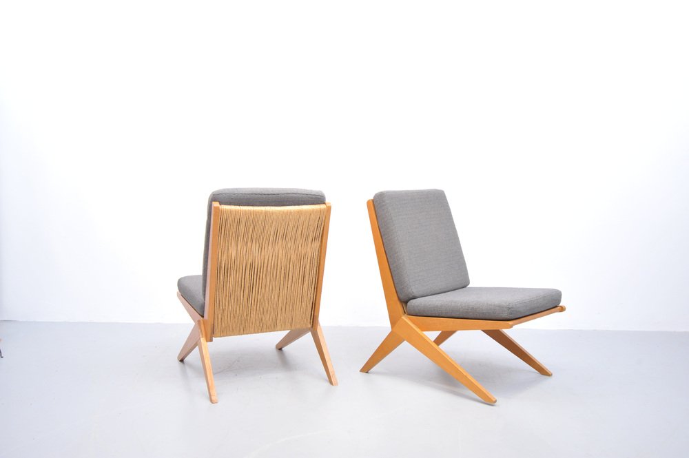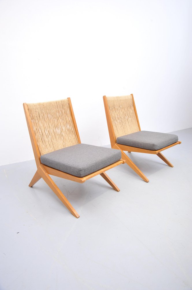 Mid-Century Ash Scissor Chairs with Back Sisal attributed to Pierre Jeanneret, 1950s, Set of 2