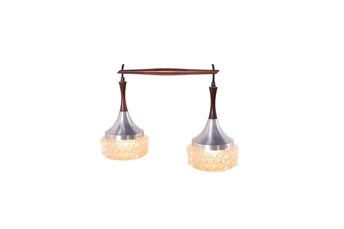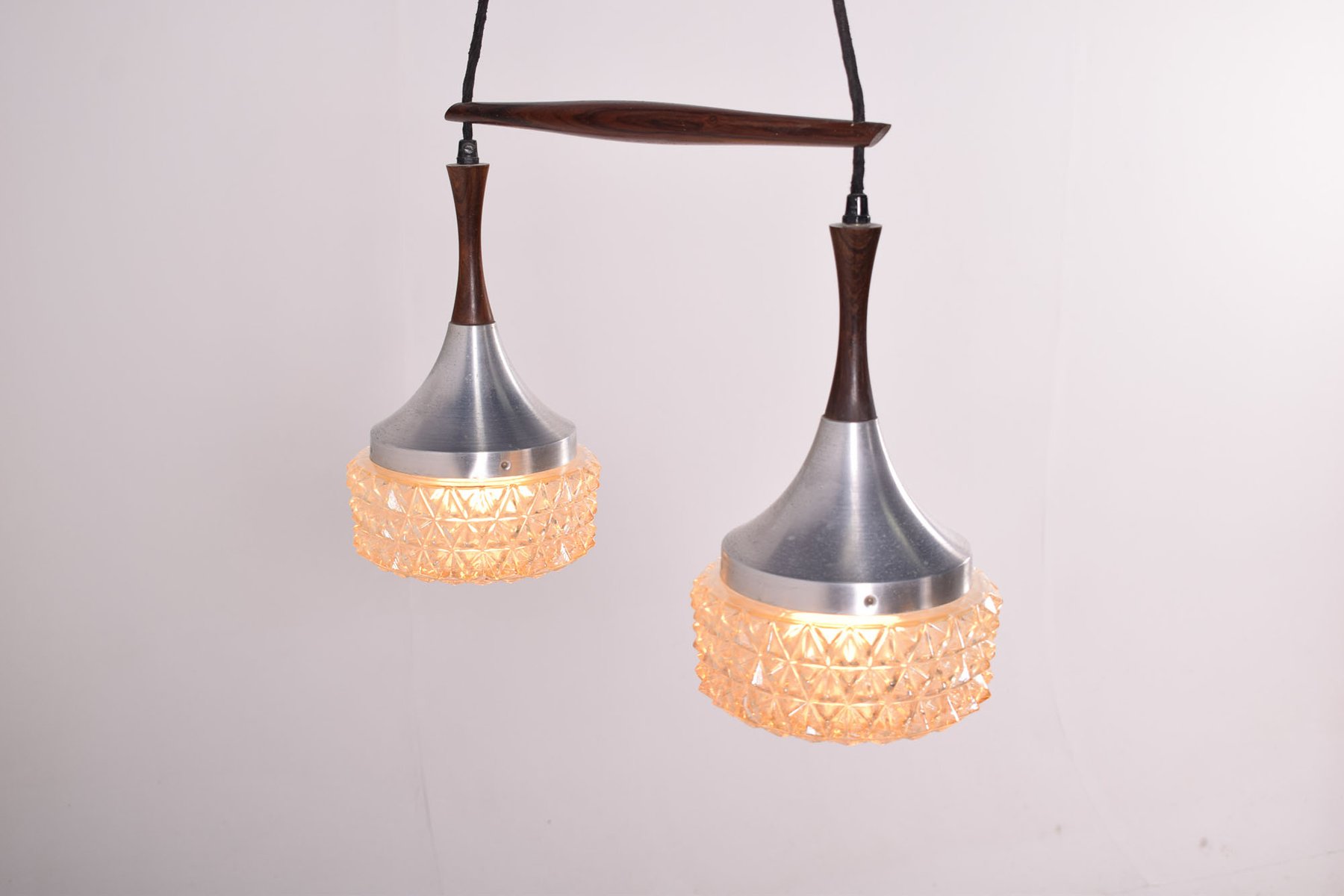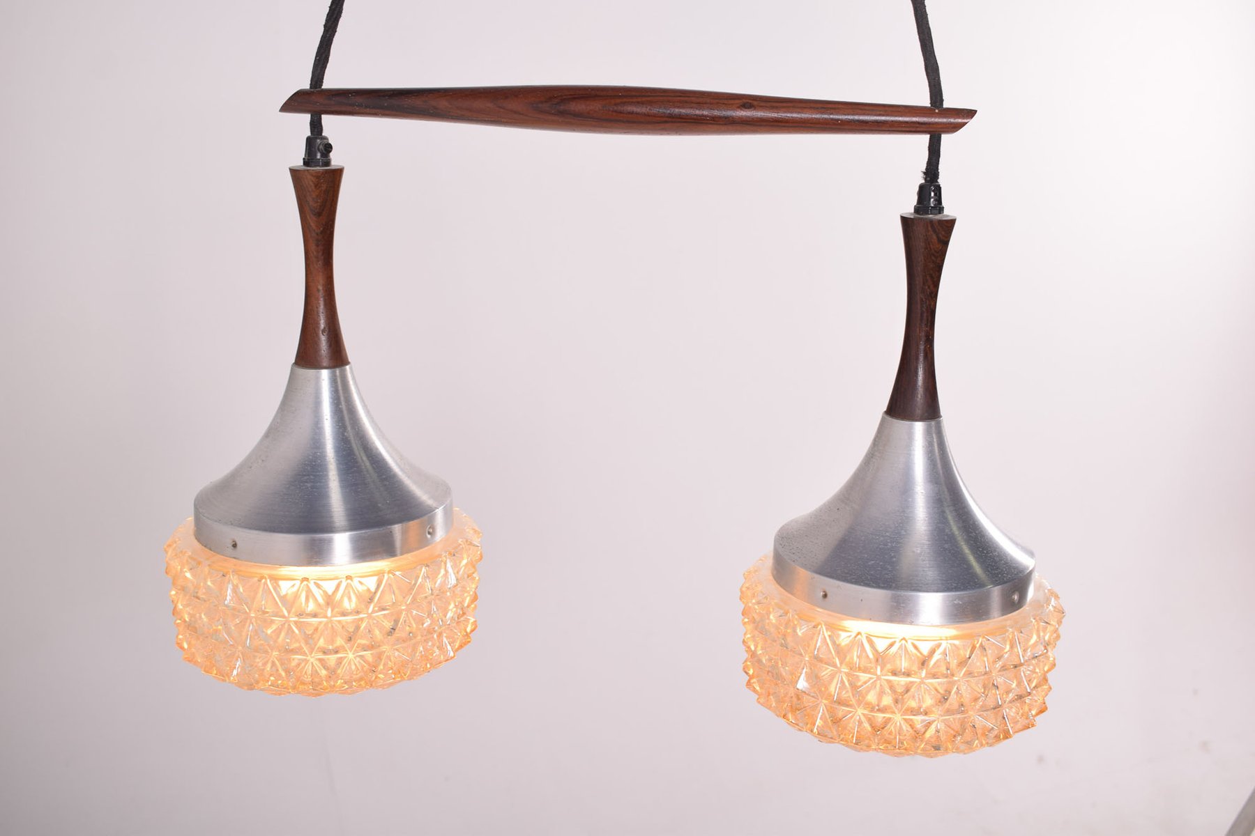 Mid-Century Danish Rosewood, Metal and Glass Dual Pendant Lamp, 1970