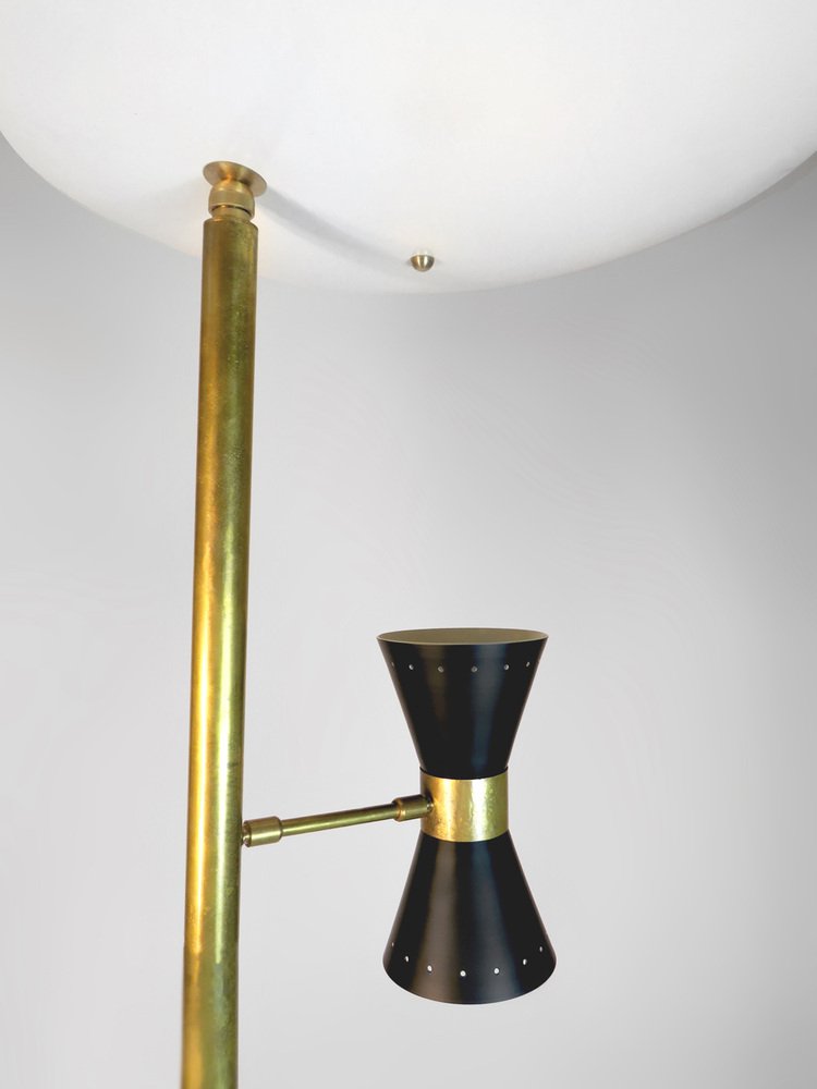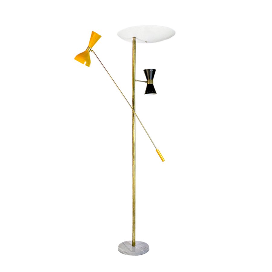 , many of which were designed by Lelli himself. Other iconic designers who worked with Arredoluce included Franco Albini, Achille and Pier Castiglioni, Vico Magistretti, Gio Ponti, Ettore Sottsass, Mario Tedeschi, and Nanda Vigo. Whereas many Arredoluce chandeliers and pendants are made from brass and feature opaline glass shades, the floor lamps and table lamps tend to be more minimalist in style, often featuring adjustable shades and articulated arms.