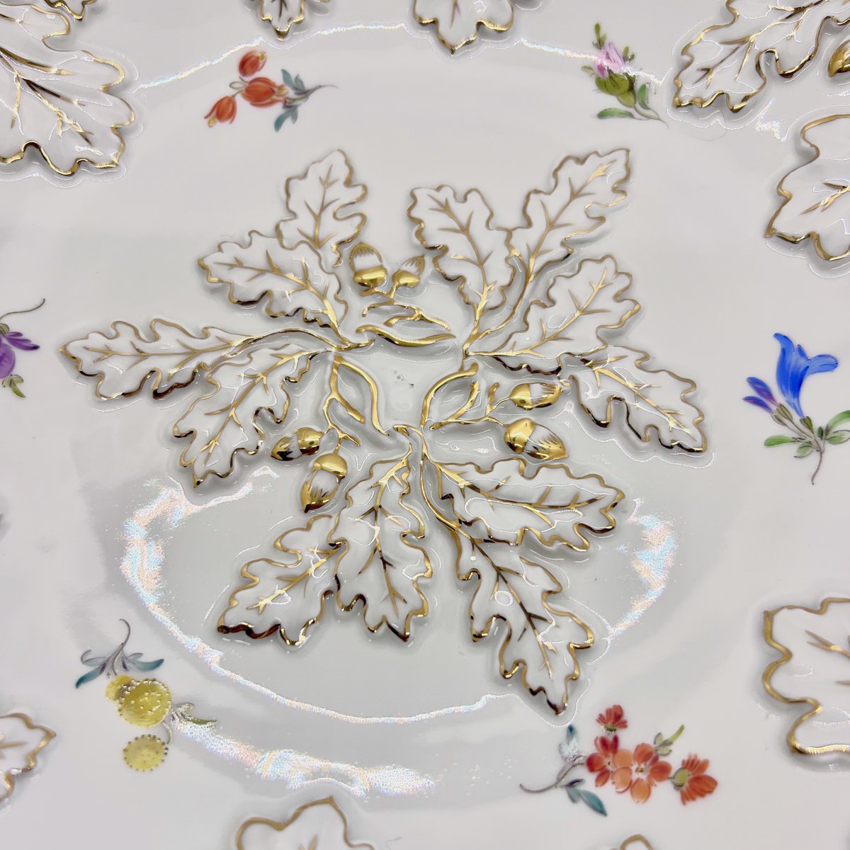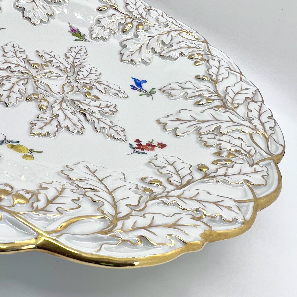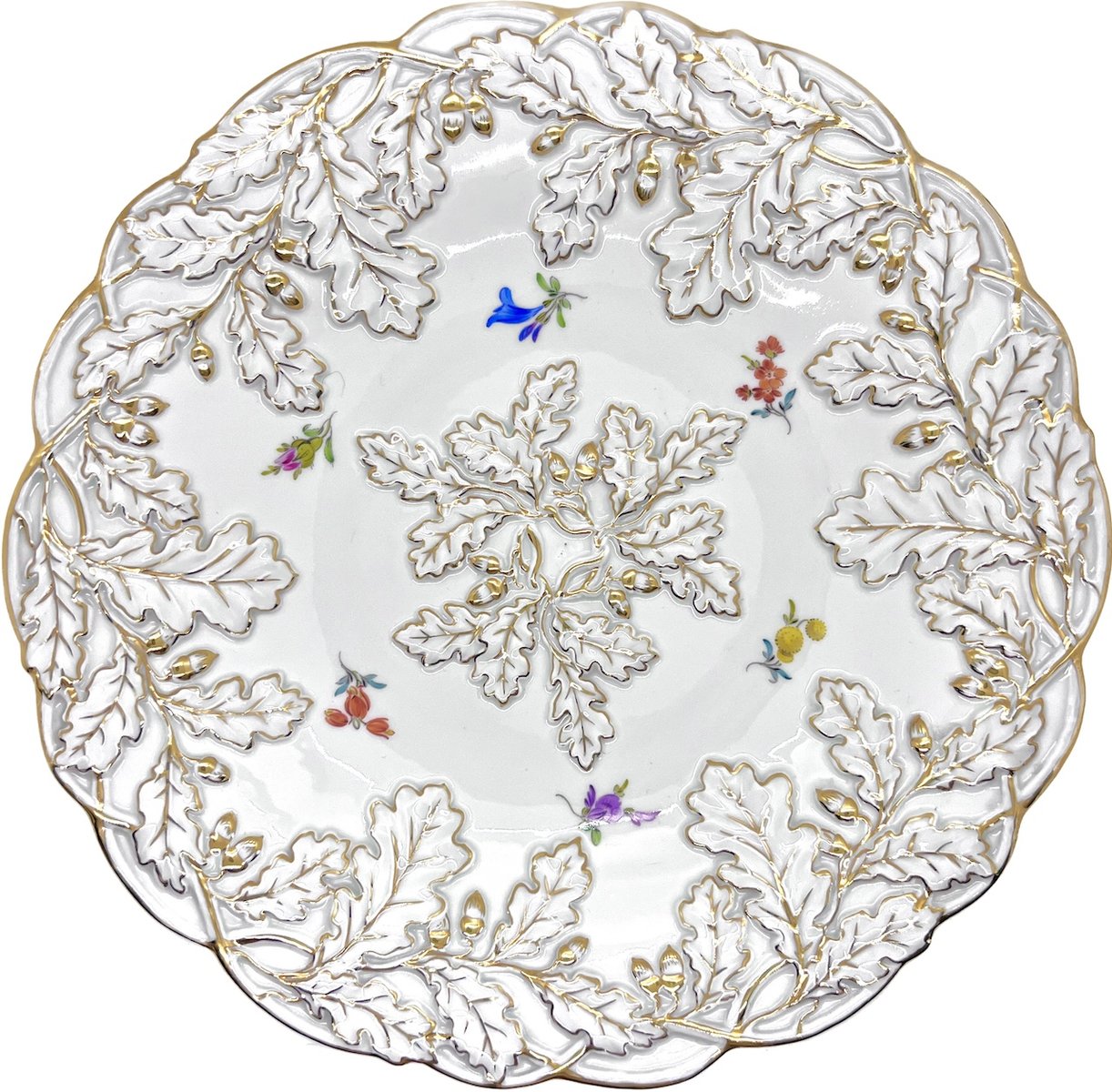 Mid-Century Rococo Revival Oak Leaf and Acorn Relief Plate with Streublumen Flowers from Meissen, 1940s