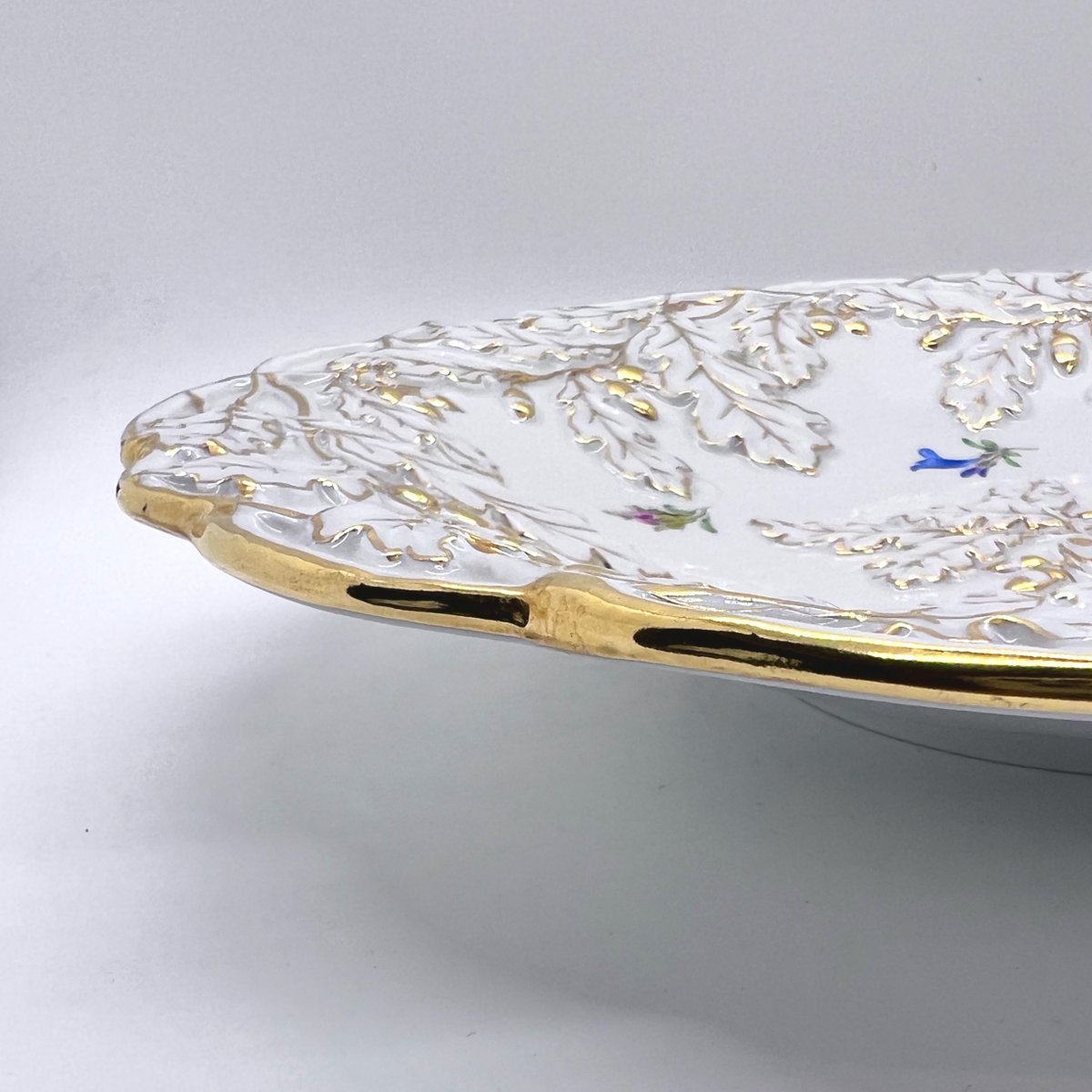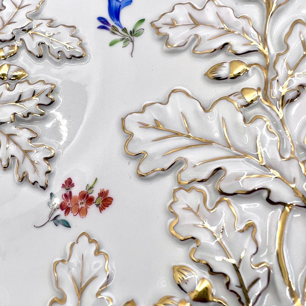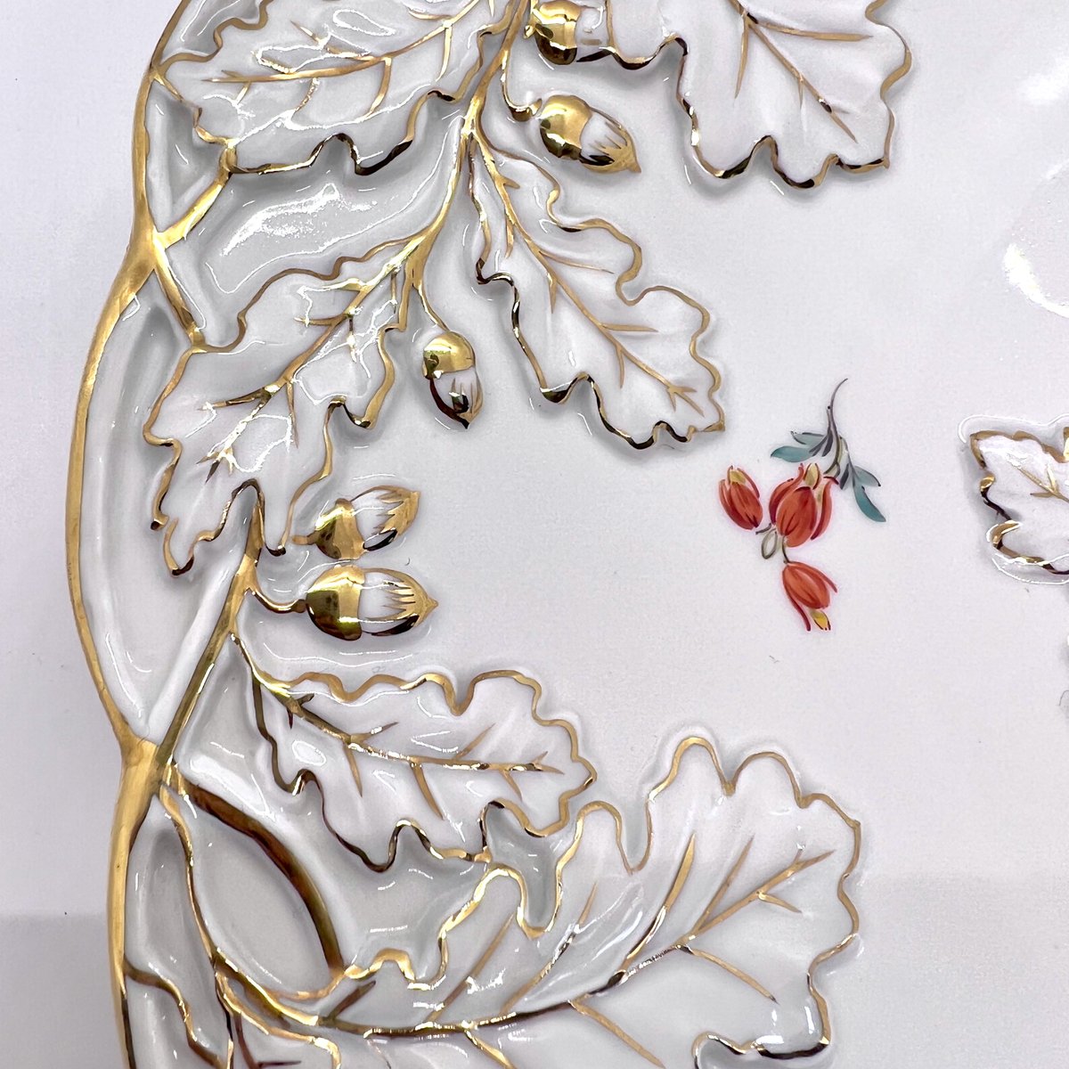 Mid-Century Rococo Revival Oak Leaf and Acorn Relief Plate with Streublumen Flowers from Meissen, 1940s