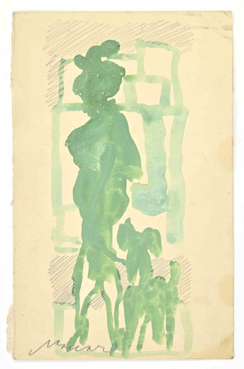 Green Lady is a watercolor Drawing realized by Mino Maccari (1924-1989) in the 1960s. Hand-signed on the lower. Good condition. Mino Maccari (Siena, 1924-Rome, June 16, 1989) was an Italian writer, painter, engraver and journalist, winner of the Feltrinelli Prize for Painting in 1963 and first winner of the Forte dei Marmi Satira Prize in 1973.After completing his secondary education, he enrolls in university. An interventionist like many young people of his time, he took part in the Great War at the age of nineteen as a field artillery officer. At the end of the conflict he resumed his university studies in Siena and in 1920 he graduated in law. In 1924 he was called by Angiolo Bencini to take care of the printing of the magazine Il Selvaggio, openly uncompromising fascist, revolutionary and anti-bourgeois, where his first engravings were published. After a few years of coexistence between work at the newspaper and the law firm, at the beginning of 1926 he left the legal profession to take over the direction of Il Selvaggio which he would hold until 1942. In 1928 he was the author of the small book published by Vallecchi (Florence), Il Trastullo di Strapaese (little songs and engraved woodwinds) which collected fascist songs (the same book was seized several times from Antonio Gramsci during his detention). with the transfer of the editorial staff of the Selvaggio in 1925 from Colle di Val d'Elsa to Florence, Maccari collaborated with Ardengo Soffici, Ottone Rosai and Achille Lega. In the meantime, between 1927 and 1930, he made himself known to the general public as a painter by participating in various national exhibitions. Also in 1930 Maccari works in Turin at La Stampa as editor-in-chief and has the writer Curzio Malaparte as director. His presence in the cultural and editorial world of the fascist regime is very intense, he writes and collaborates with various magazines: Quadrivio, L'Italia Letteraria, L'Italiano and Omnibus by Leo Longanesi; then, during the war, in il Primato di Bottai and, subsequently again, in Il Mondo di Pannunzio (from the first number, in 1949), up to Documento by Federigo Valli. His graphic production is also vast, ranging from the Album of Vallecchi (1925), Il trastullo di Strapaese (1928) to Linoleum (1931). Maccari illustrated in 1934 La vecchia del Bal Bullier by Antonio Baldini and in 1942 he published the Album folder, followed by Come quando fuori Piove and Il superfluo illustrata.For his pictorial work full of evident chromatic accentuations and fast brushstrokes, the violent drawing combined with the lively stroke of the graphic sign of his engravings, he is recognized by critics as a complete artist. In 1962 he was also entrusted with the presidency of the Accademia di San Luca in Rome and managed to obtain a personal exhibition at Gallery 63 in New York. His production of drawings, watercolors, temperas, etc. is endless, sometimes in collaboration with prestigious publishing houses; it is worth mentioning, just as an excellent example, the 32 b/w and color drawings with which he illustrated Il gusto di vivere, a volume that collects writings by Giancarlo Fusco, edited by Natalia Aspesi and published by Laterza in 1985. Maccari, Sienese and great contradaiolo della Torre, painted the Palio of 16 August 1970 won by Selva. In 1973 he was awarded the Political Satire Award of Forte dei Marmi, an award born in that year. He died without great fanfare, in silence, at the age of ninety, in Rome on June 16, 1989.