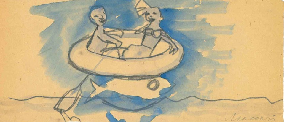 Lovers in Boat is a pencil and watercolor Drawing realized by Mino Maccari (1924-1989) in the 1960s. Hand-signed on the lower. Good condition. Mino Maccari (Siena, 1924-Rome, June 16, 1989) was an Italian writer, painter, engraver and journalist, winner of the Feltrinelli Prize for Painting in 1963 and first winner of the Forte dei Marmi Satira Prize in 1973.After completing his secondary education, he enrolls in university. An interventionist like many young people of his time, he took part in the Great War at the age of nineteen as a field artillery officer. At the end of the conflict he resumed his university studies in Siena and in 1920 he graduated in law. In 1924 he was called by Angiolo Bencini to take care of the printing of the magazine Il Selvaggio, openly uncompromising fascist, revolutionary and anti-bourgeois, where his first engravings were published. After a few years of coexistence between work at the newspaper and the law firm, at the beginning of 1926 he left the legal profession to take over the direction of Il Selvaggio which he would hold until 1942. In 1928 he was the author of the small book published by Vallecchi (Florence), Il Trastullo di Strapaese (little songs and engraved woodwinds) which collected fascist songs (the same book was seized several times from Antonio Gramsci during his detention). with the transfer of the editorial staff of the Selvaggio in 1925 from Colle di Val d'Elsa to Florence, Maccari collaborated with Ardengo Soffici, Ottone Rosai and Achille Lega. In the meantime, between 1927 and 1930, he made himself known to the general public as a painter by participating in various national exhibitions. Also in 1930 Maccari works in Turin at La Stampa as editor-in-chief and has the writer Curzio Malaparte as director. His presence in the cultural and editorial world of the fascist regime is very intense, he writes and collaborates with various magazines: Quadrivio, L'Italia Letteraria, L'Italiano and Omnibus by Leo Longanesi; then, during the war, in il Primato di Bottai and, subsequently again, in Il Mondo di Pannunzio (from the first number, in 1949), up to Documento by Federigo Valli. His graphic production is also vast, ranging from the Album of Vallecchi (1925), Il trastullo di Strapaese (1928) to Linoleum (1931). Maccari illustrated in 1934 La vecchia del Bal Bullier by Antonio Baldini and in 1942 he published the Album folder, followed by Come quando fuori Piove and Il superfluo illustrata.For his pictorial work full of evident chromatic accentuations and fast brushstrokes, the violent drawing combined with the lively stroke of the graphic sign of his engravings, he is recognized by critics as a complete artist. In 1962 he was also entrusted with the presidency of the Accademia di San Luca in Rome and managed to obtain a personal exhibition at Gallery 63 in New York. His production of drawings, watercolors, temperas, etc. is endless, sometimes in collaboration with prestigious publishing houses; it is worth mentioning, just as an excellent example, the 32 b/w and color drawings with which he illustrated Il gusto di vivere, a volume that collects writings by Giancarlo Fusco, edited by Natalia Aspesi and published by Laterza in 1985. Maccari, Sienese and great contradaiolo della Torre, painted the Palio of 16 August 1970 won by Selva. In 1973 he was awarded the Political Satire Award of Forte dei Marmi, an award born in that year. He died without great fanfare, in silence, at the age of ninety, in Rome on June 16, 1989.