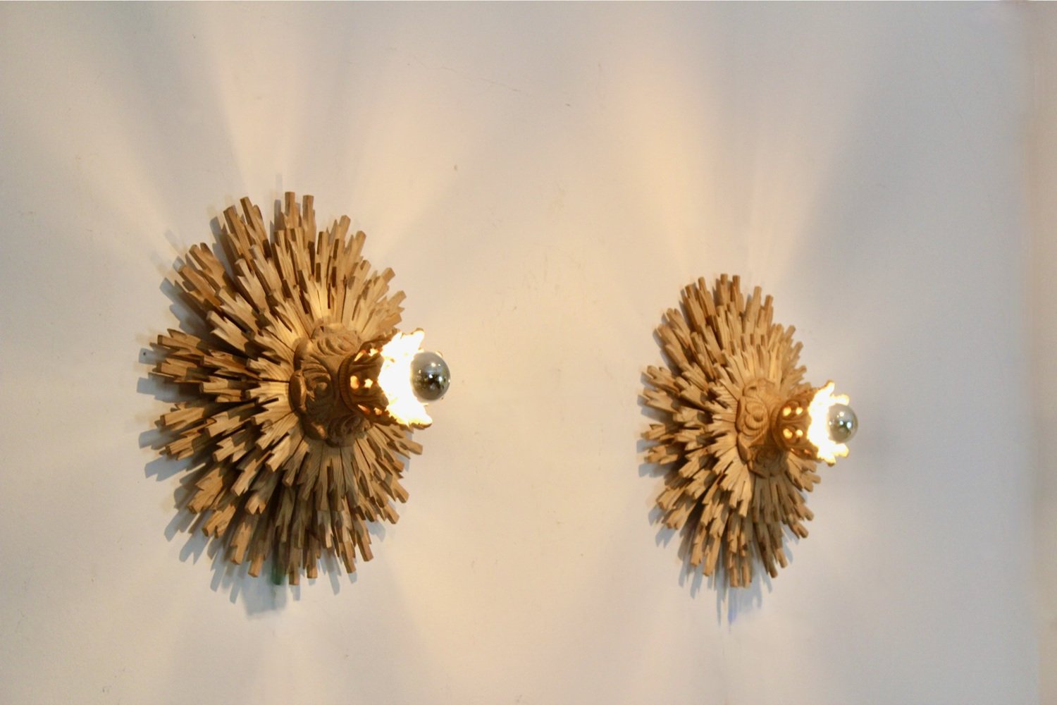 Natural Large Carved Sunburst Wooden Sconces, 1960s, Set of 2
