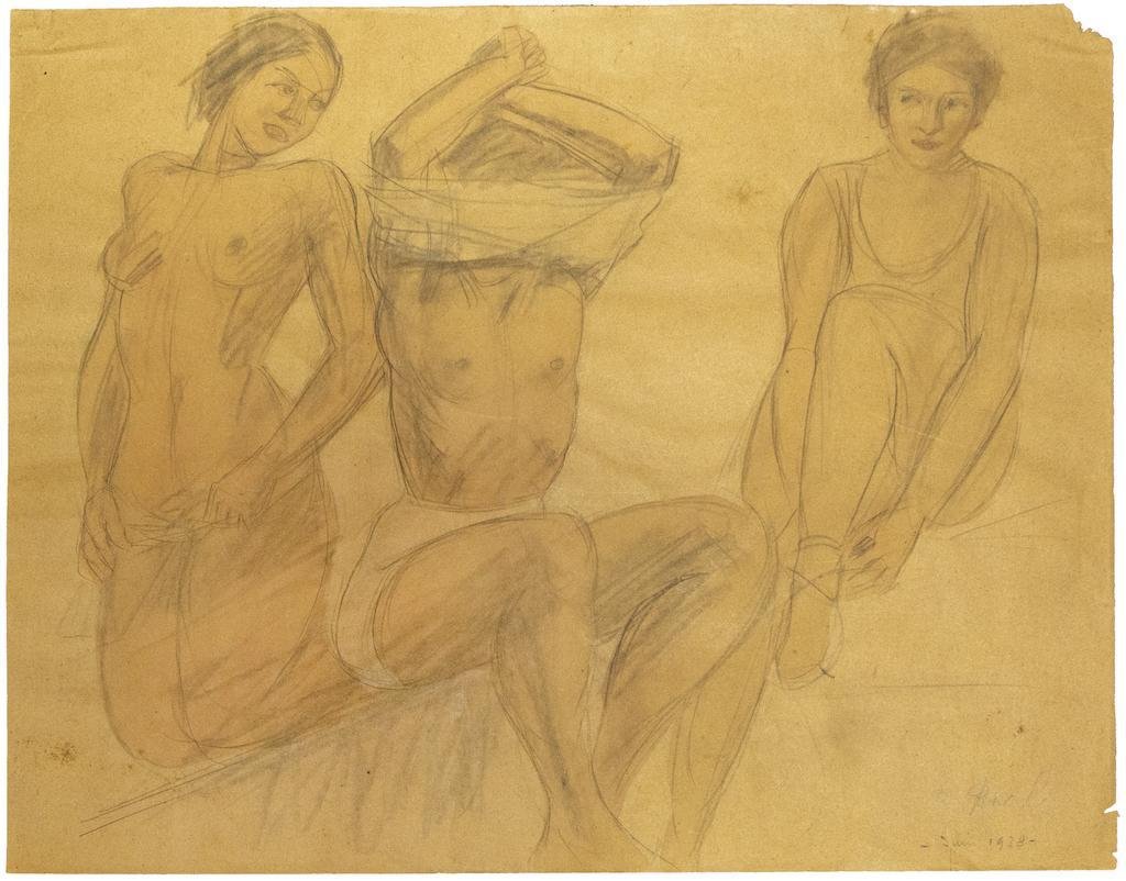 O. Roche, Figures, Pencil and Oil Pastel on Paper, 1938