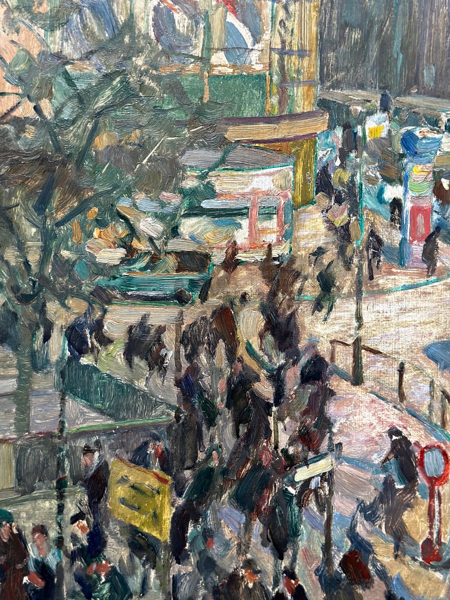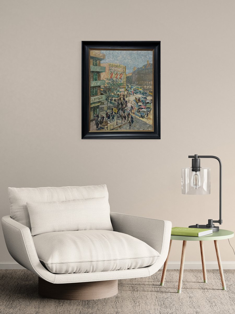 In his early years, Antoine painted primarily landscapes and extensively in watercolor. After his apprenticeship with Skarbina, he preferred oil paint as a more expressive medium for larger paintings and increasingly turned to city motifs. The number of oil paintings, pastels, watercolors, and etchings with Berlin motifs is large. Horse-drawn carriages on rain-soaked streets, the hustle and bustle of Leipziger Straße, and passersby at the Brandenburg Gate are impressions that the artist captured in their randomness and momentaryness. The cathedral, the palace and the palace bridge (Kaiser Friedrich Bridge), Unter den Linden, the Brandenburg Gate, Leipziger Platz with Wertheim, Potsdamer Platz, Alexanderplatz with Berolina and the police headquarters, the Reichstag, the Tiergarten, the Kurfürstendamm, the Kaiser Wilhelm Memorial Church and Tauentzienstraße, the City Hall, and the Old Museum are all naturally included in the long, by no means exhaustive, list of Berlin paintings. It is representative Berlin, the Berlin of monumental buildings. All the pictures are atmospherically painted in virtuoso Impressionist technique. The atmosphere of the period and its changes are evident in the means of transport, the cabs, trams, and buses with their still-open upper floors, as well as in the clothing of pedestrians. Otto Antoine also captured military scenes in his paintings several times, such as the Changing of the Guard on Unter den Linden or the Kaiser's birthday parade. On Saturdays and Sundays, he enjoyed going out into nature, accompanied by his wife and children, to paint outdoors outside the city gates.