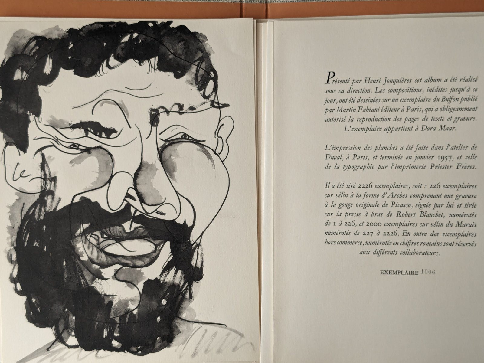 In 1943, Picasso brought to his lover, the Surrealist photographer and painter Dora Maar, a copy of the Histoire naturelle that he had dedicated to her. Meanwhile, at her studio, he decorated the margins and blank pages with human heads, animals, and fantastical creatures, with Maar herself as a bird-woman sphinx on the title page. The dedication, “per Dora Maar / tan rébufona!” (for Dora Maar, so pretty!), is a pun on the name Buffon and the Catalan word for “pretty,” bufó.