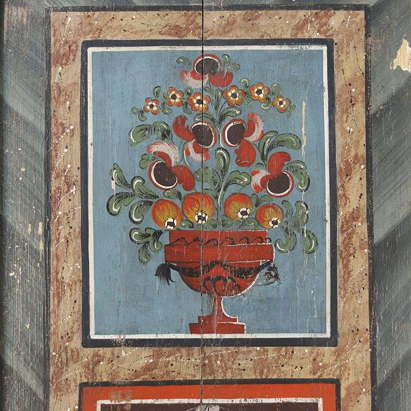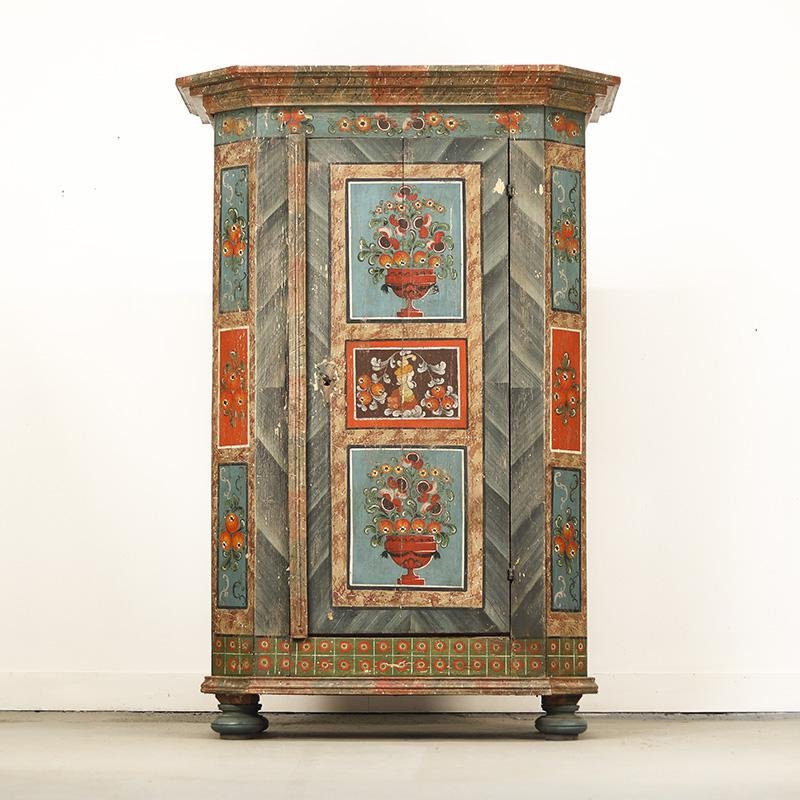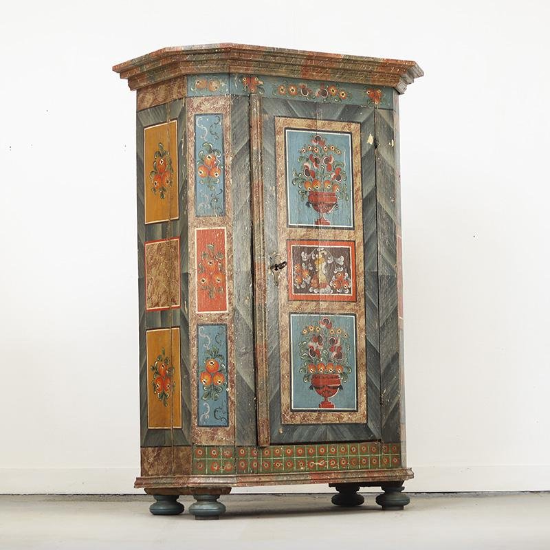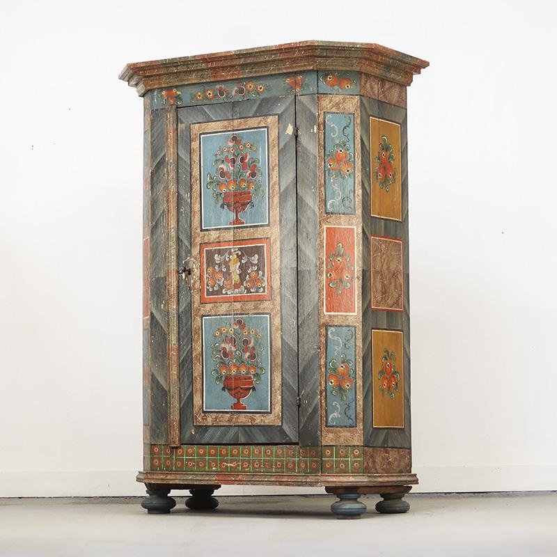 Colorfully painted bridal cupboard which dates to about 1800. This cabinet is painted mainly in a blue hue with many floral paintings. The cornices are red marbled. The piece of furniture has once been restored, which means that part of the bottom and legs have been replaced. Furthermore, it has also been treated against woodworm, some traces of which are visible on the inside and back. In terms of layout, the cabinet has a shelf and rod. The door still has the original working lock and key. It used to be customary to give wedding furniture like this as a gift to the couple at a wedding. This furniture was afterwards placed on the farm in a showroom that was only rarely used for high visits or special occasions. So a beautiful and decorative piece of history. The crest can be removed for transport. 183cm high, 124cm wide, 64cm deep.