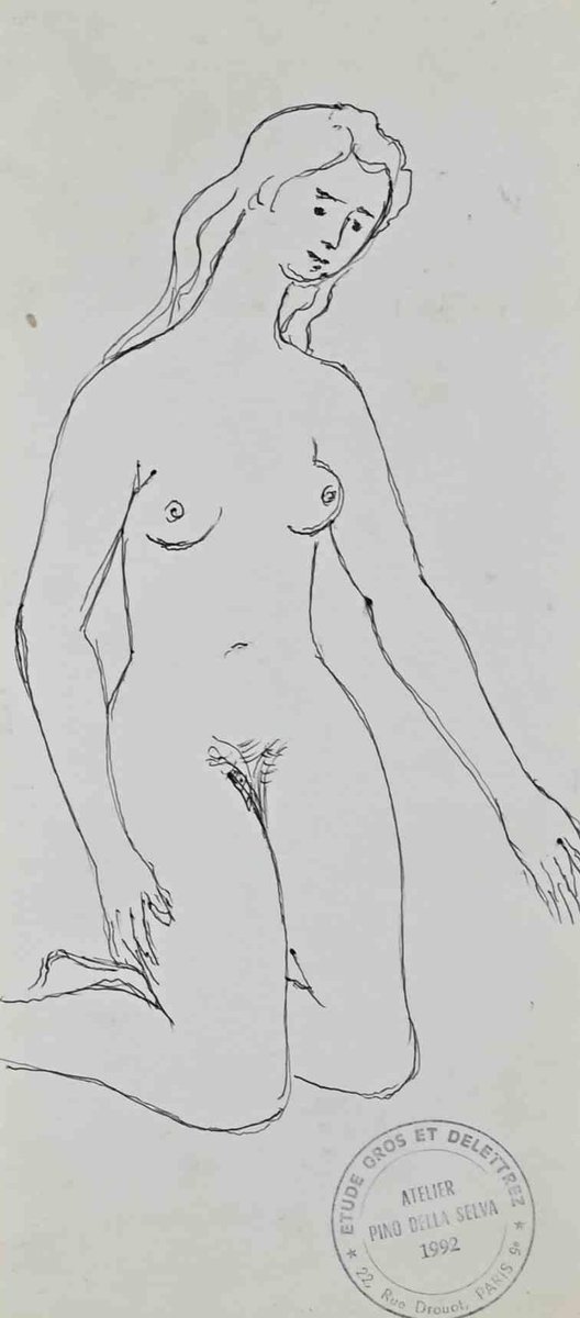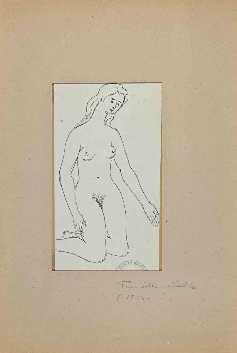 Pino della Selva, Nude of Woman, Original China Ink Drawing, Mid-20th Century