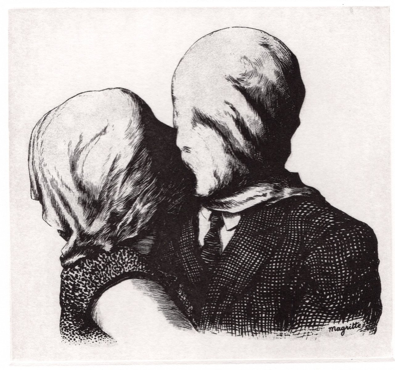 For me, despite Magritte’s disavowal of meaning, The Lovers emerges as an artistic interpretation of the act of loving: the yearning for intimacy, the challenges of communication, and the ongoing struggle with autonomy. Being intimate without ever truly touching, these lovers exist alone yet together. Magritte’s imagery compels us to question the depth and authenticity of our relationships. The masked lovers invite us to contemplate the masks we willingly or unwillingly wear. Visually narrating the walls erected by trauma, the painting urges us to consider the layers of protection we drape over our most vulnerable selves. The difficulty of connecting authentically is rooted in the inherent vulnerability it requires, and the unveiling of the self—literal or metaphorical—remains a universal human aspiration. The pursuit of connection remains a powerful incentive that propels us through the intricate twists and turns of our relationships. Through his elusiveness, Magritte reminds us that we do not look on as neutral observers, but as carriers of our experiences and perspectives. In the end, each viewer enriches the painting’s layers of meaning and contributes to an ongoing dialogue.