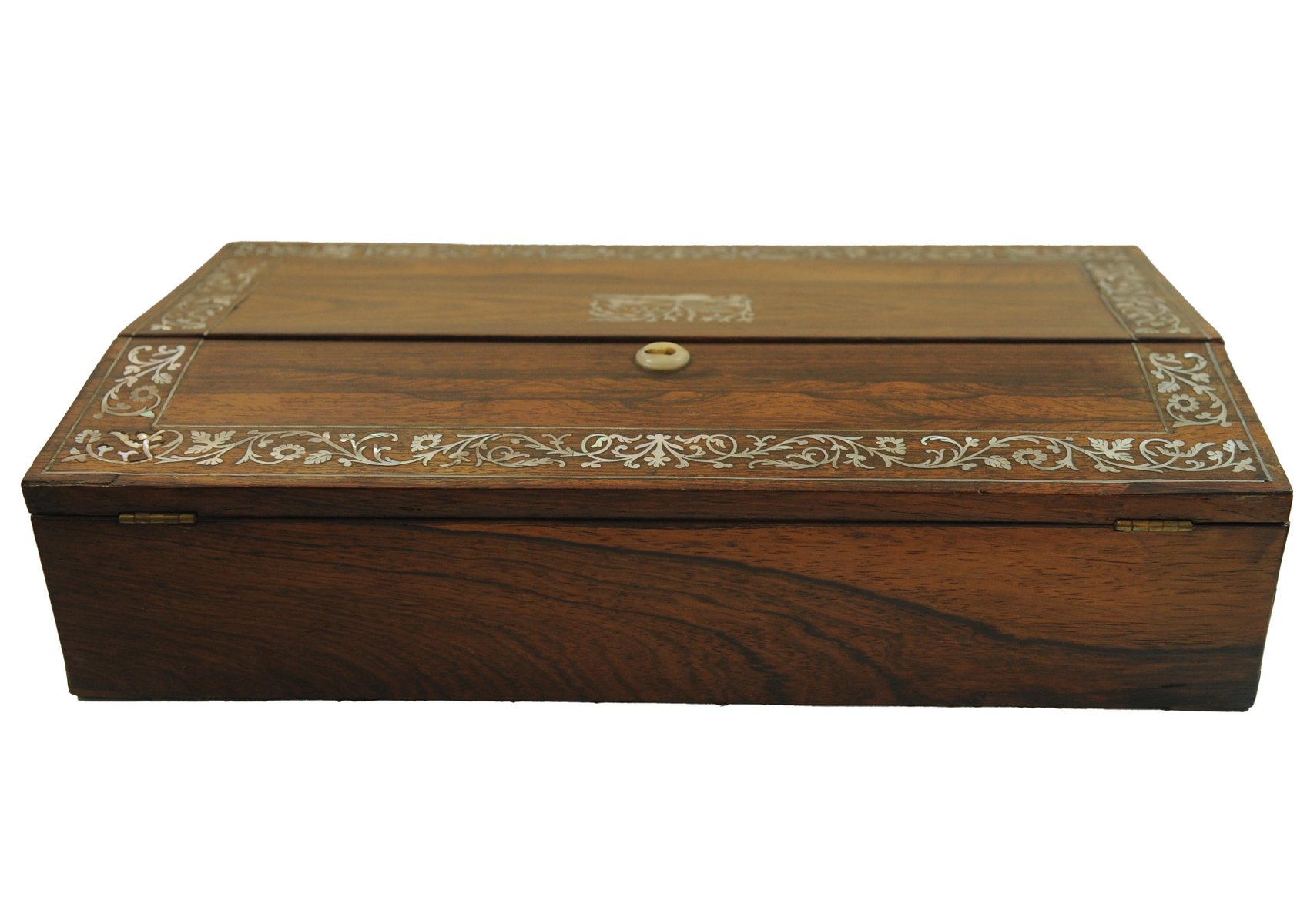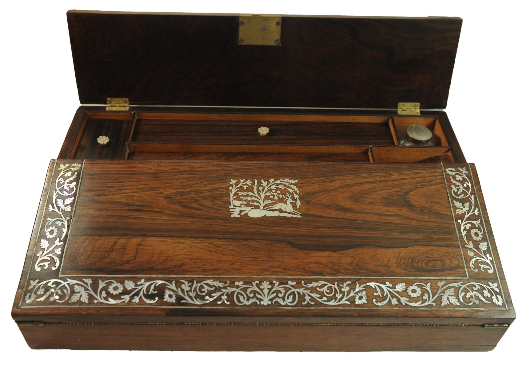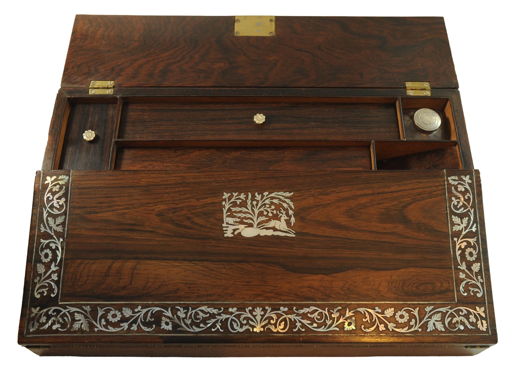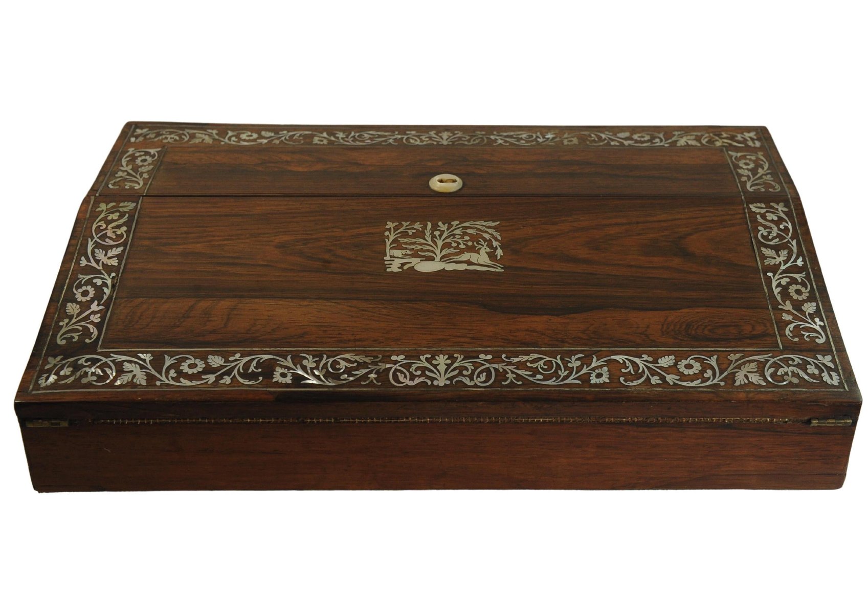 Rosewood Writing Slope with Floral Decor and Inlay, 19th Century, Set of 5