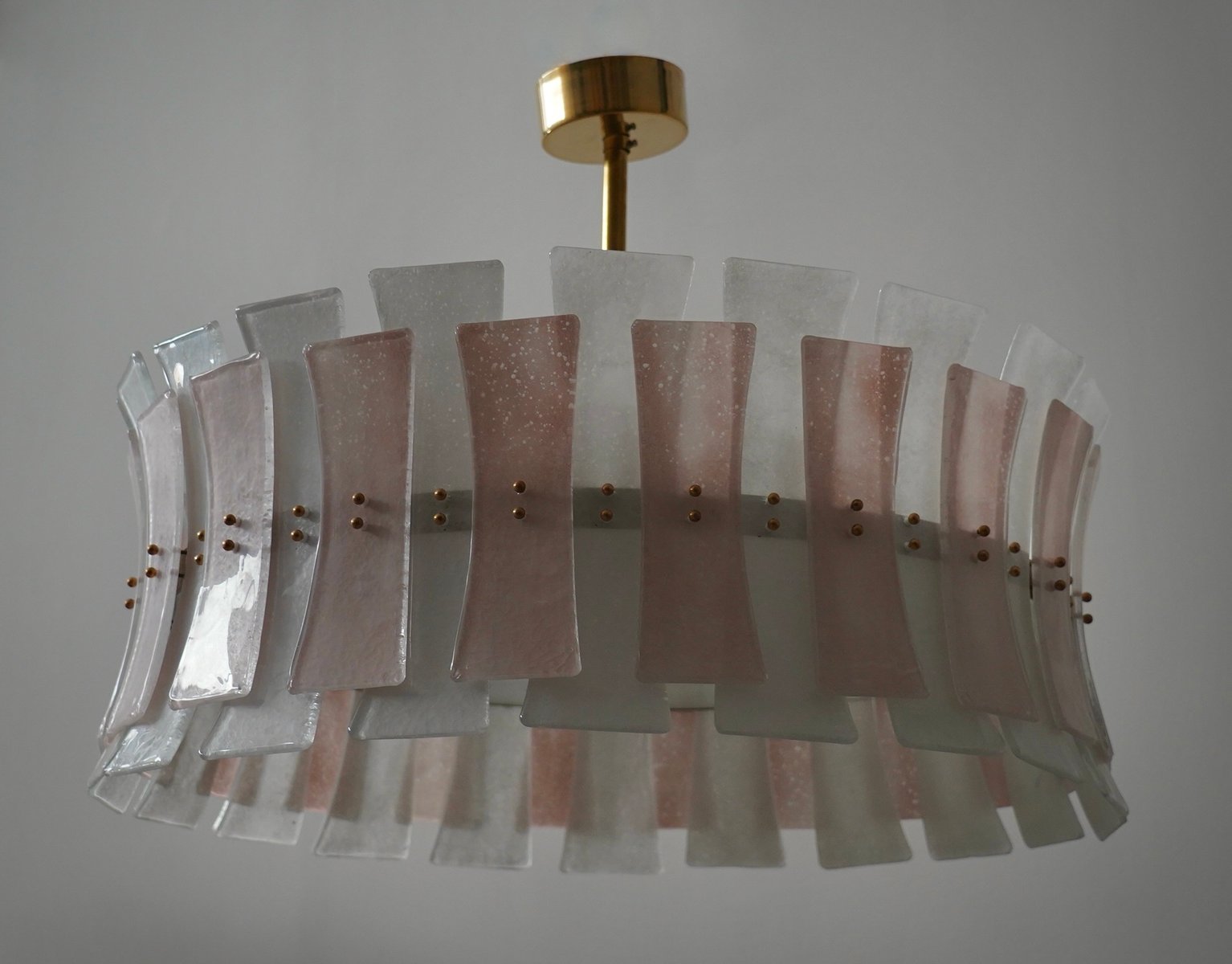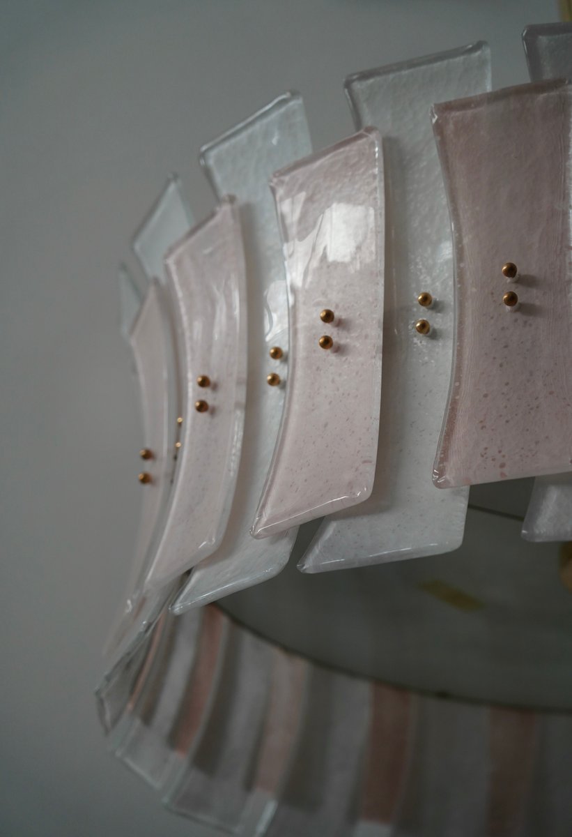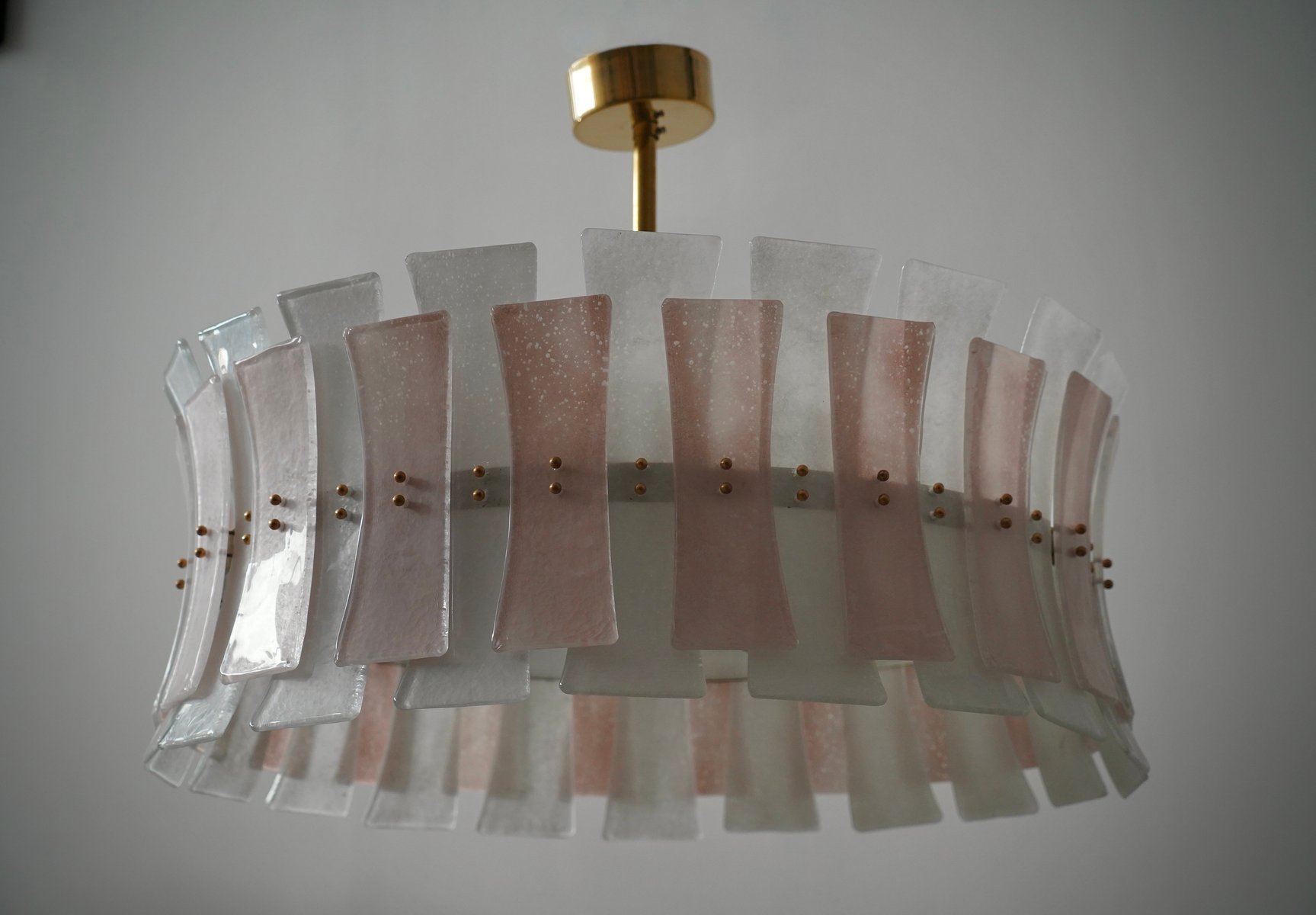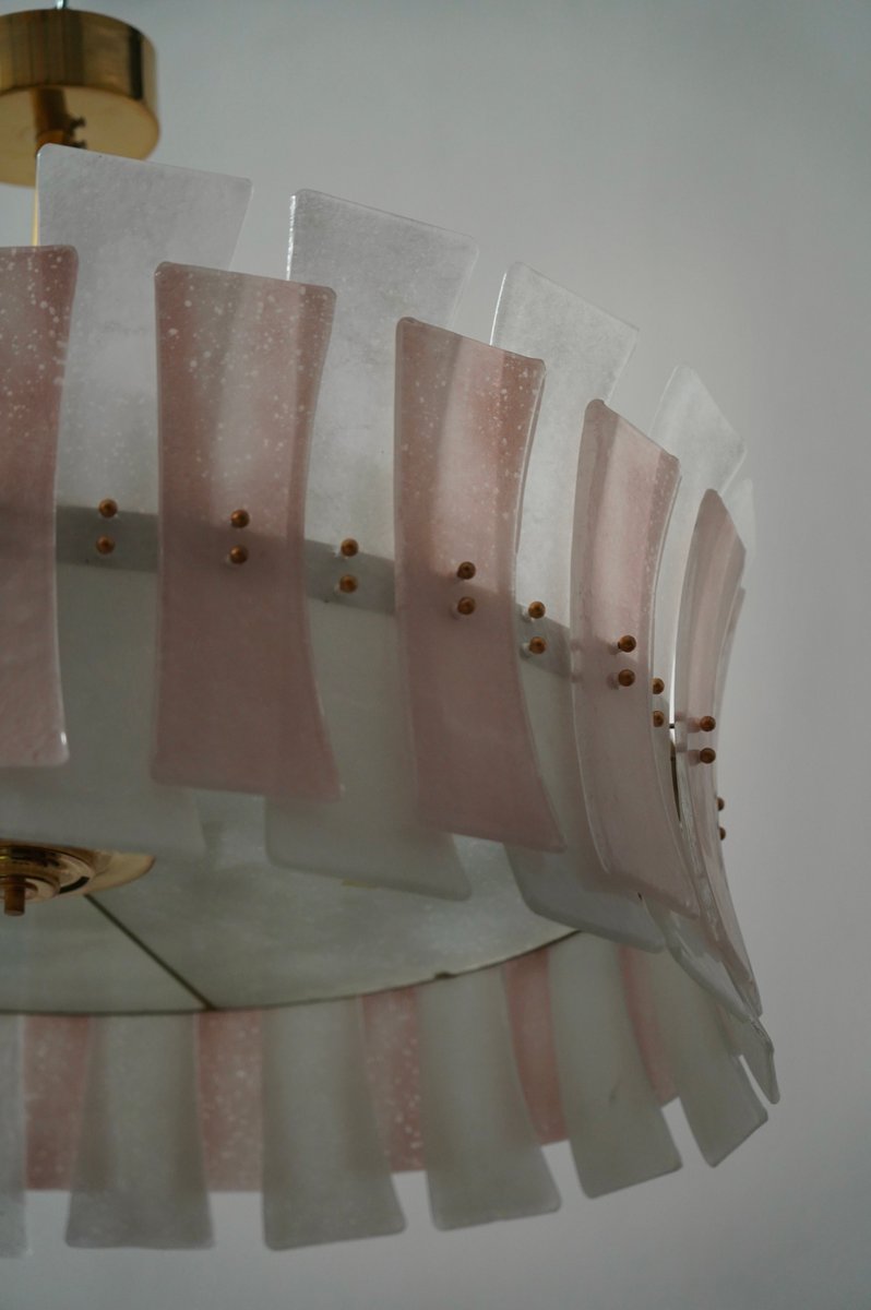 Round Pink and White Murano Glass and Brass Pendant, 2000