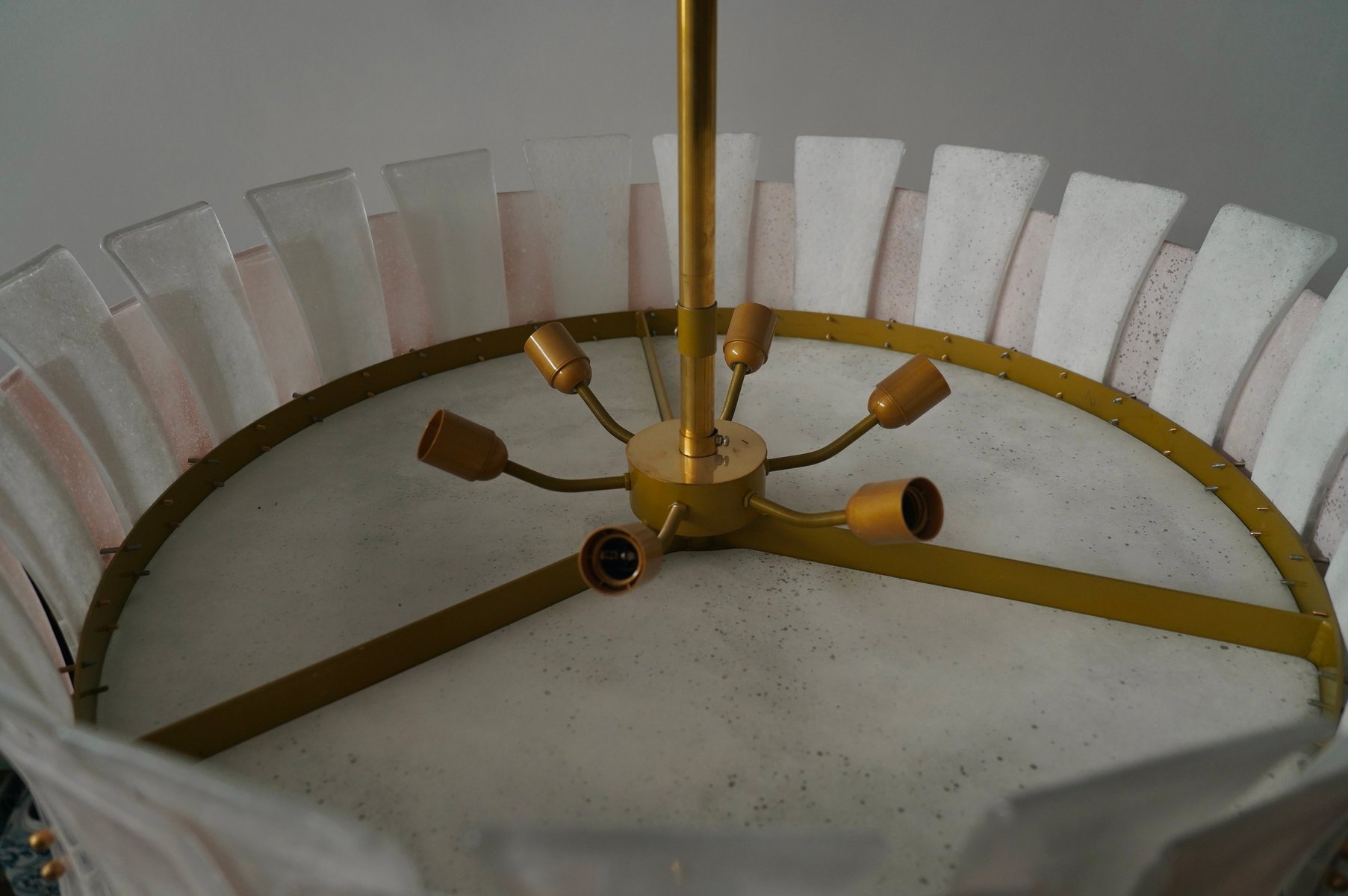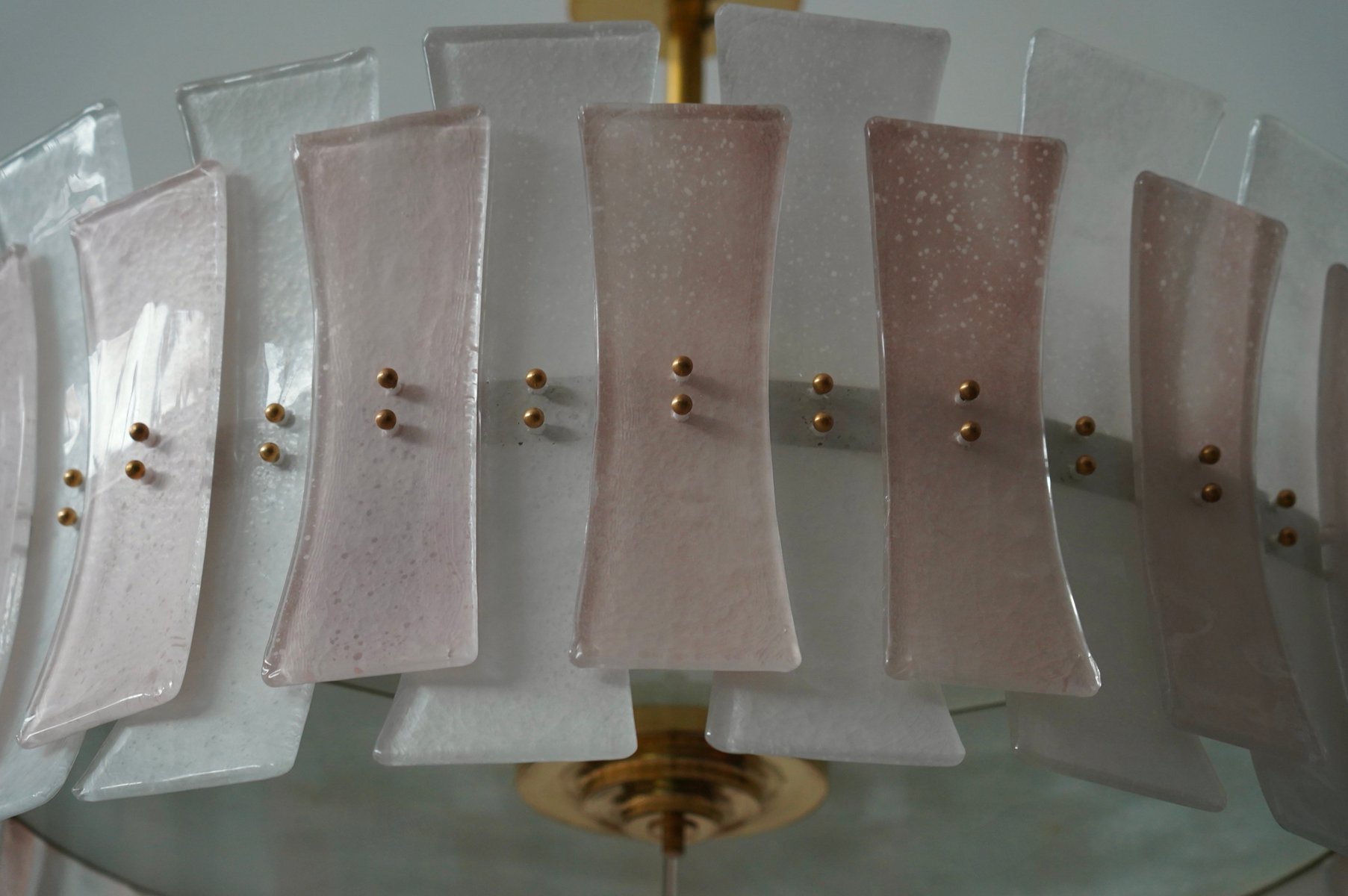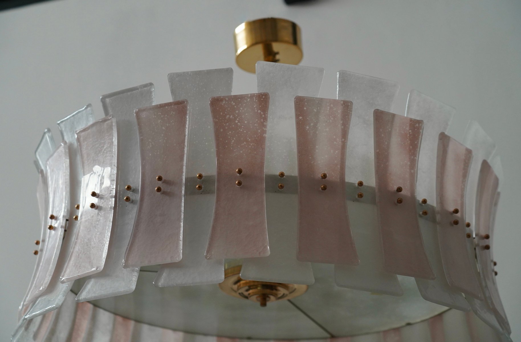 Round Pink and White Murano Glass and Brass Pendant, 2000