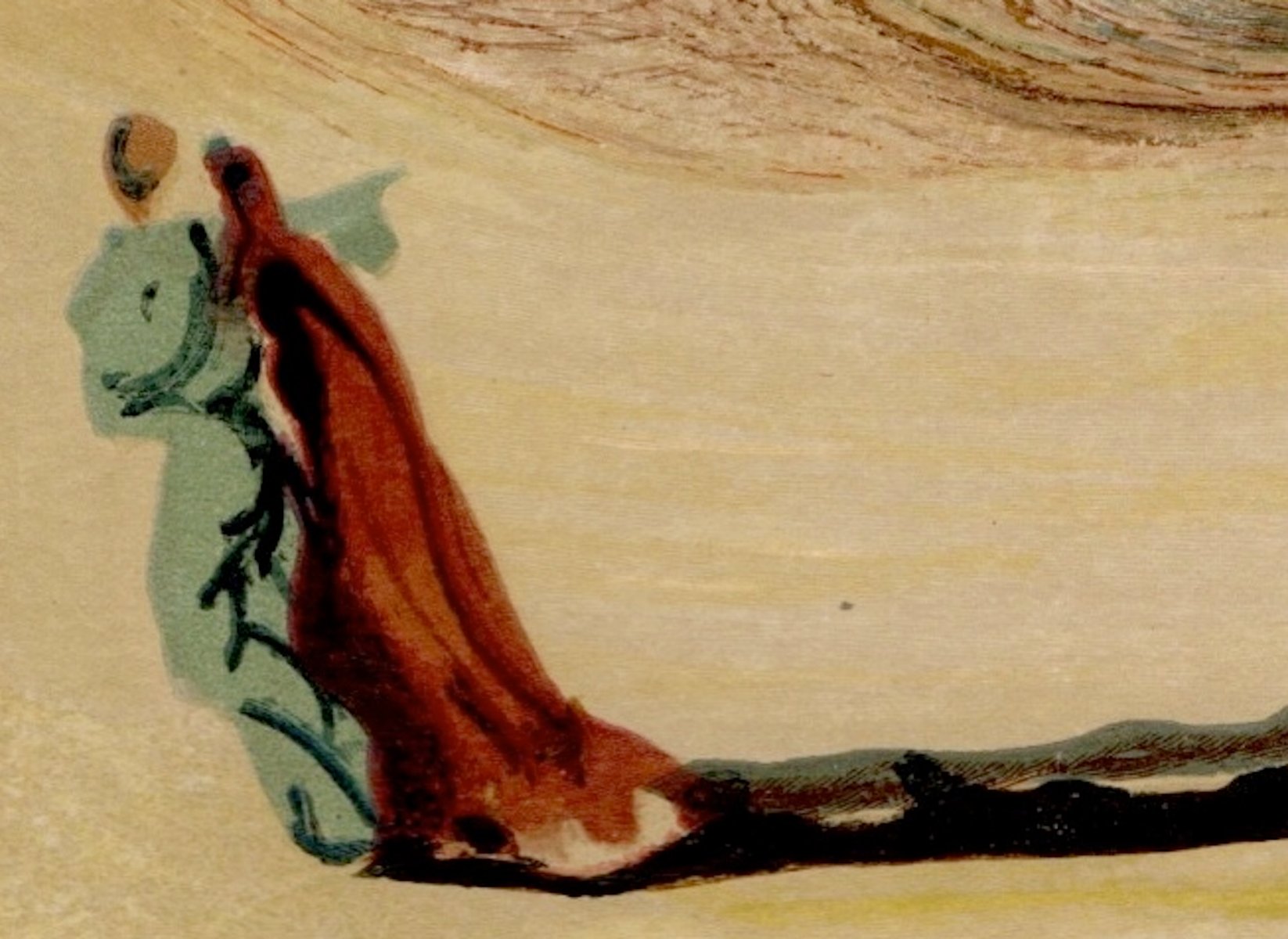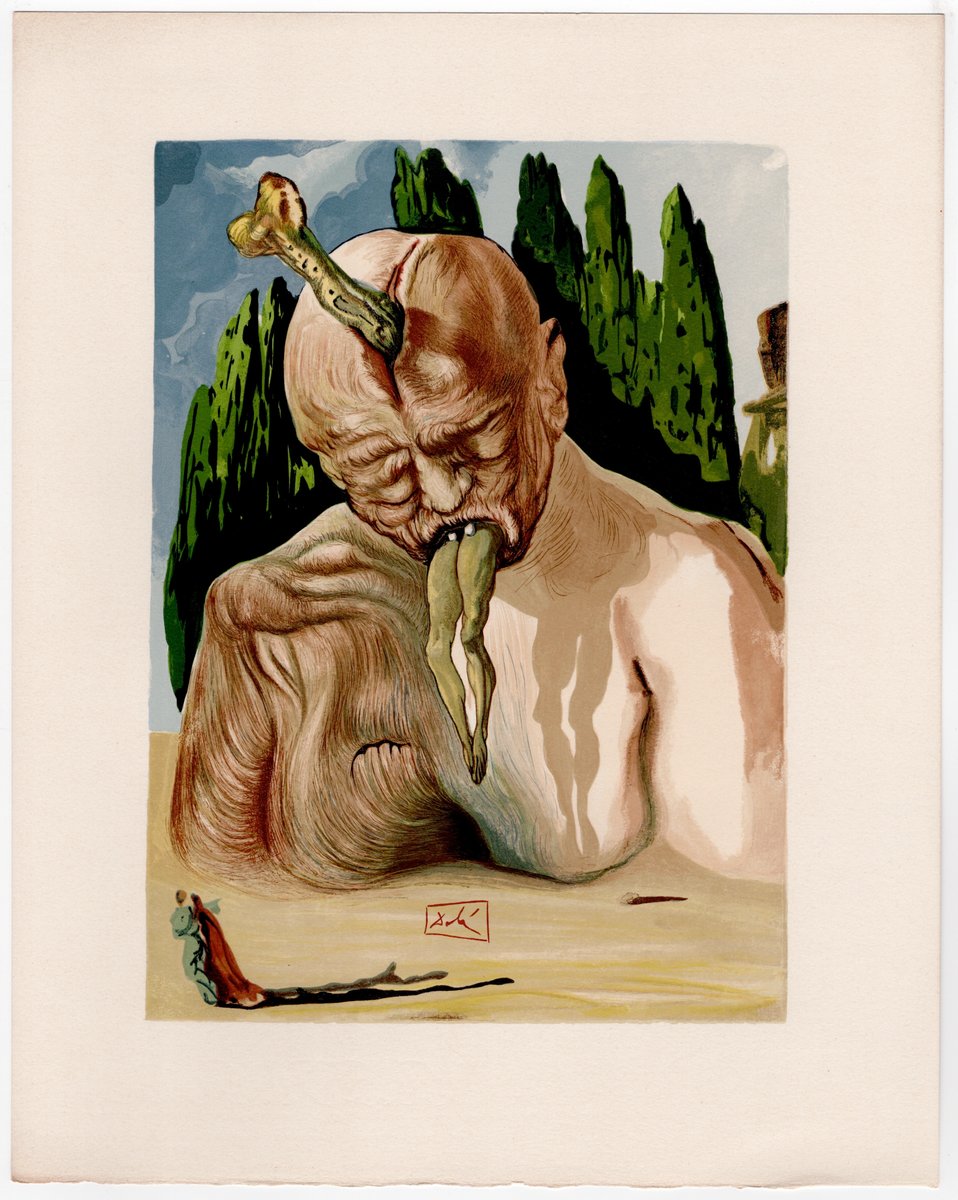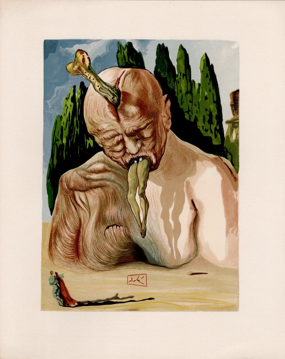 According to critics, Dalí illustrates Dante's journey through Hell, Purgatory, and Paradise by reinterpreting Dante's journey from a psychoanalytic perspective, placing a particularly significant character or event from the canto at the center of each panel. The representation is dreamlike and irreverent: Hell, Purgatory, and Paradise emerge suspended between dream and reality, in a single masterpiece, in which the elegance of the line is combined with a masterful use of color. The figuration is ironic, grotesque, and imaginative in the depictions of Hell and Purgatory, while the representations of Beatrice are delicate and celestial, as if the artist were on an imaginary journey within himself. The journey into Dante's afterlife is thus interpreted in a metaphysical and psychological key, masterfully blending the deepest meaning of the Divine Comedy with the artistic flair of Salvador Dalí, who maintains Dante's dreamy atmosphere while adding his unmistakable surrealist touch with the famous flaccid figures, crutches, rhinoceros horns, and flying bones.