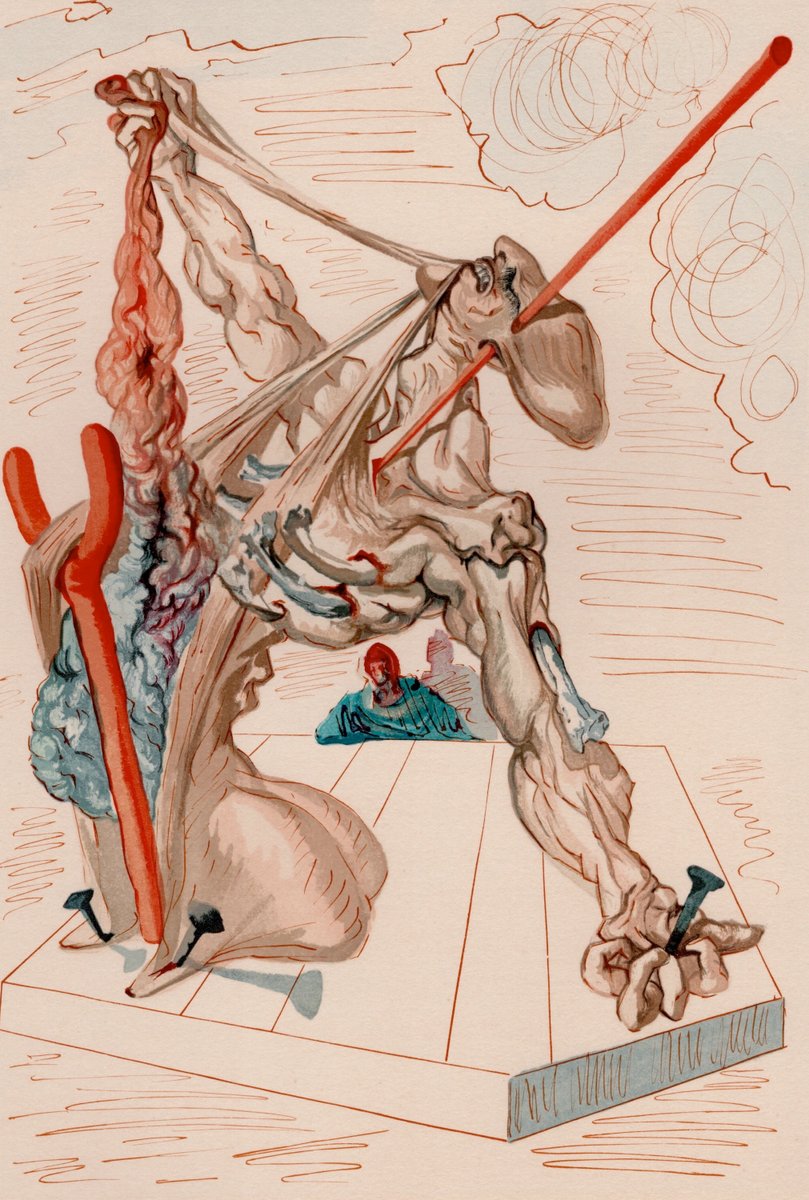 According to critics, Dalí illustrates Dante's journey through Hell, Purgatory, and Paradise by reinterpreting Dante's journey from a psychoanalytic perspective, placing a particularly significant character or event from the canto at the center of each panel. The representation is dreamlike and irreverent: Hell, Purgatory, and Paradise emerge suspended between dream and reality, in a single masterpiece, in which the elegance of the line is combined with a masterful use of color. The figuration is ironic, grotesque, and imaginative in the depictions of Hell and Purgatory, while the representations of Beatrice are delicate and celestial, as if the artist were on an imaginary journey within himself. The journey into Dante's afterlife is thus interpreted in a metaphysical and psychological key, masterfully blending the deepest meaning of the Divine Comedy with the artistic flair of Salvador Dalí, who maintains Dante's dreamy atmosphere while adding his unmistakable surrealist touch with the famous flaccid figures, crutches, rhinoceros horns, and flying bones.