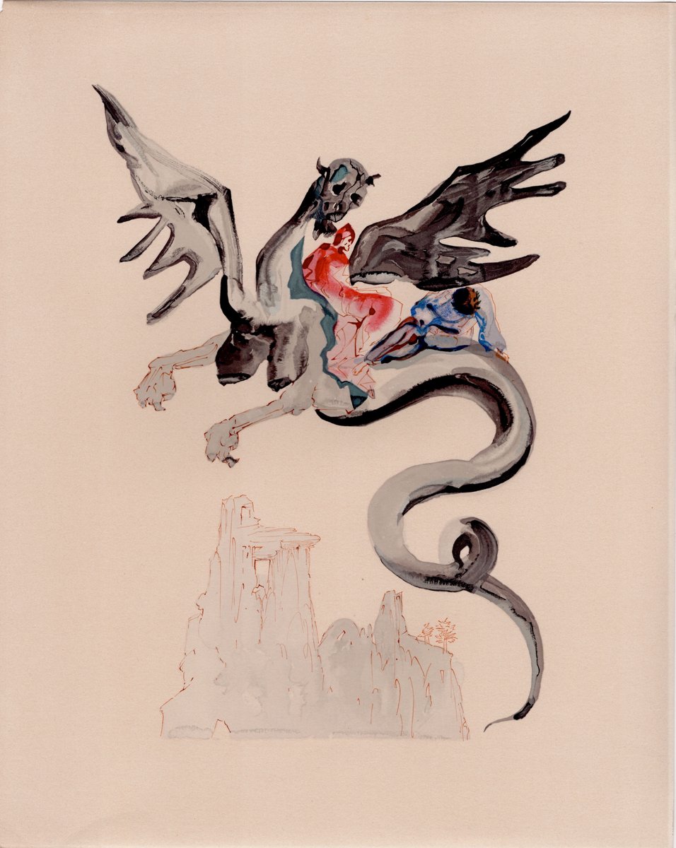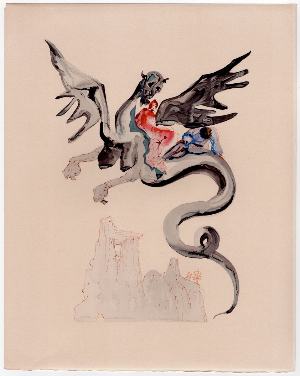 According to critics, Dalí illustrates Dante's journey through Hell, Purgatory, and Paradise by reinterpreting Dante's journey from a psychoanalytic perspective, placing a particularly significant character or event from the canto at the center of each panel. The representation is dreamlike and irreverent: Hell, Purgatory, and Paradise emerge suspended between dream and reality, in a single masterpiece, in which the elegance of the line is combined with a masterful use of color. The figuration is ironic, grotesque, and imaginative in the depictions of Hell and Purgatory, while the representations of Beatrice are delicate and celestial, as if the artist were on an imaginary journey within himself. The journey into Dante's afterlife is thus interpreted in a metaphysical and psychological key, masterfully blending the deepest meaning of the Divine Comedy with the artistic flair of Salvador Dalí, who maintains Dante's dreamy atmosphere while adding his unmistakable surrealist touch with the famous flaccid figures, crutches, rhinoceros horns, and flying bones.