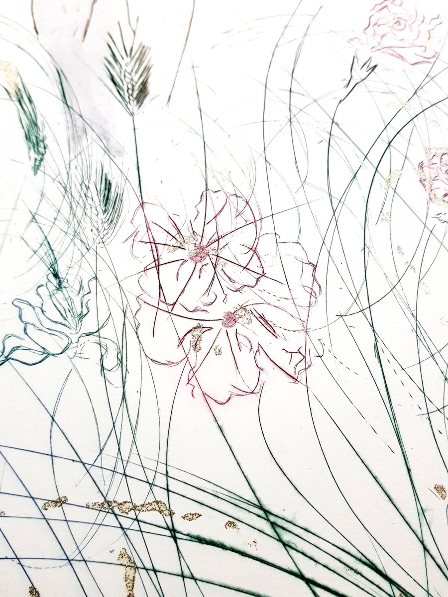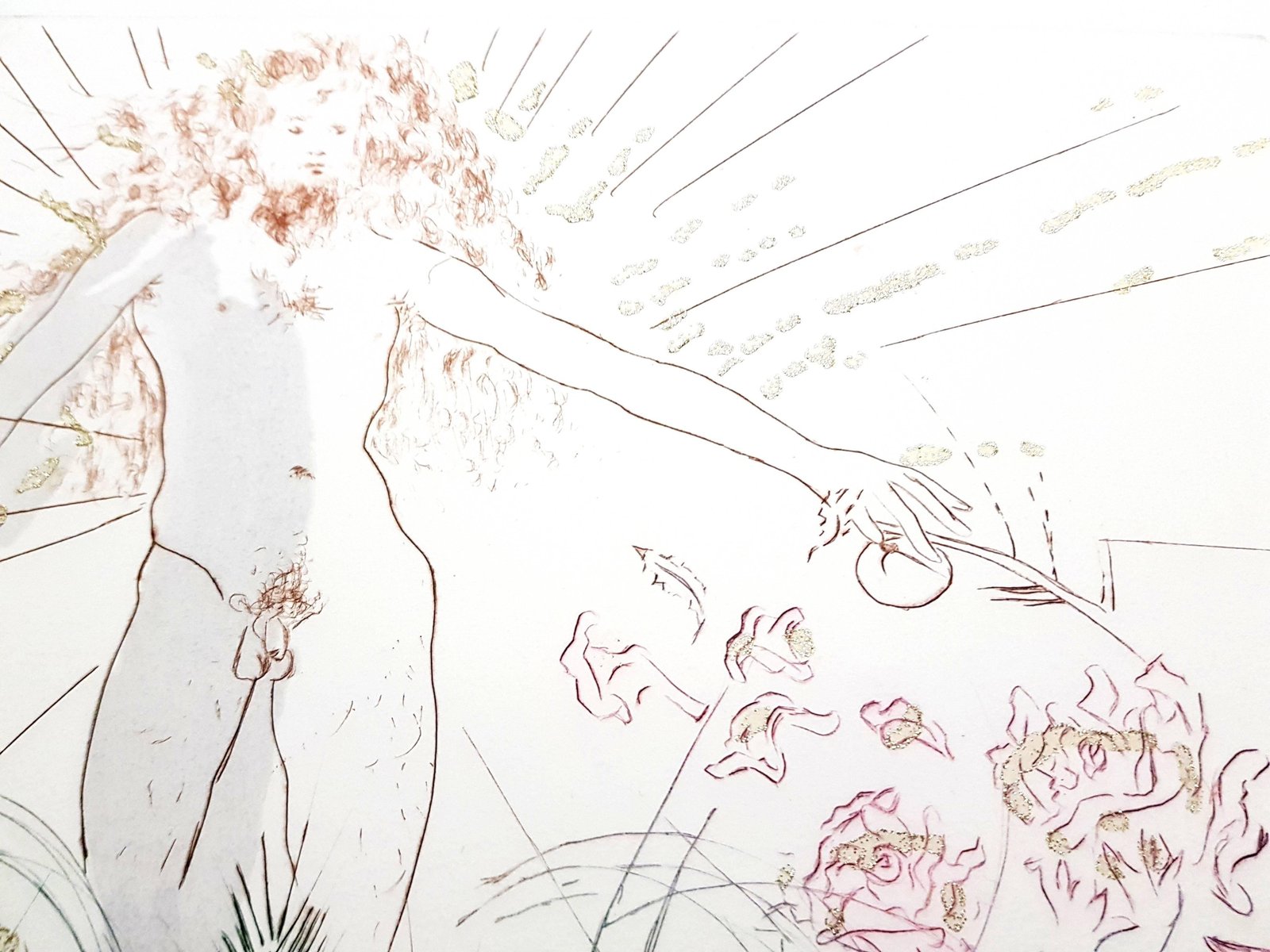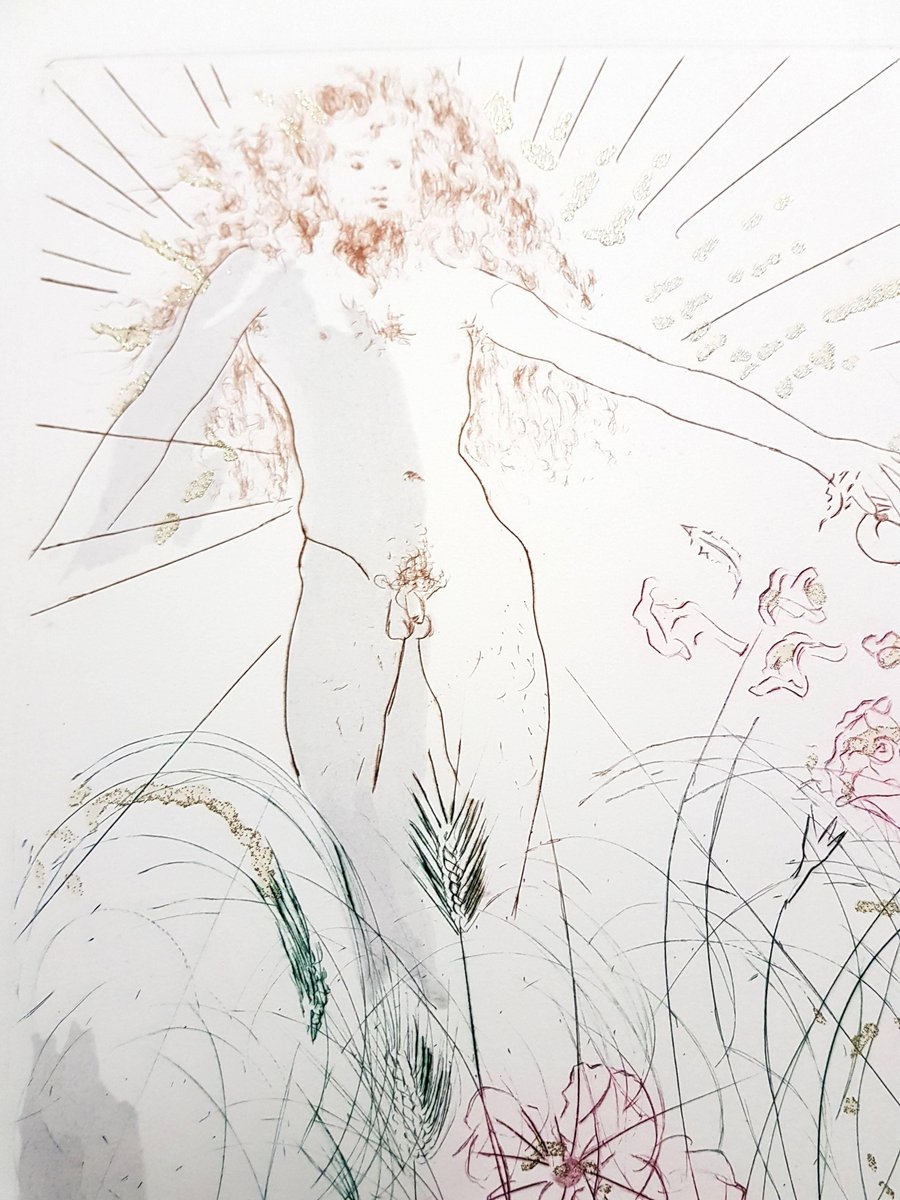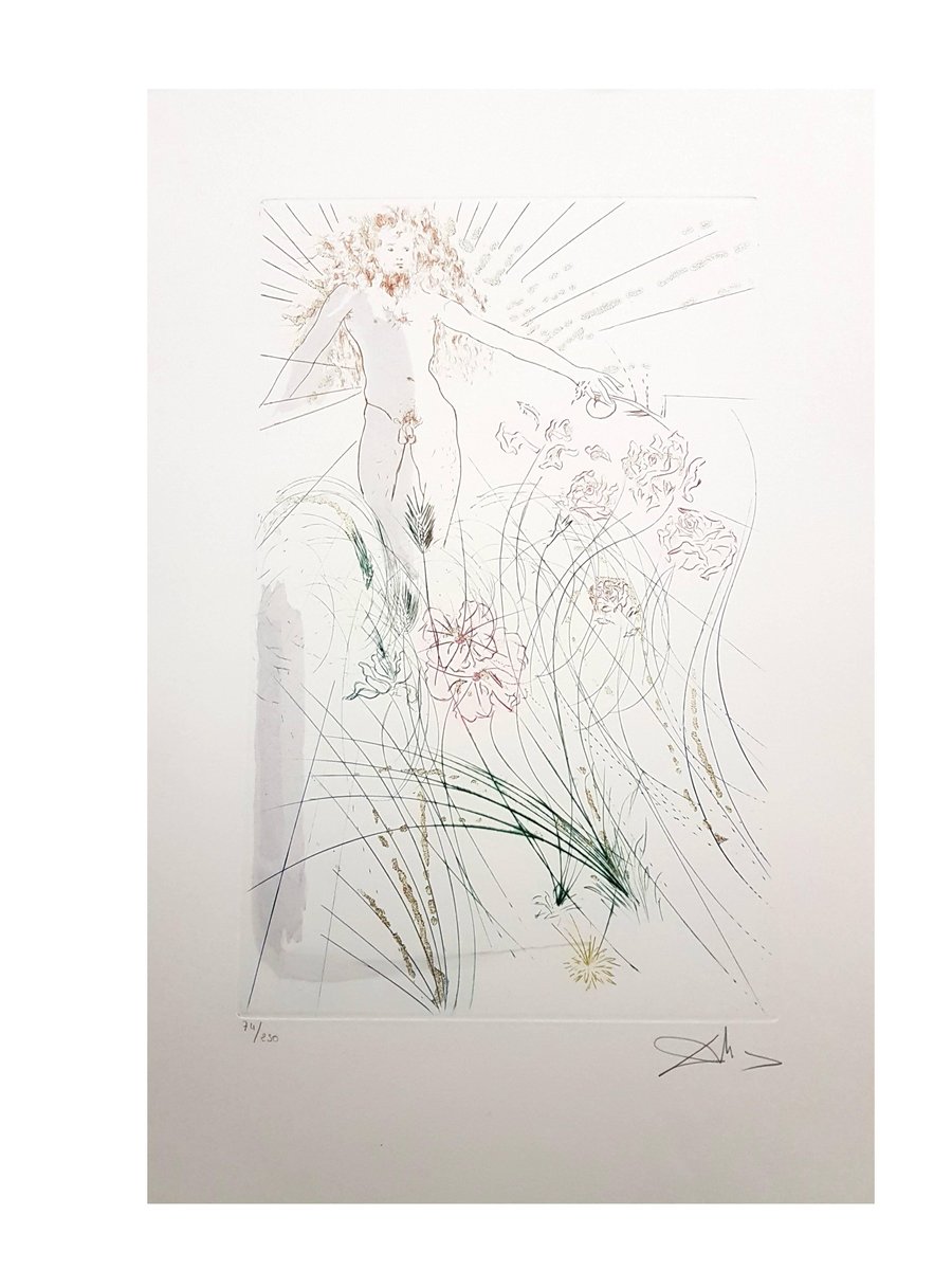 SALVADOR DALI (1904-1989) THE BELOVED FEEDS AMONG THE LILIES, 1971 Board for the series ''The Song of Songs hymns'' Aquatint and dry point on wove paper white stencilled and bronze ink golden by Jacomet Signed and numbered 74/250 56.5 x 38 cm Reference: Michler & Lopsinger, 477 Salvador Dali Salvador Dali was born as the son of a prestigious notary in the small town of Figueras in Northern Spain. His talent as an artist showed at an early age and Salvador Felipe Jacinto Dali received his first drawing lessons when he was ten years old. His art teachers were a then well known Spanish impressionist painter, Ramon Pichot and later an art professor at the Municipal Drawing School. In 1923 his father bought his son his first printing press. Dali began to study art at the Royal Academy of Art in Madrid. He was expelled twice and never took the final examinations. His opinion was that he was more qualified than those who should have examined him. In 1928 Dali went to Paris where he met the Spanish painters Pablo Picasso and Joan Miro. He established himself as the principal figure of a group of surrealist artists grouped around Andre Breton, who was something like the theoretical ''schoolmaster'' of surrealism. Years later Breton turned away from Dali accusing him of support of fascism, excessive self-presentation and financial greediness. By 1929 Dali had found his personal style that should make him famous the world of the unconscious that is recalled during our dreams. The surrealist theory is based on the theories of the psychologist Dr. Sigmund Freud. Recurring images of burning giraffes and melting watches became the artist's surrealist trademarks. His great craftsmanship allowed him to execute his paintings in a nearly photo-realistic style. No wonder that the artist was a great admirer of the Italian Renaissance painter Raphael. Salvador Dali and Gala. Meeting Gala was the most important event in the artist's life and decisive for his future career. She was a Russian immigrant and ten years older than Dali. When he met her, she was married to Paul Eluard. Gala decided to stay with Dali. She became his companion, his muse, his sexual partner, his model in numerous art works and his business manager. For him she was everything. Most of all Gala was a stabilizing factor in his life. And she managed his success in the 1930s with exhibitions in Europe and the United States. Gala was legally divorced from her husband in 1932. In 1934 Dali and Gala were married in a civil ceremony in Paris and in 1958 in church after Gala's former husband had died in 1952. However from around 1965 on, the couple was seen less frequently together. But Gala continued to manage Dali's business affairs. 1933 Salvador Dali had his first one-man show in New York. One year later he visited the U.S. for the first time supported by a loan of US$500 from Pablo Picasso. To evade World War II, Dali chose the U.S.A. as his permanent residence in 1940. He had a series of spectacular exhibitions, among others a great retrospective at the Museum of Modern Art in New York. Besides creating a number of great paintings, Dali caused the attention of the media by playing the role of a surrealist clown. He made a lot of money and was contemptuously nicknamed Avida Dollars (greedy for dollars) by Andre Breton. Dali became the darling of the American High Society. Celebrities like Jack Warner or Helena Rubinstein gave him commissions for portraits. His art works became a popular trademark and besides painting he pursued other activities - jewelry and clothing designs for Coco Chanel or film making with Alfred Hitchcock. The Classic Period After World War II In 1948 Dali and Gala returned to Europe, spending most of their time either in their residence in Lligat or Spain or in Paris or France or in New York. Dali developed a lively interest in science, religion and history. He integrated things into his art that he had picked up from popular science magazines. Another source of inspiration were the great classical masters of painting like Raphael, Velasquez or the French painter Ingres. The artist commented his shift in style with the words: ''To be a surrealist forever is like spending your life painting nothing but eyes and noses.'' In 1958 the artist began his series of large sized history paintings. He painted one monumental painting every year during the summer months in Lligat. The most famous one, The Discovery of America by Christopher Columbus, can be seen at the Dali Museum in St. Petersburg in Florida. It is breath-taking. The artist's late art works combine more than ever his perfect and meticulous painting technique with his fantastic and limitless imaginations. Salvador Dali is the only known artist who had two museums dedicated exclusively to his works at lifetime. Dali Museum in St. Petersburg, Florida The Dali Museum in St. Petersburg in Florida or U.S.A. was founded in 1971 by the Dali collector A. Reynolds Morse and his wife Eleanor. The collection was first exhibited in a building adjacent to their home in Cleveland/Ohio. In 1982, the museum was moved to St. Petersburg in Florida. It hosts 95 oil paintings including six of Dali's eighteen large-sized historical paintings. Dali Museum-Theater in Figueres, Spain. The Dali Museum-Theater in Figueres, Spain was the former Municipal Theater of Figueres. In 1918, when Salvador Dali was only fourteen years old, it had shown his first public exhibition. Since 1970 the artist had dedicated his energy to transform the former Municipal Theater into a museum and art gallery. In 1974 the Theatro Museo Dali was officially opened. 1980 Dali was forced to retire due to palsy, a motor disorder, that caused a permanent trembling and weakness of his hands. He was not able to hold a brush any more. The fact that he could not follow his vocation and passion of painting and the news of Gala's death in 1982 left him with deep depressions. After Gala's death he moved to Pubol, a castle, h