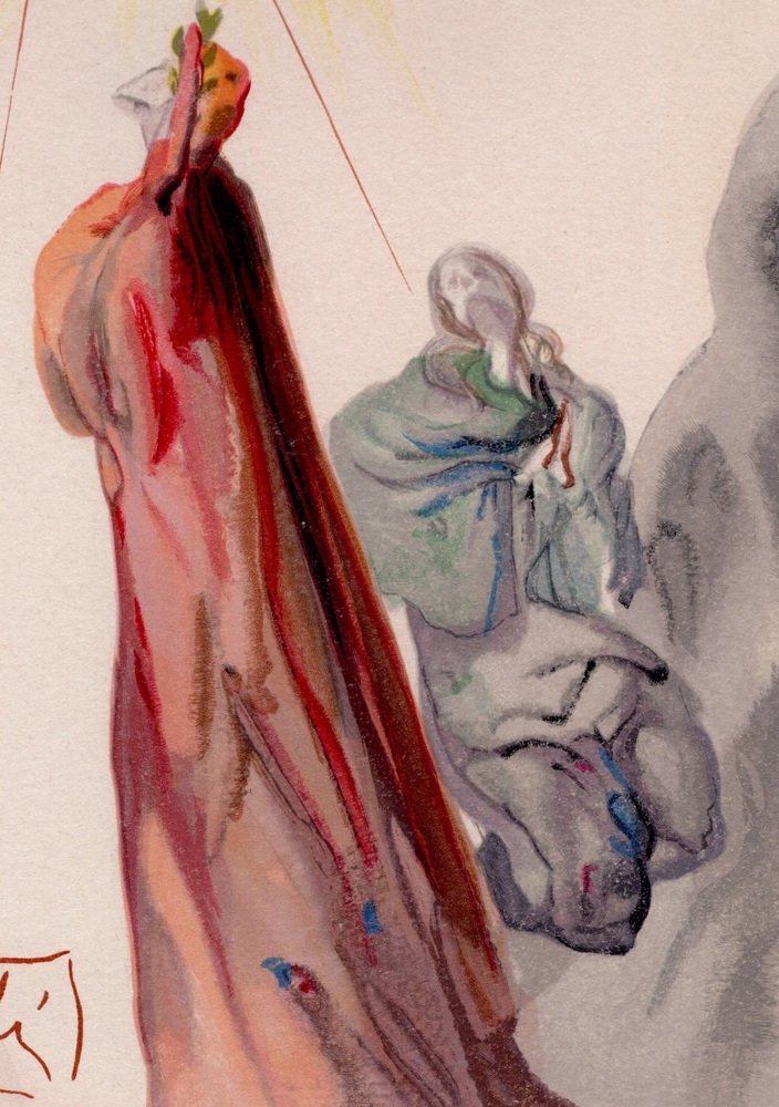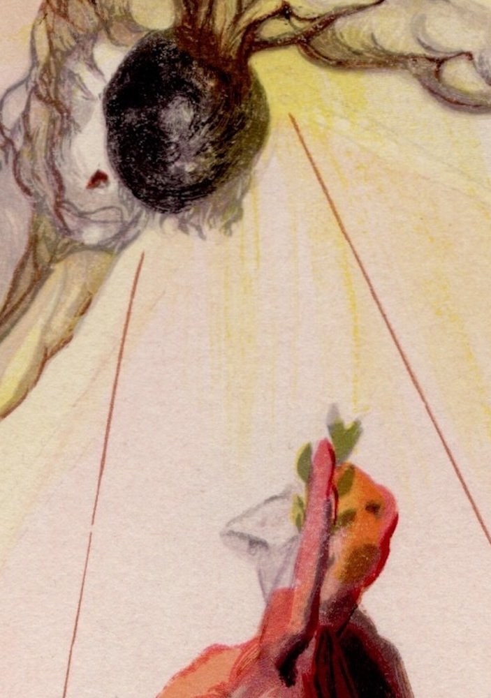 According to critics, Dalí illustrates Dante's journey through Hell, Purgatory, and Paradise by reinterpreting Dante's journey from a psychoanalytic perspective, placing a particularly significant character or event from the canto at the center of each panel. The representation is dreamlike and irreverent: Hell, Purgatory, and Paradise emerge suspended between dream and reality, in a single masterpiece, in which the elegance of the line is combined with a masterful use of color. The figuration is ironic, grotesque, and imaginative in the depictions of Hell and Purgatory, while the representations of Beatrice are delicate and celestial, as if the artist were on an imaginary journey within himself. The journey into Dante's afterlife is thus interpreted in a metaphysical and psychological key, masterfully blending the deepest meaning of the Divine Comedy with the artistic flair of Salvador Dalí, who maintains Dante's dreamy atmosphere while adding his unmistakable surrealist touch with the famous flaccid figures, crutches, rhinoceros horns, and flying bones.