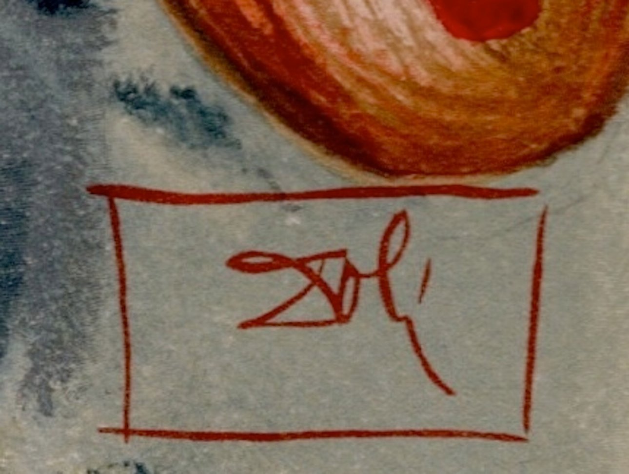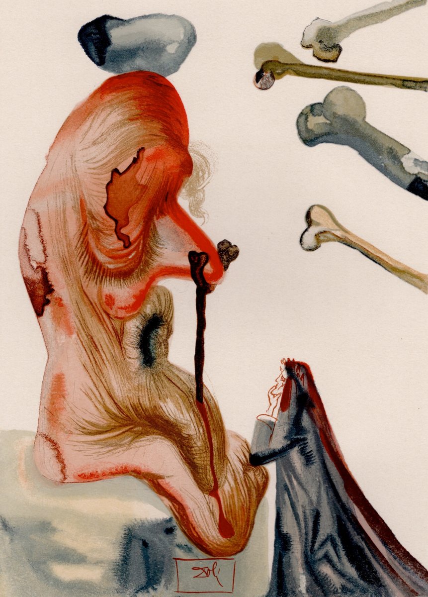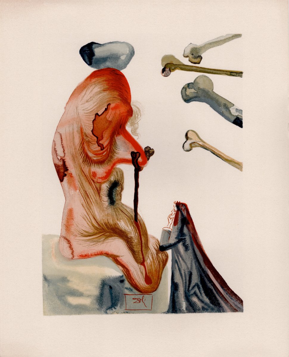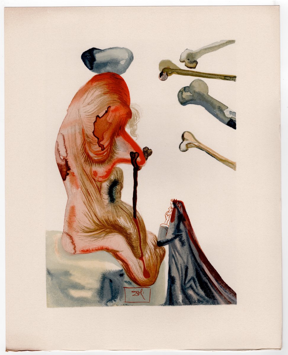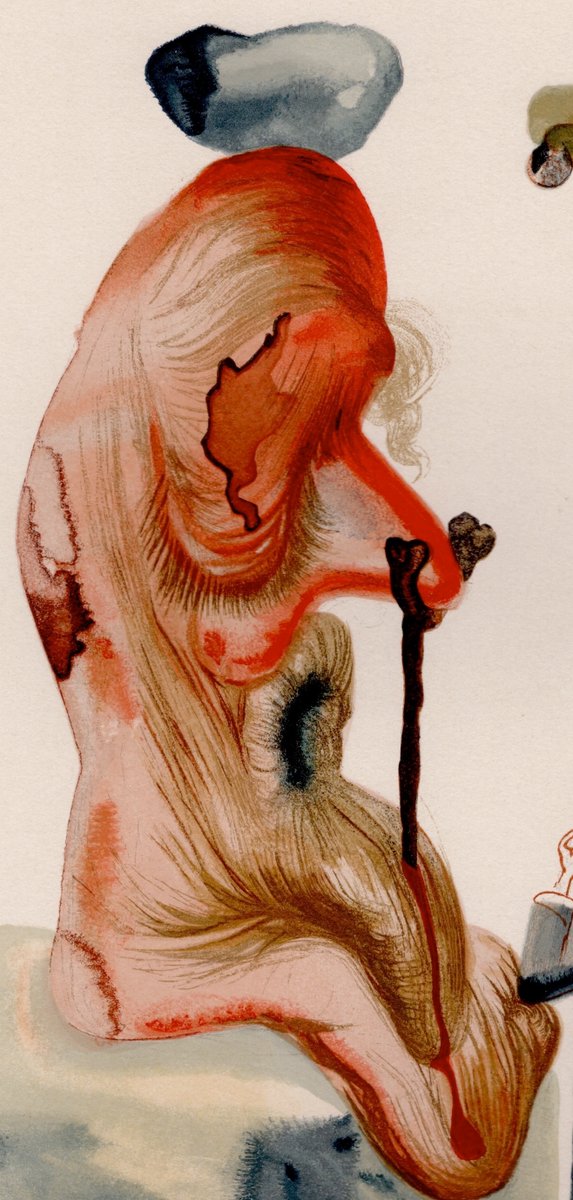 According to critics, Dalí illustrates Dante's journey through Hell, Purgatory, and Paradise by reinterpreting Dante's journey from a psychoanalytic perspective, placing a particularly significant character or event from the canto at the center of each panel. The representation is dreamlike and irreverent: Hell, Purgatory, and Paradise emerge suspended between dream and reality, in a single masterpiece, in which the elegance of the line is combined with a masterful use of color. The figuration is ironic, grotesque, and imaginative in the depictions of Hell and Purgatory, while the representations of Beatrice are delicate and celestial, as if the artist were on an imaginary journey within himself. The journey into Dante's afterlife is thus interpreted in a metaphysical and psychological key, masterfully blending the deepest meaning of the Divine Comedy with the artistic flair of Salvador Dalí, who maintains Dante's dreamy atmosphere while adding his unmistakable surrealist touch with the famous flaccid figures, crutches, rhinoceros horns, and flying bones.