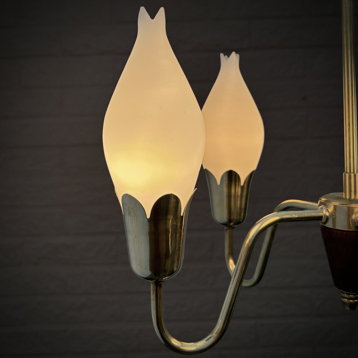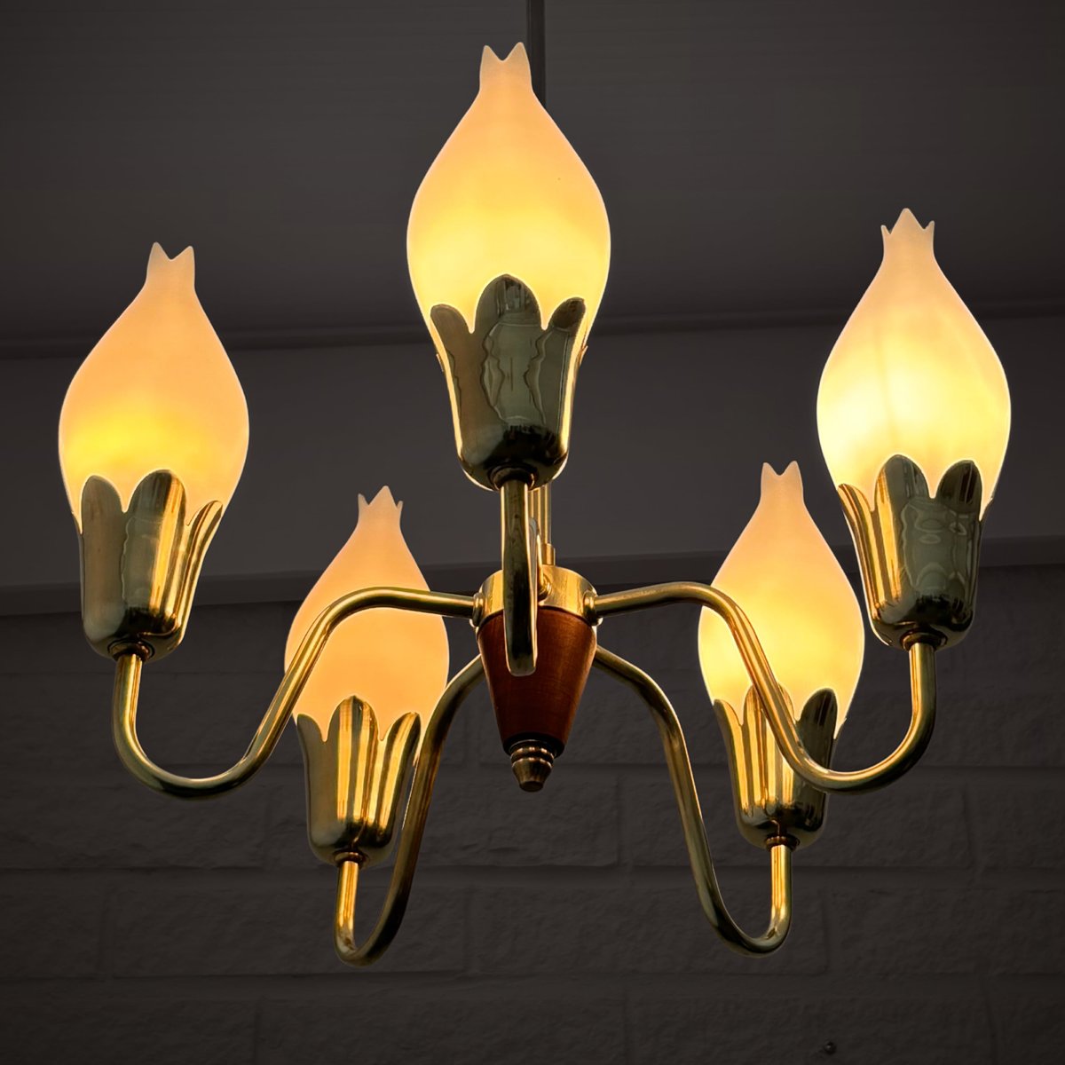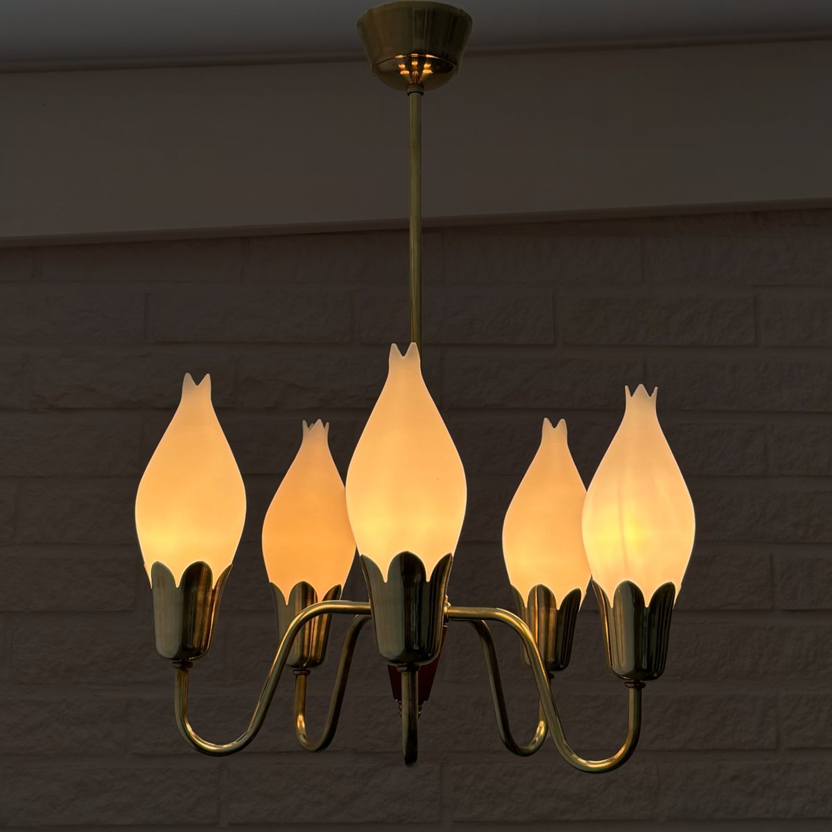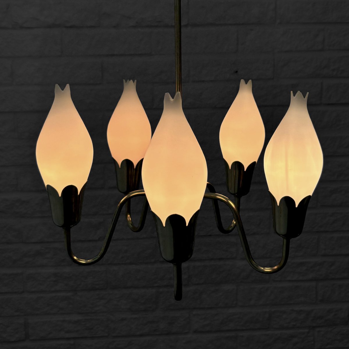 Scandinavian Tulip Chandelier in Brass and Glass from Fog & Mørup, 1950s