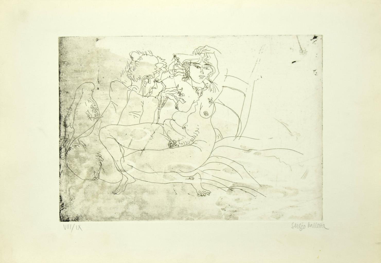 The Couple is an original etching realized by Sergio Barletta in 1975 ca. Hand-signed on the lower right in pencil. Numbered in Roman numerals, edition of VIII/IX prints, on the lower left in pencil. In very good conditions. Image Dimensions: 24 x 34 cm The artwork represents a nude couple lying down through confident and quick strokes. Created skillfully through confident strokes in a well-balanced composition. Sergio Barletta (1934) is an Italian cartoonist and illustrator, who has also published some humorous and political satire books. From the age of 22 is active in Rome, where he worked as an illustrator and art director in some monthly magazines like “Costume”, Diners Club house organ, BP Review, IBM, and others. In 1965 started the joint-working with Marino Gallery in Rome, and in 1966 in Milan with Humour Graphics group, at Levi Gallery and others in the following years. In these years graphic work and illustration are mixed with painting and photography, also with satirical drawings for Rinascita, weekly of the Italian communist party; Azione Sociale, weekly of ACLI Catholic Workers Association; movie posters, advertising for Gucci, some writings for Popular Photography Italiana, lay-outs, writings and illustrations for Avinews, bimonthly for tour operators and so on. During the eighties he starts a long co-operation with satirical weekly “Il Sale”, complemented by a book with Ottaviano edizioni in Milan and others publications in Turin and Rome, all of satirical drawings. In this period he collaborates with Linus, the most important Italian comics monthly, and Harakiri, a humour weekly published in France. Personal and group exhibitions of paintings, collages, drawings, photographs Galleria Marino – Roma, 1965 Galleria Levi – Milano, 1966 Galleria Petronio – Bologna, 1967 Galleria d’arte moderna Villa Reale – Milano, 1967 Palazzo Costanzi – Trieste, 1967 Galleria del Naviglio – Milano, 1967 Galleria Marino – Roma, 1967 Galleria Libreria Renzo Cortina – Milano, 1968 Galleria Libreria Renzo Cortina – Milano, 1969 Society Art’s Club – Messina, 1970 Galleria Marino – Roma, 1970 Galleria Libreria Renzo Cortina – Milano, 1972 Galleria Marino – Roma, 1972 Galleria Il Diaframma – Milano, 1973 Galleria Libreria Renzo Cortina – Milano, 1974 Galleria Il Ventaglio – Firenze, 1975 Galleria Marino – Roma, 1975 Palazzo Gonfalonieri – Milano, 1976 Bedford House Gallery – London, 1977 Galleria Apicella – Bonn, 1979 Civico Museo Archeologico – Milano, 1980 Palazzo Barberini – Roma, 1981 Palazzo delle Stelline – Milano, 1981 Castello Sforzesco Biblioteca Trivulziana – Milano, 1982 Civico Museo Archeologico – Milano, 1983 Biblioteca Sormani – Milano, 1983 Club Migros – Milano, 1985 Centrodomus – Milano, 1985 Galleria Vittorio Emanuele – Milano, 1988 Galleria d’Arte ex libris – Roma, 1989 Civico Museo Archeologico – Milano, 1989 Palazzo delle Stelline – Milano, 1990 Palazzo d’Arte – triennale Milano, 1991 Galleria Molica Guid’Arte – Roma, 1991 Molica Gallery, West Broadway – New York, 1991 Civico Museo Archeologico – Milano, 1992 Palazzo Mediceo – Serravezza, 1994 Lalit Kala Akademi – New Delhi, 2005 Birla Academy of Art and Culture – Calcutta, 2005 Galleria Marino – Roma, 2011