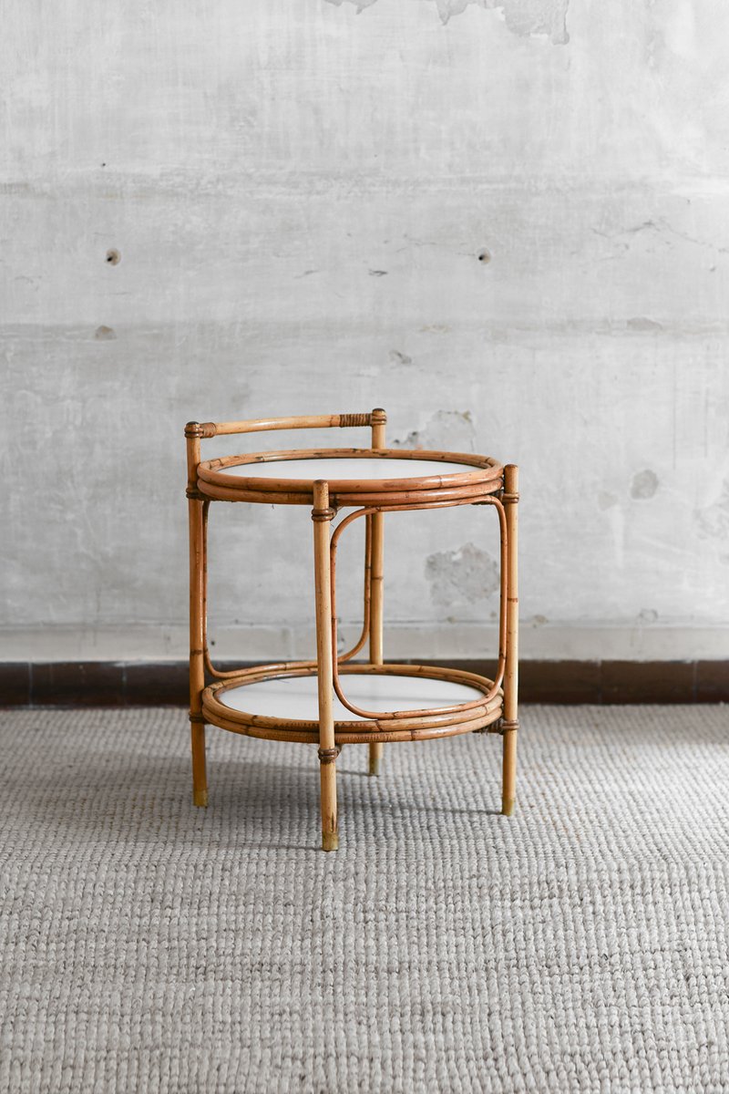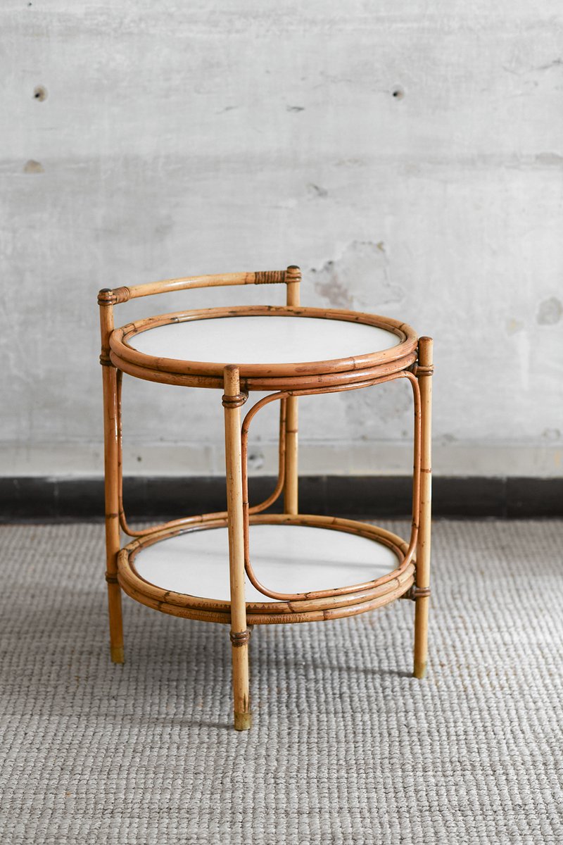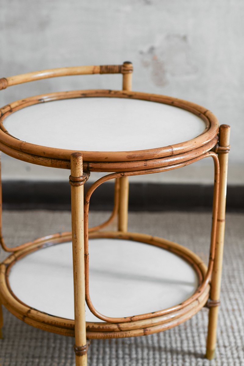 Service Table in Bamboo with White Lacquered Shelves and Brass Feet, 1970