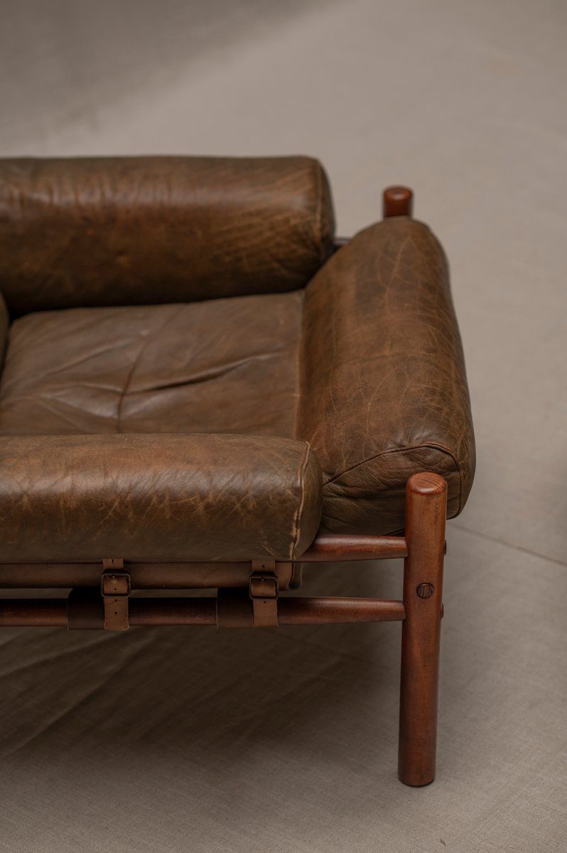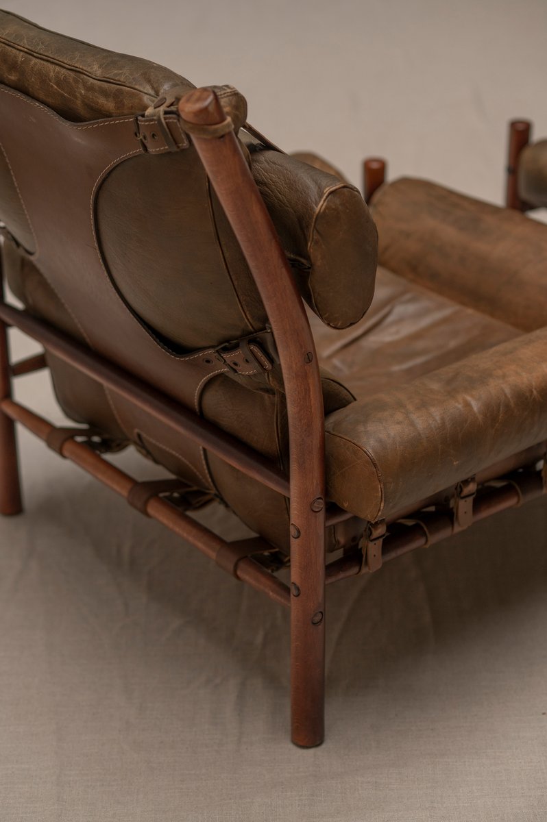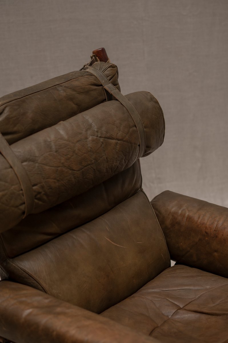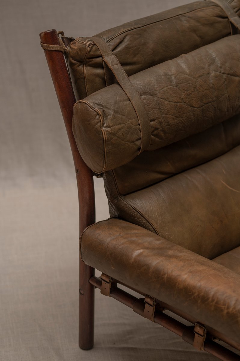 Norell is often praised for pioneering “conceptual” furniture, because he employed traditional materials—leather, turned wood, bentwood, and metal, for example—in unexpected forms, often with lyrical results. His designs have an affinity with those of Danish designer Kaare Klint (1888-1954), who, a generation before, brought time-honored, vernacular forms into modernist expression. In fact, Klint’s iconic Safari Chair (1933) inspired Norell to create the Sirocco Safari Chair (1964), which is lightweight, collapsible, and held together by leather support straps instead of glue or screws. Norell’s wood-framed Inka Armchair, Indra Sofa, and Ilona Sofa (design dates unverified) are likewise held together by leather.