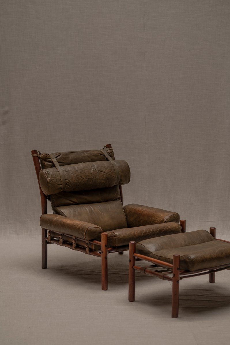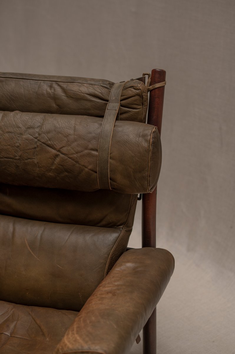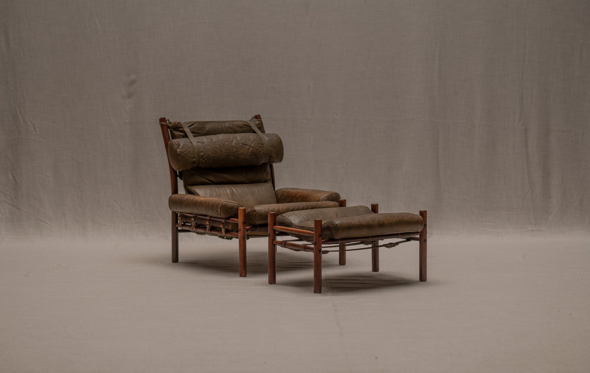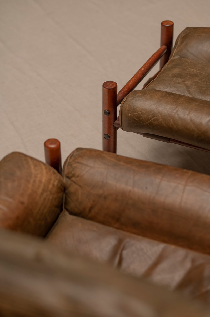 Norell is often praised for pioneering “conceptual” furniture, because he employed traditional materials—leather, turned wood, bentwood, and metal, for example—in unexpected forms, often with lyrical results. His designs have an affinity with those of Danish designer Kaare Klint (1888-1954), who, a generation before, brought time-honored, vernacular forms into modernist expression. In fact, Klint’s iconic Safari Chair (1933) inspired Norell to create the Sirocco Safari Chair (1964), which is lightweight, collapsible, and held together by leather support straps instead of glue or screws. Norell’s wood-framed Inka Armchair, Indra Sofa, and Ilona Sofa (design dates unverified) are likewise held together by leather.