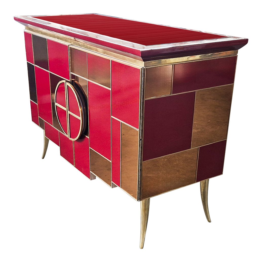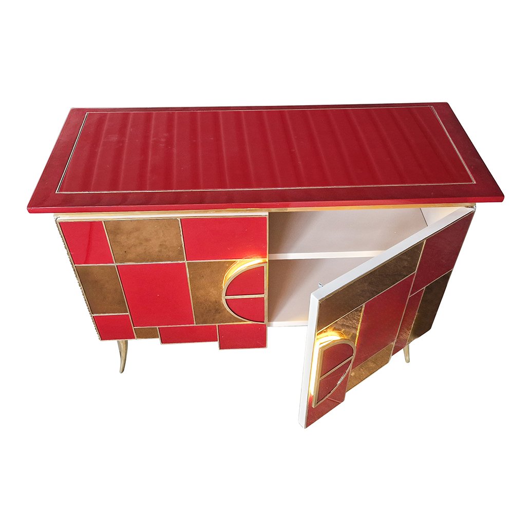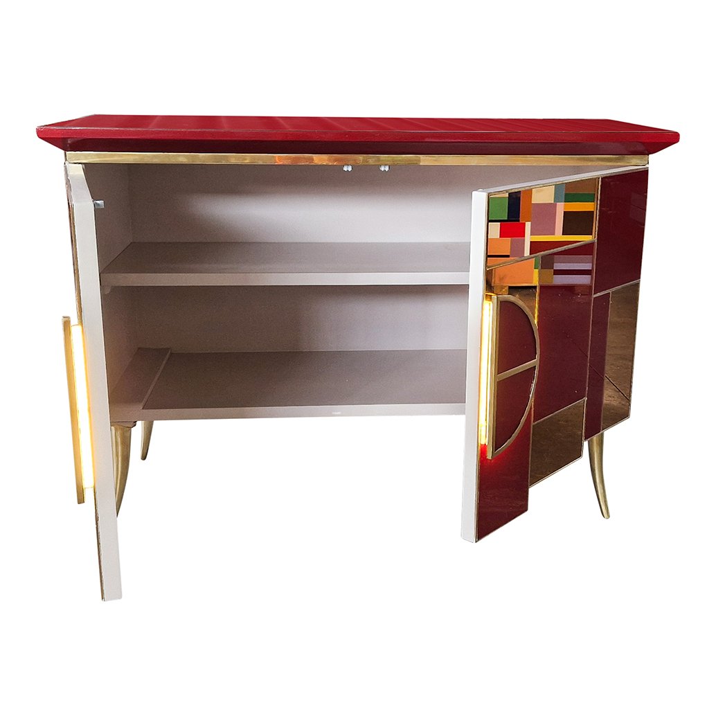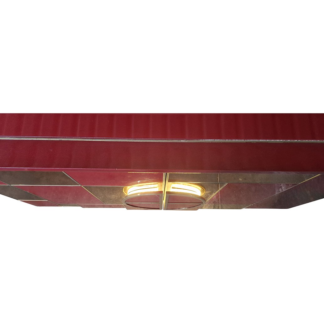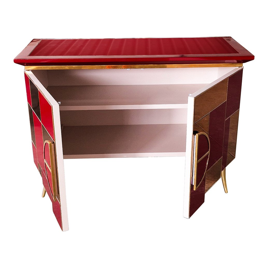 Sideboard with 2 Illuminated Doors in Burgundy Red Glass and Mirror, 1980s
