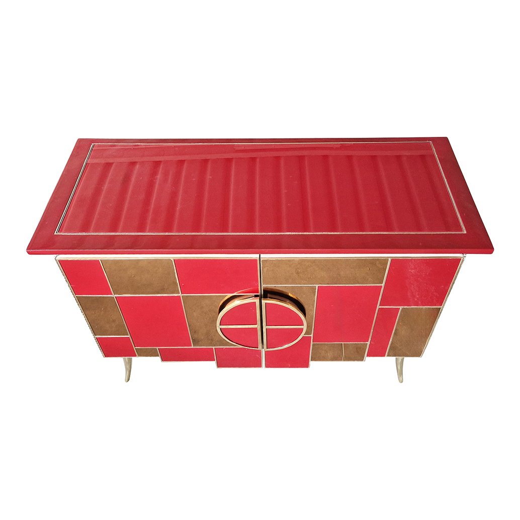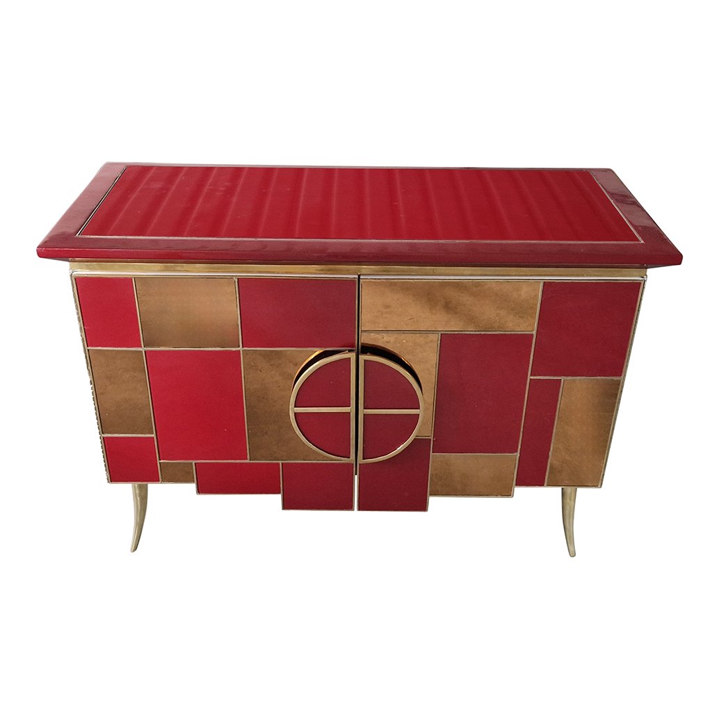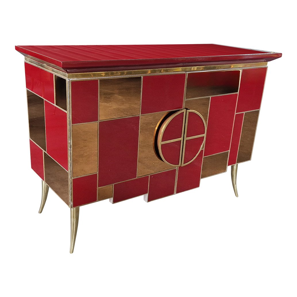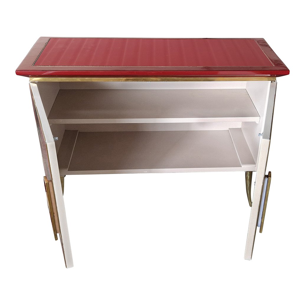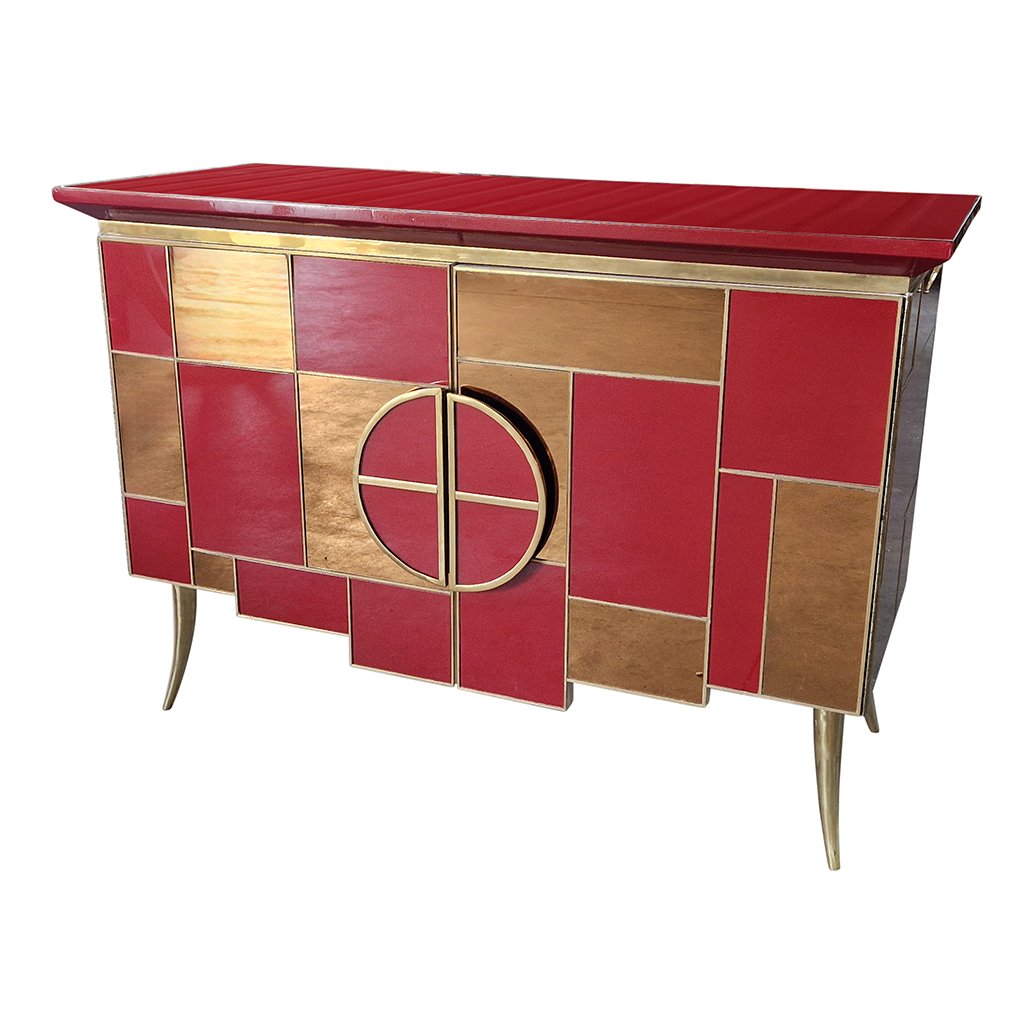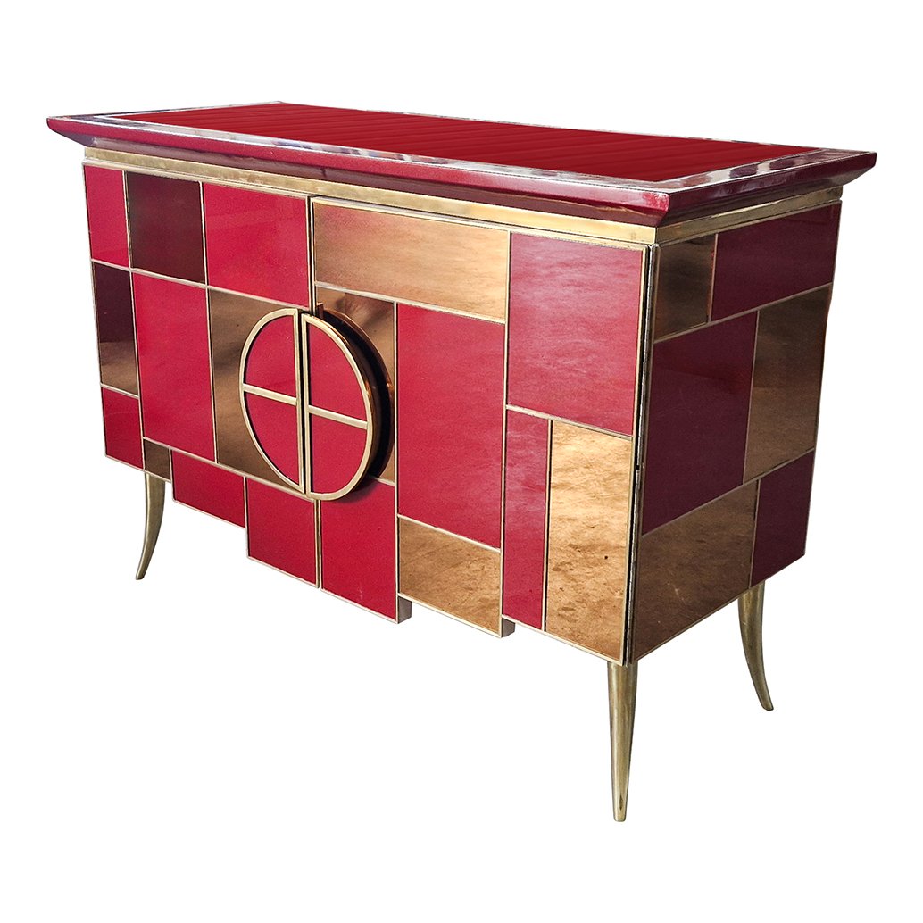 Sideboard with 2 Illuminated Doors in Burgundy Red Glass and Mirror, 1980s