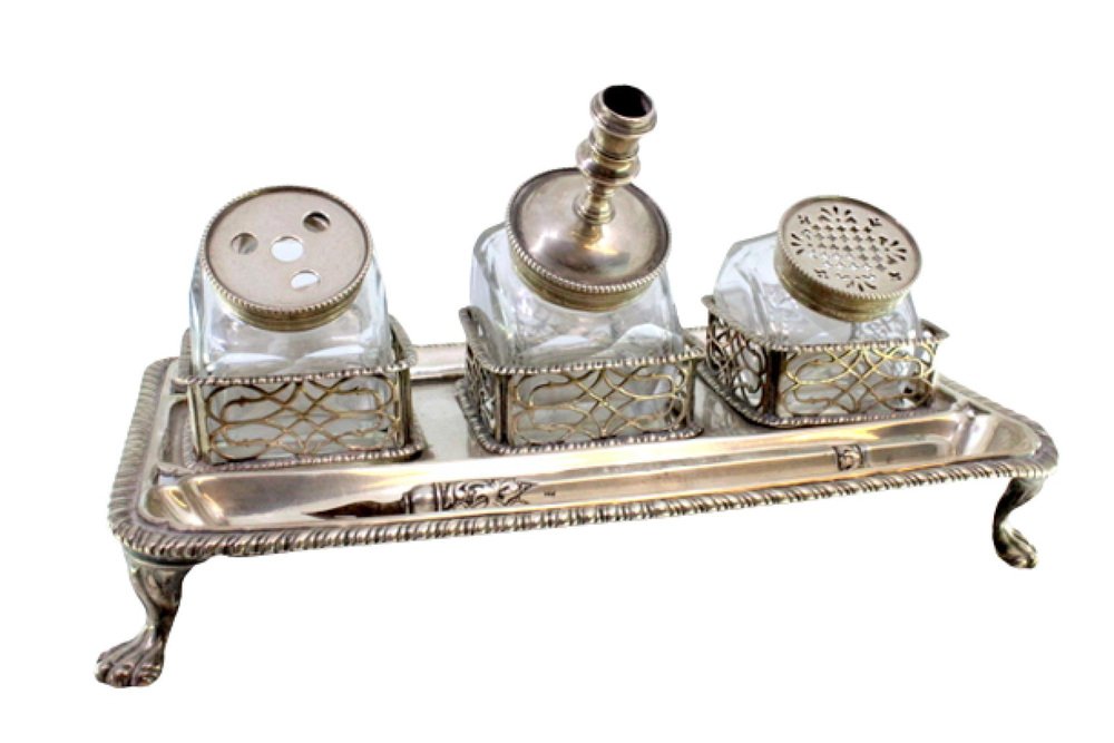 Silver and Glass Inkwell with Friezes and Claw-Shaped Feet