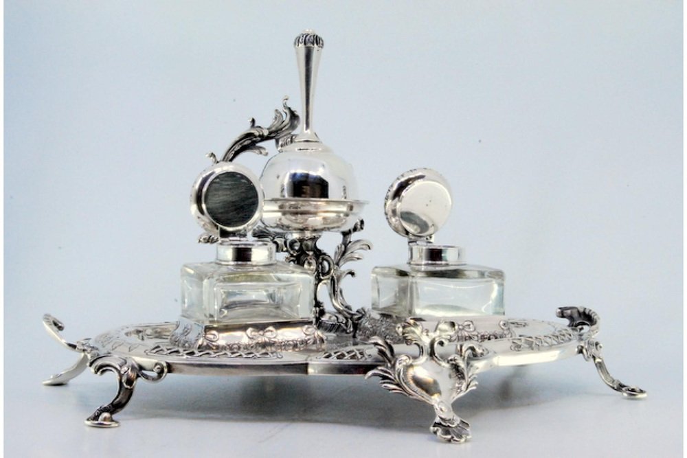 Silver Inkwell with Bell and Two Glass Tanks