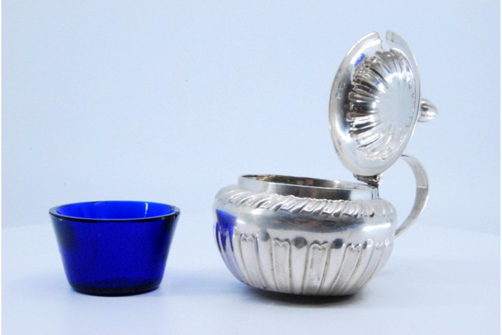 Silver Mustard Jar with Relief and Blue Glass Core