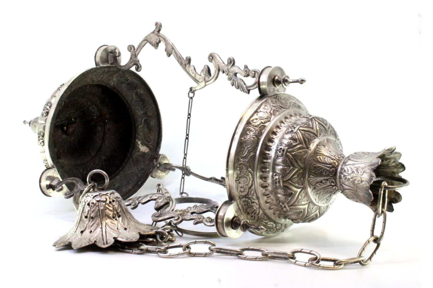 Silver Pendant with Reliefs, Mesh Suspension Chain, Padlock and Ceiling Bracket