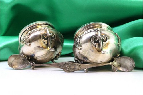 Silver Salt and Pepper Shakers with Glass Cores and Embossed Spoons, Set of 4