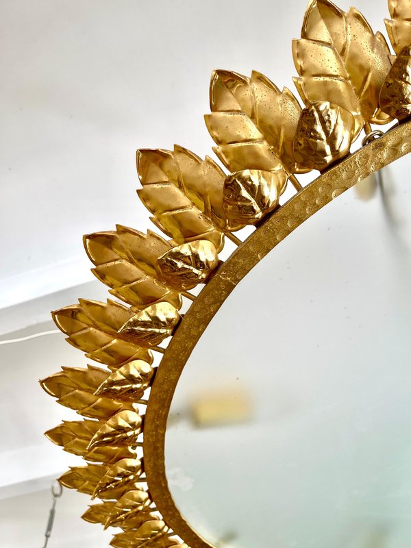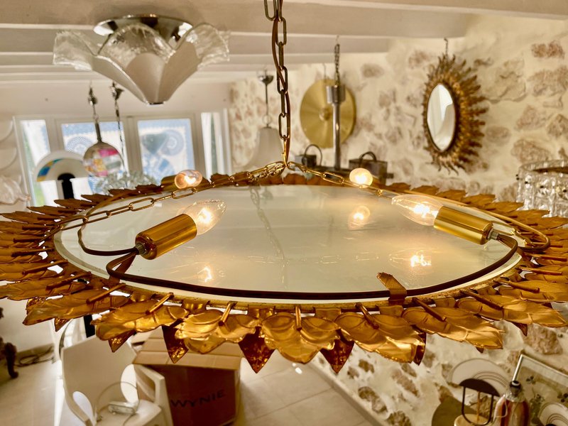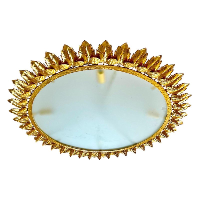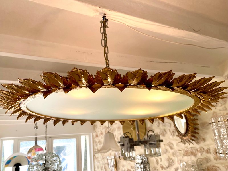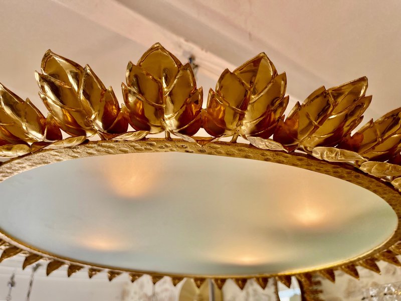 Spanish Crown Sunburst Fixture in Gilt Metal and Frost Glass, 1970s
