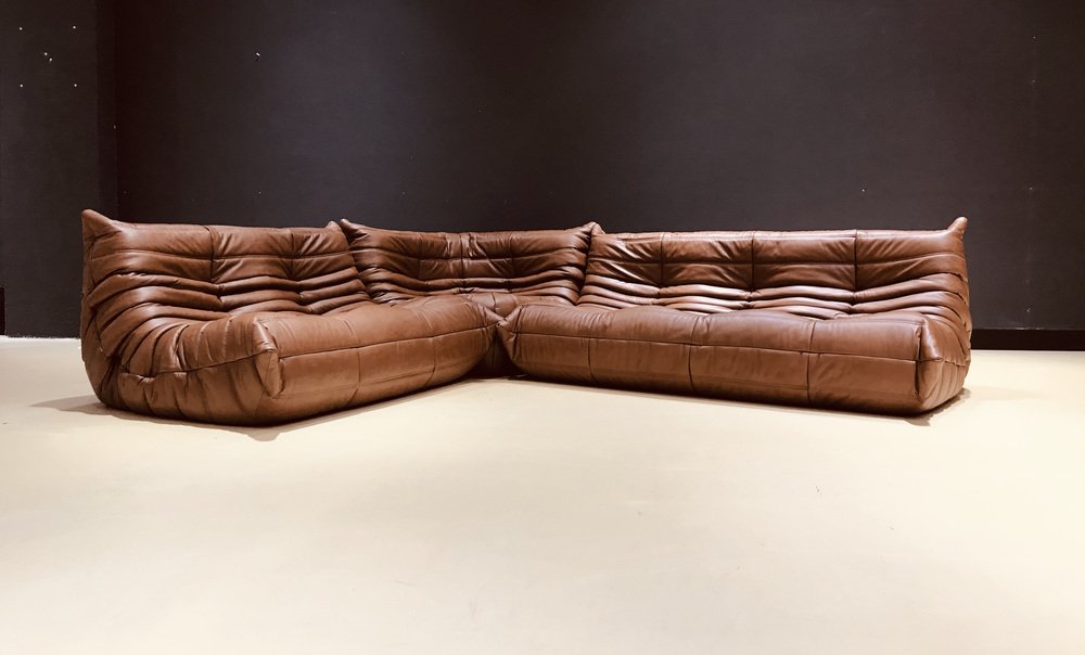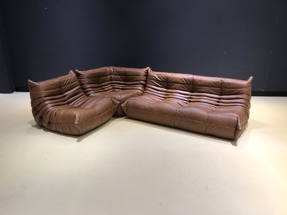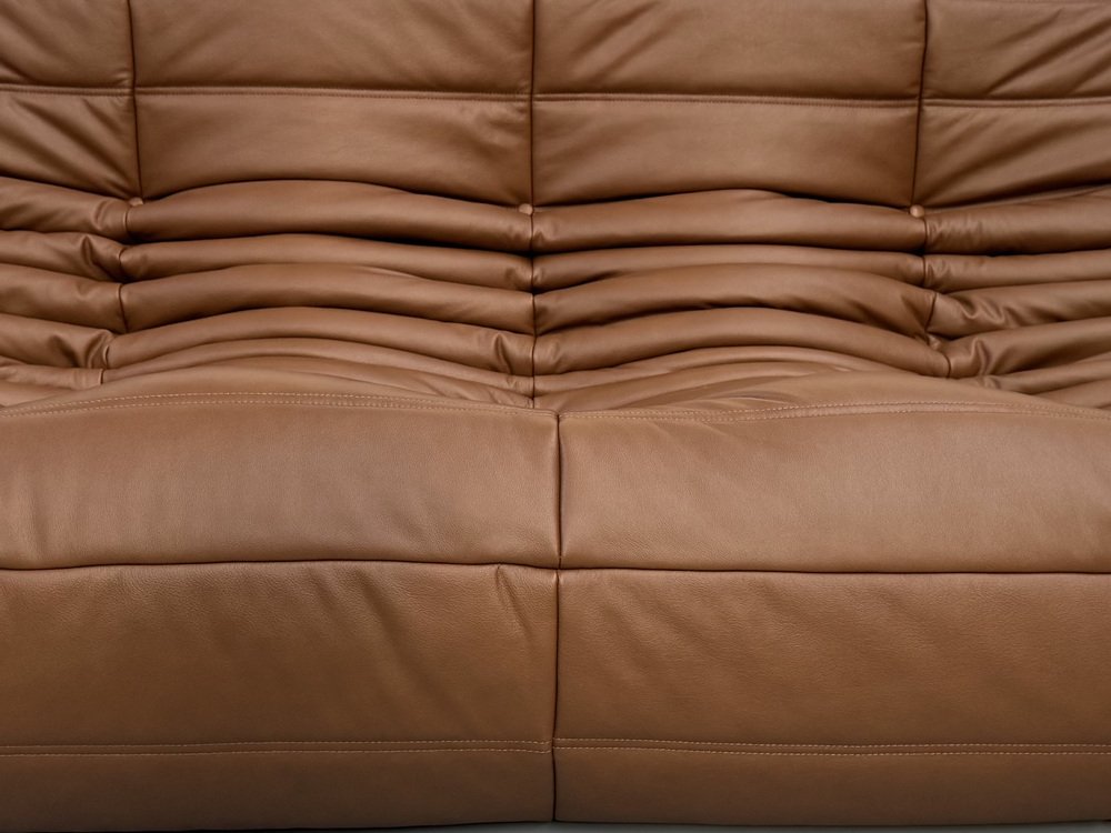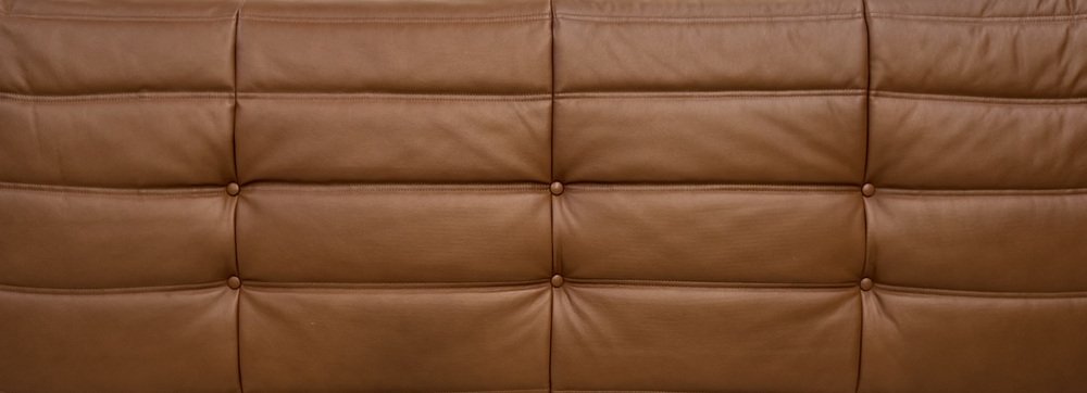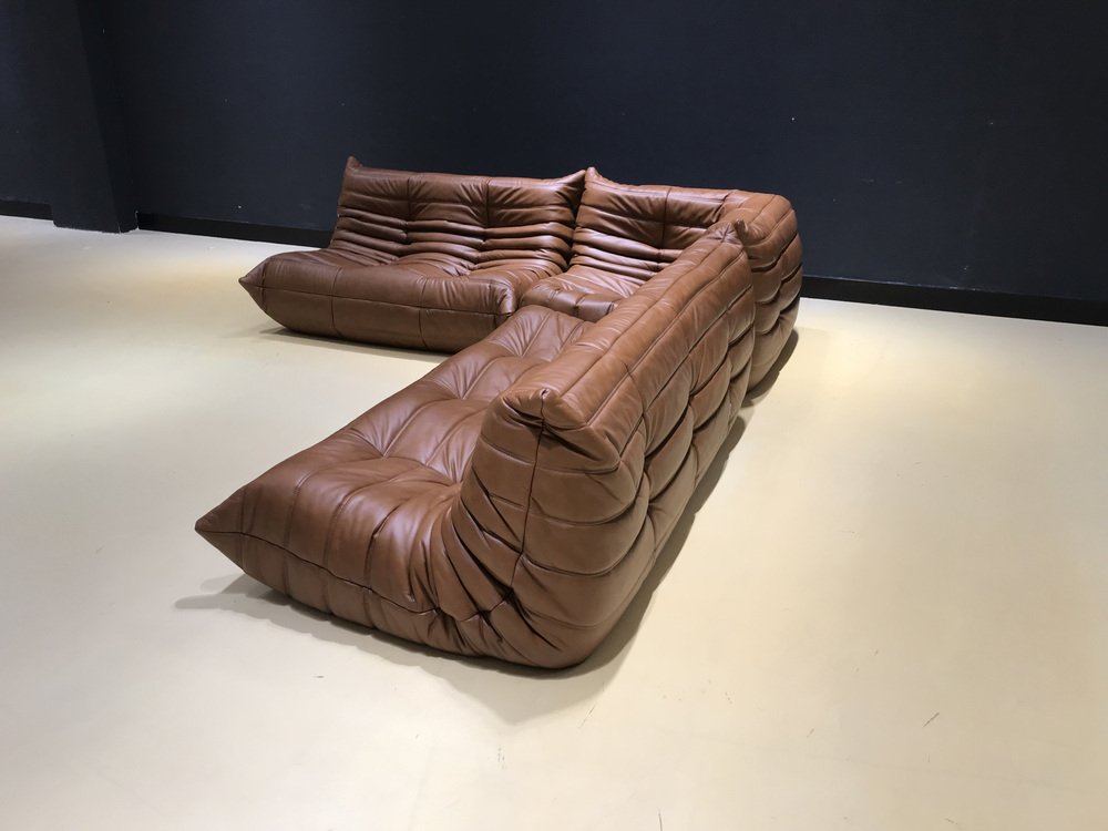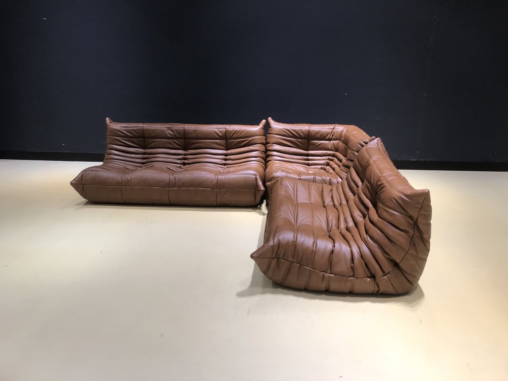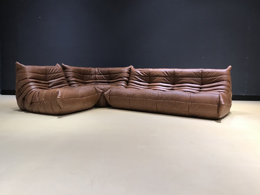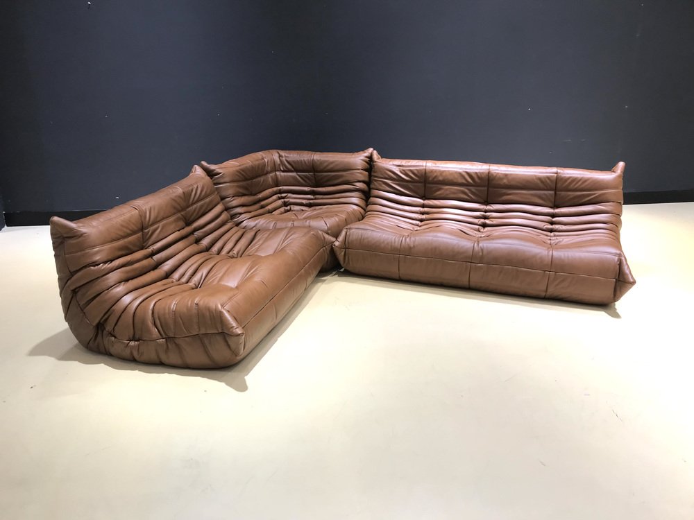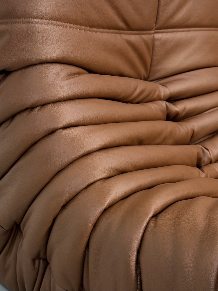 French Camel Brown Leather Togo Living Room Set attributed to Michel Ducaroy for Ligne Roset, Set of 4
