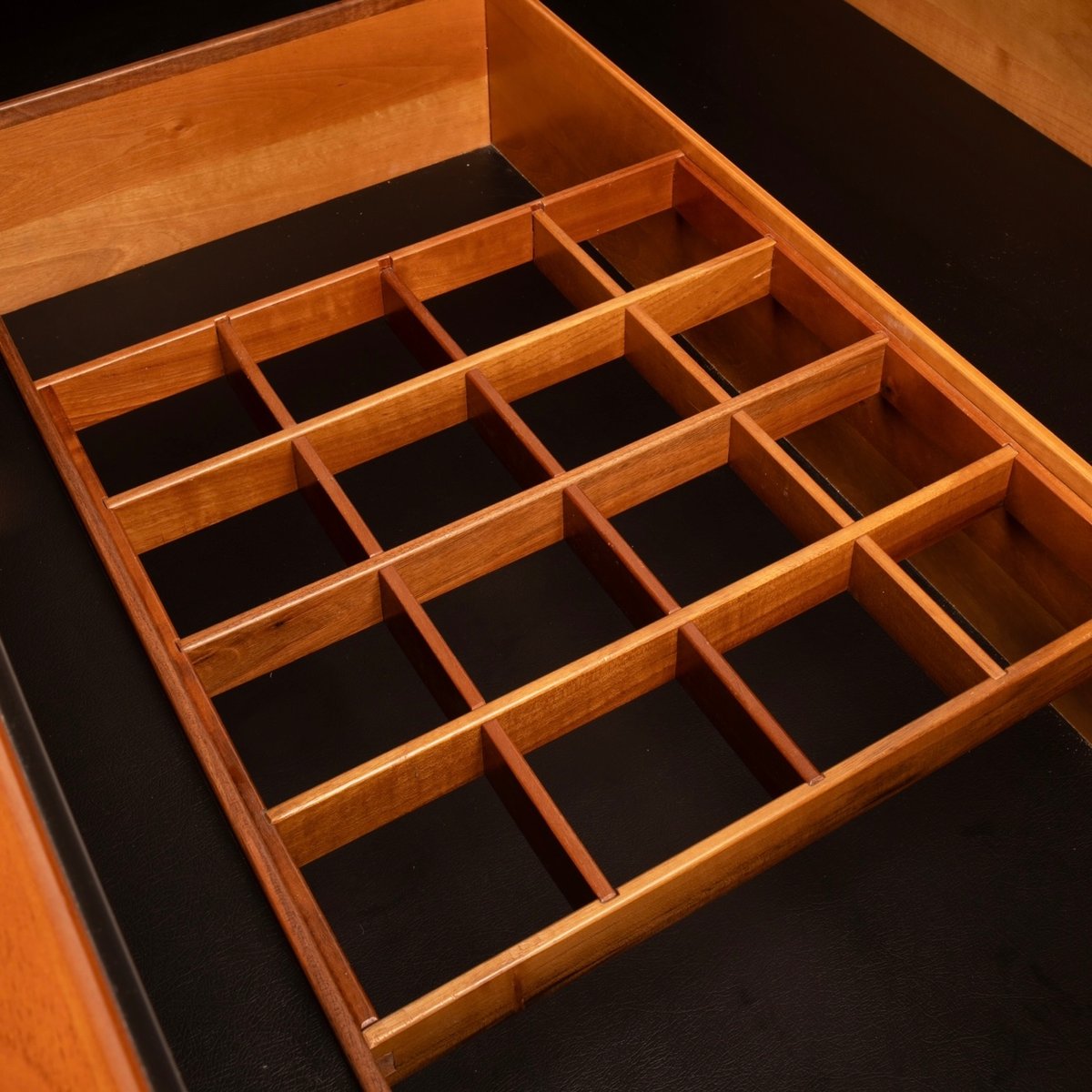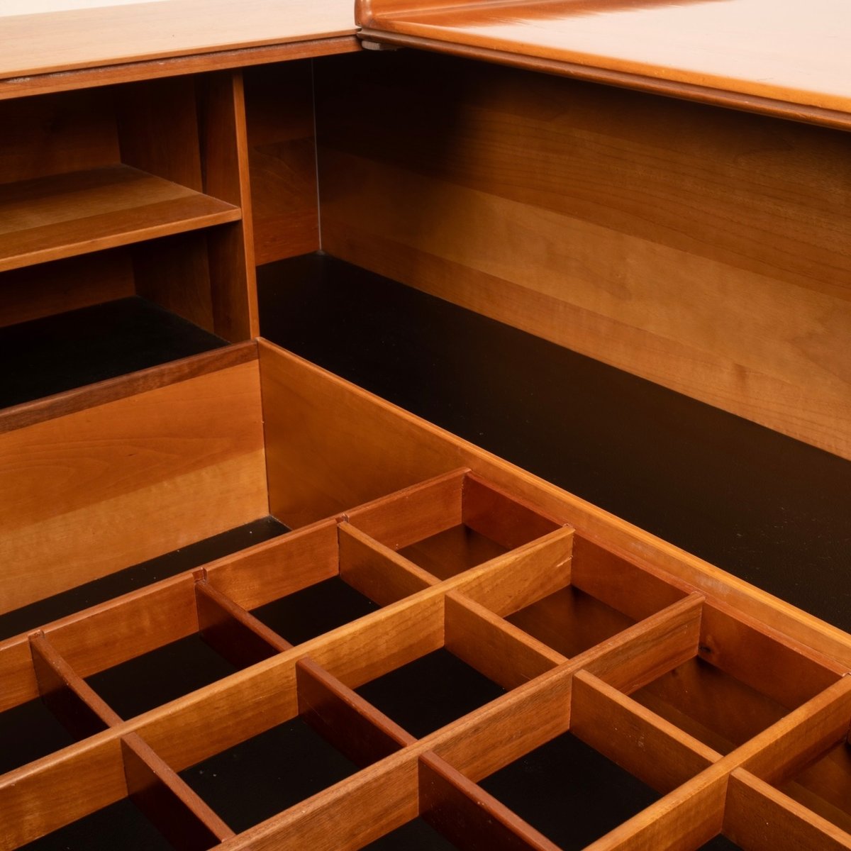 The cabinet has two sliding wooden doors on the top and when opened presents a large bottle and glass compartment, also made of solid walnut and black leather.