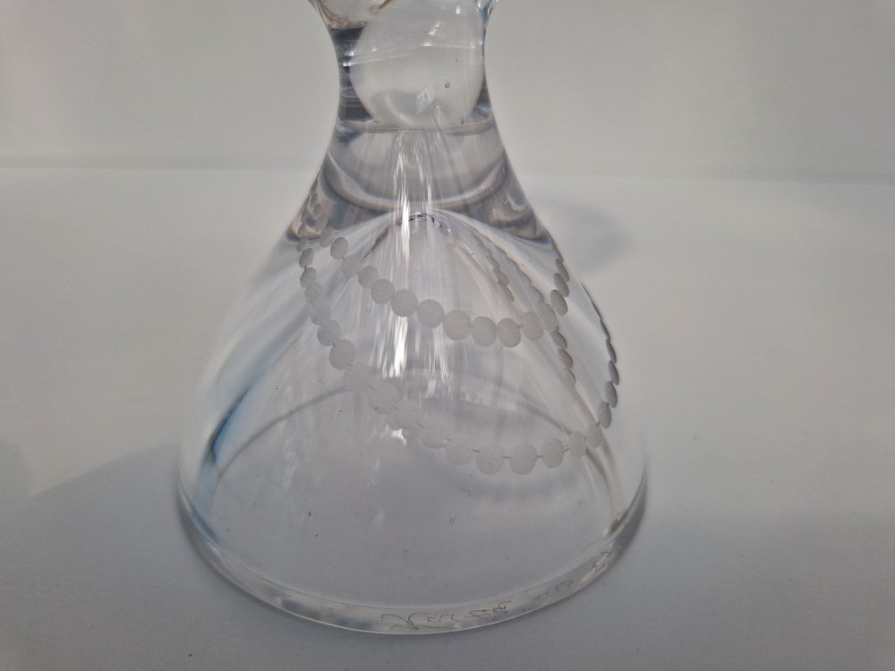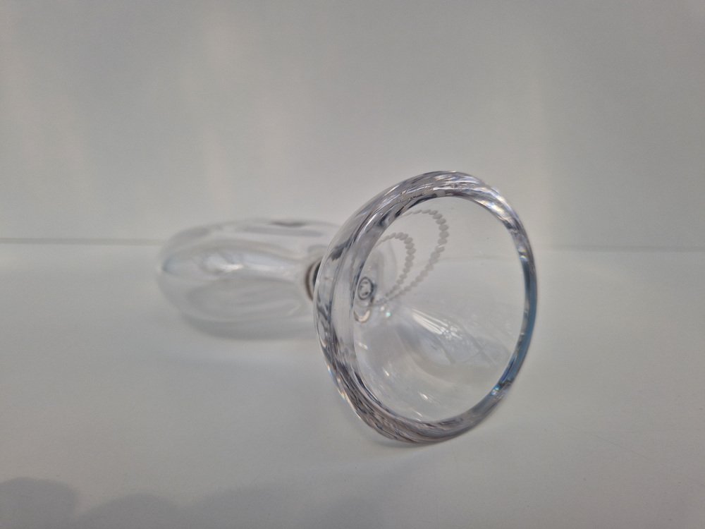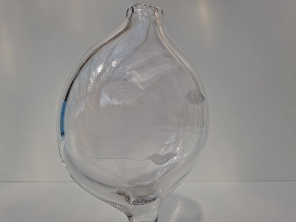Lindstrand studied commercial art and began a career in commercial illustration before moving into glasswork. In 1928, he was employed by Orrefors, where he began experiments in enameled glass—Graal-style vases, mostly—that were ultimately showcased in his design debut at the 1930 Stockholm World Fair. Cutting-edge and imaginative, the twelve vases exhibited there foreshadowed the exuberance of his later Orrefors output—like in his Pearl Driver Vase (1936), which depicted a single, suspended diver descending into currents and bubbles. While producing such designs, Lindstrand continued to experiment; it was at Orrefors that he, alongside Gustav Bergkvist and Edvin Öhrström, pioneered the Ariel technique, in which air bubbles are positioned in encased colored glass for decoration.