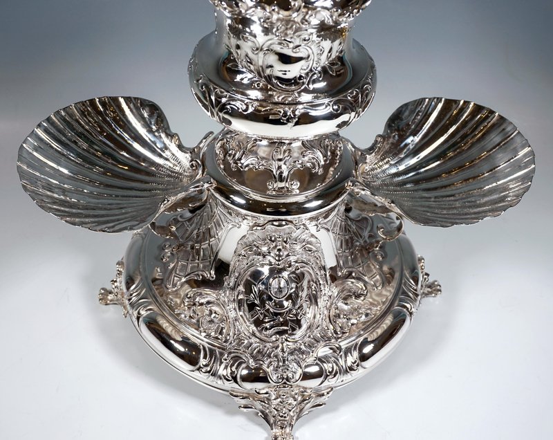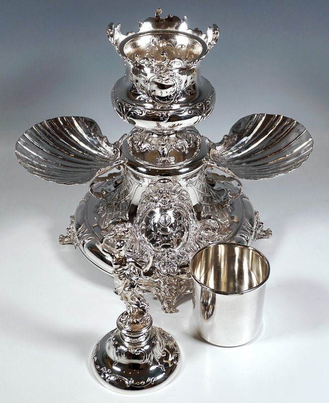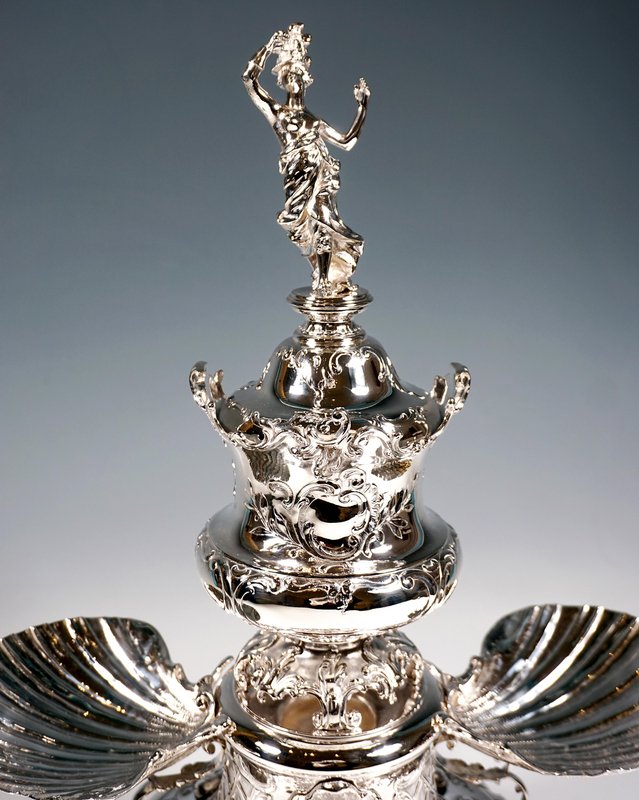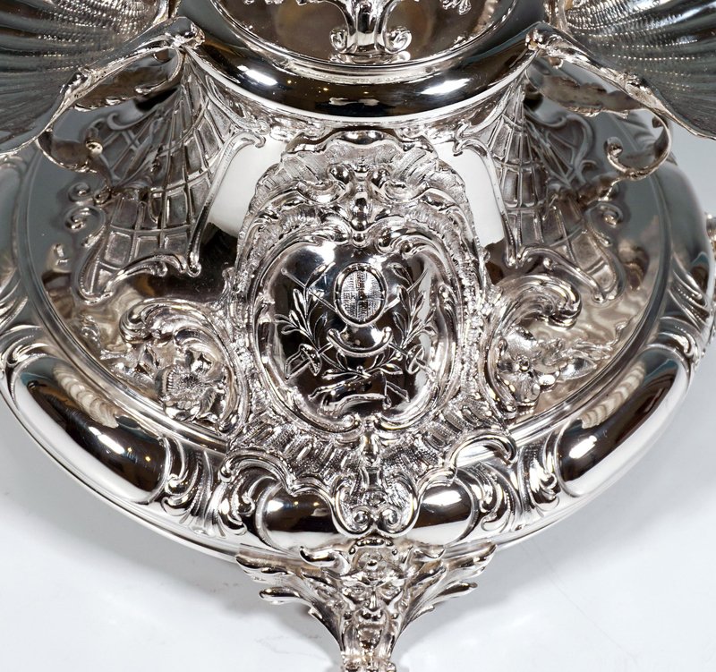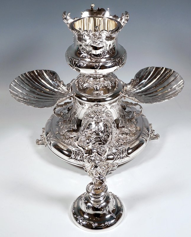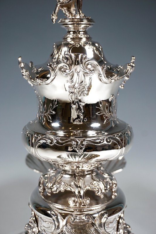 Excellent original Viennese Art Nouveau centerpiece around 1900: A wide, round, trumpet-shaped silver pedestal, curved at the bottom, tapering upwards, on four lion's paw feet with feather leaf connections and animal heads, lavish rocaille relief decoration, two large rocaille panels on the front and back, the front panel decorated with the attributes of a fencer: crossed sabre and rapier, glove and fencing mask, as well as the laurel branches adorning the victor, two lateral scallop halves resting on delicate, console-like, towering volutes, on the central round plateau the baluster-shaped container rises on four volutes of a rocaille foot, adorned with lavishly engraved and relief-worked rocaille and laurel decoration, embedded between the towering sculpted rocailles, the domed lid with a fully sculpted figurine, an Amazon wrapped in a loose cloth, with a feather-adorned hat and a fencing glove over her right, raised hand. When the lid is removed, a cylindrical silver vessel can be taken out, the existing bulges on the side of the main container to be filled with crushed ice.