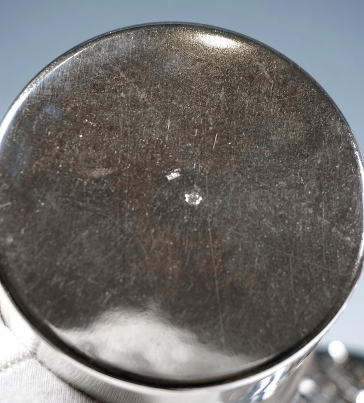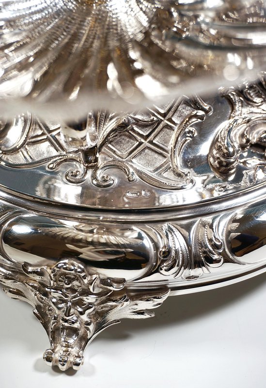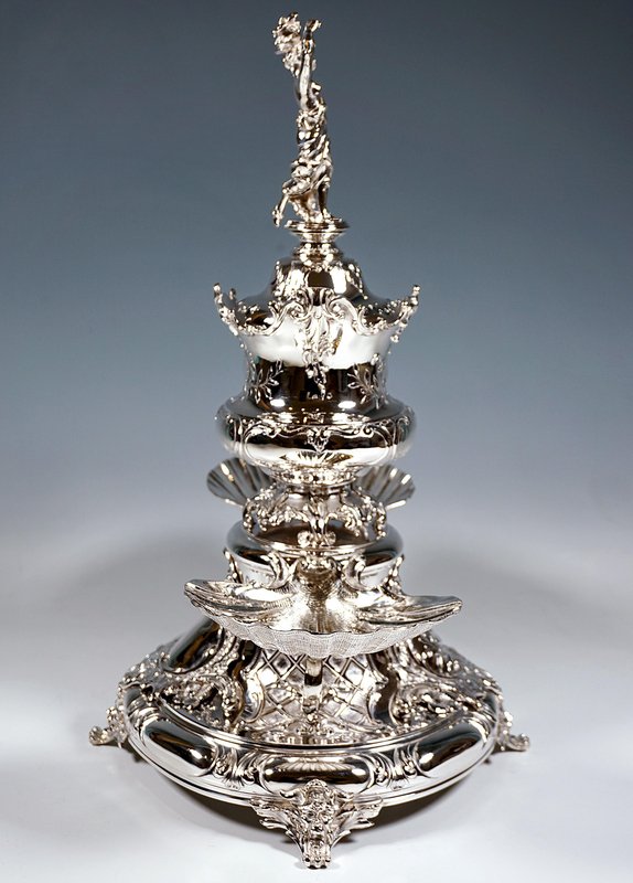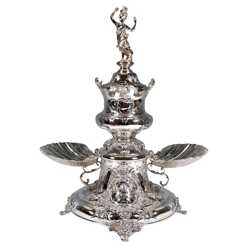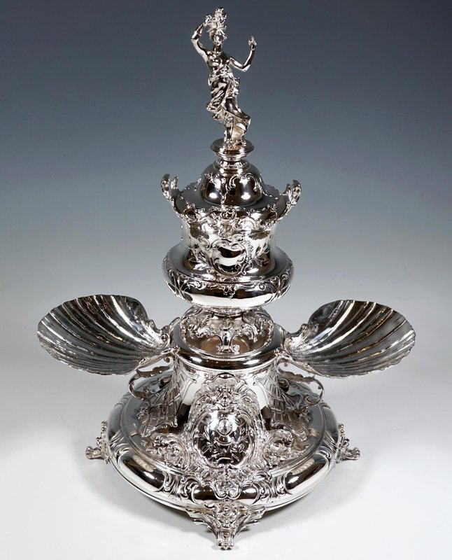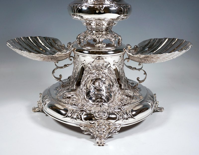 Excellent original Viennese Art Nouveau centerpiece around 1900: A wide, round, trumpet-shaped silver pedestal, curved at the bottom, tapering upwards, on four lion's paw feet with feather leaf connections and animal heads, lavish rocaille relief decoration, two large rocaille panels on the front and back, the front panel decorated with the attributes of a fencer: crossed sabre and rapier, glove and fencing mask, as well as the laurel branches adorning the victor, two lateral scallop halves resting on delicate, console-like, towering volutes, on the central round plateau the baluster-shaped container rises on four volutes of a rocaille foot, adorned with lavishly engraved and relief-worked rocaille and laurel decoration, embedded between the towering sculpted rocailles, the domed lid with a fully sculpted figurine, an Amazon wrapped in a loose cloth, with a feather-adorned hat and a fencing glove over her right, raised hand. When the lid is removed, a cylindrical silver vessel can be taken out, the existing bulges on the side of the main container to be filled with crushed ice.