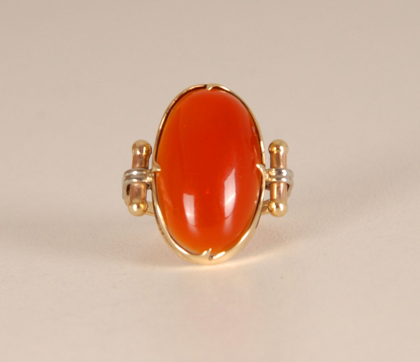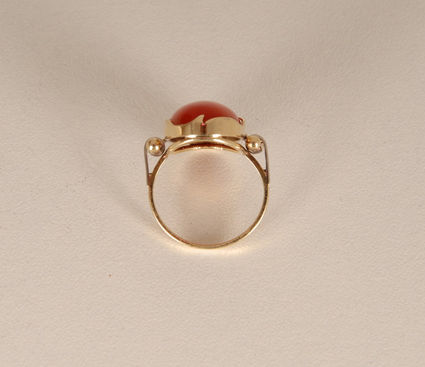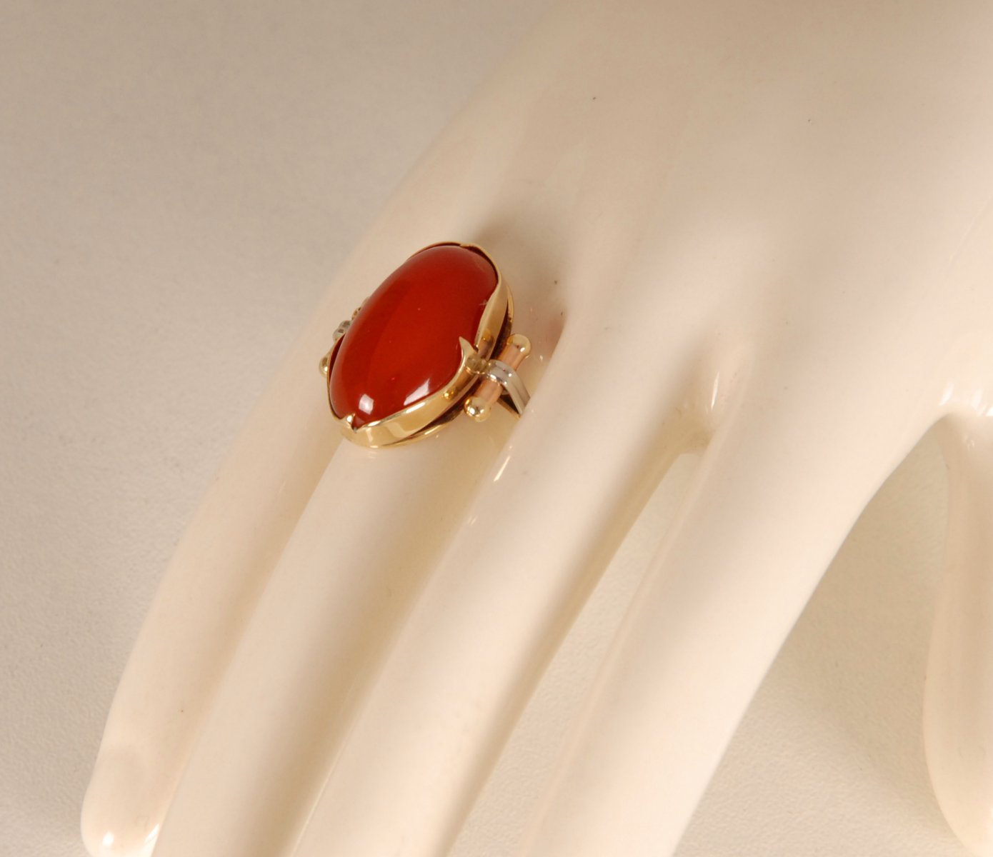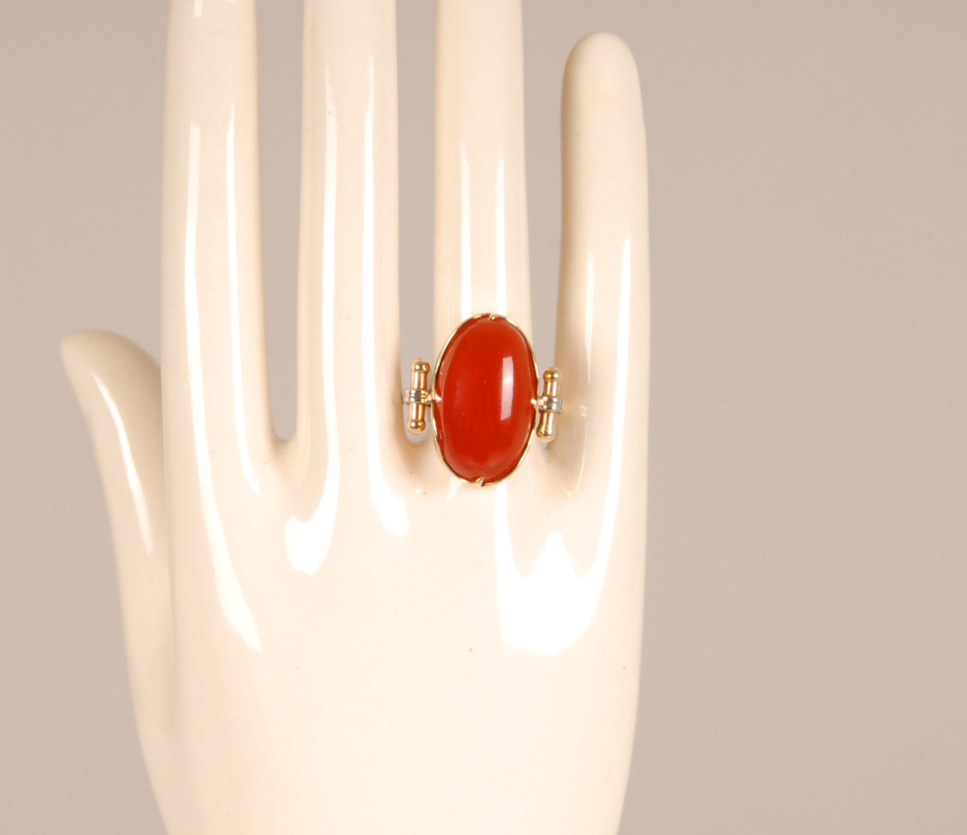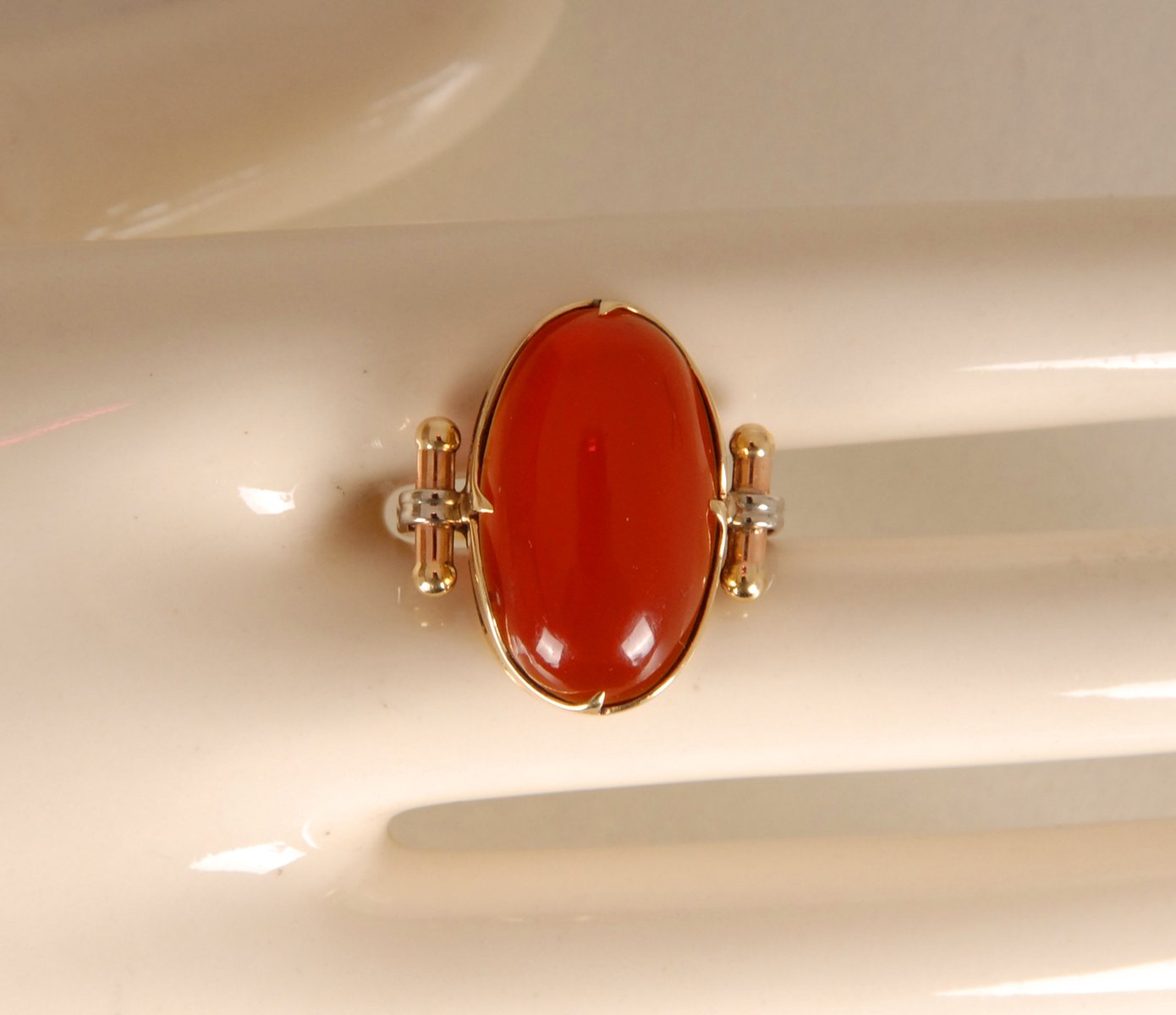 Vintage 14K Yellow Gold Statement Ring with Carnelian Agate Stone Cabochon Cut and White Gold Accent