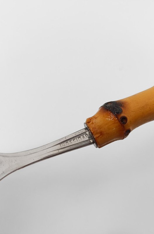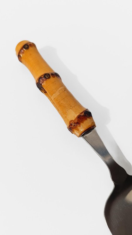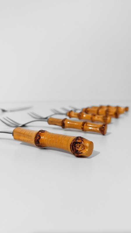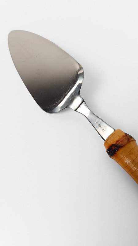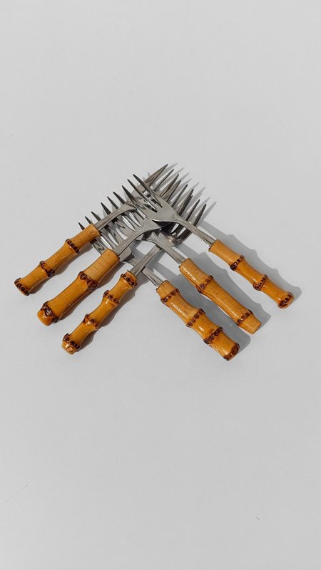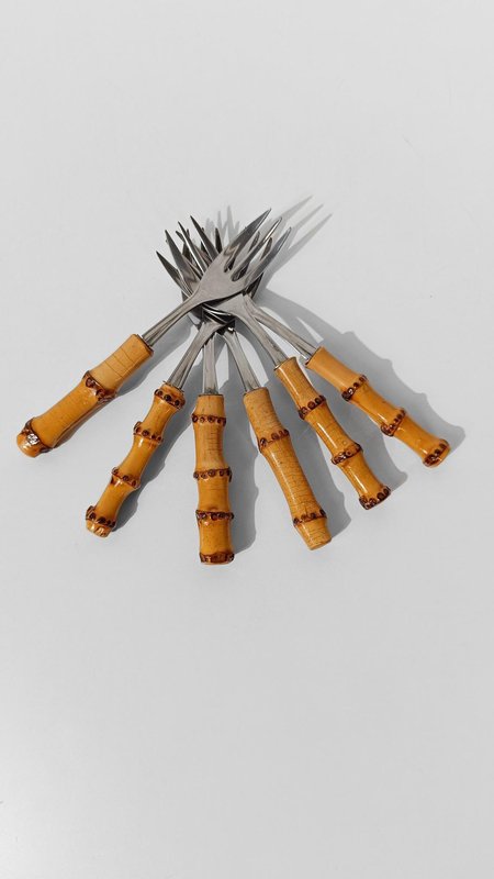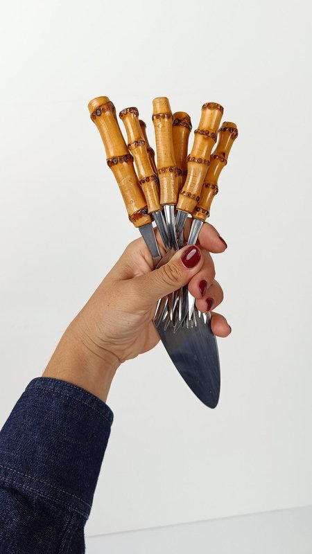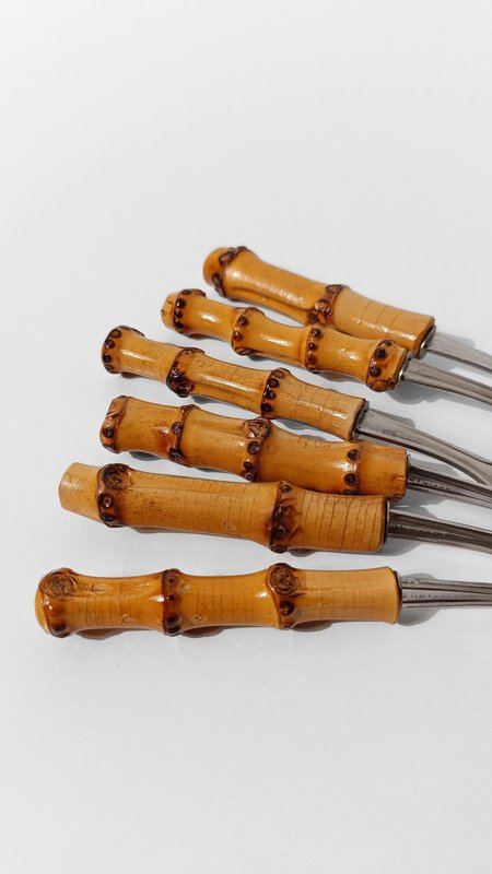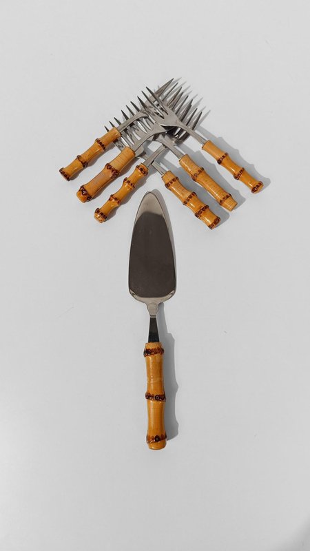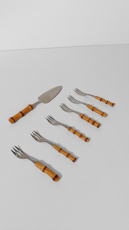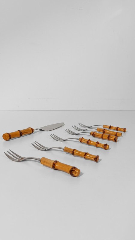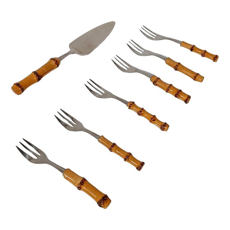 Vintage Dessert Set with Cake Server in Stainless Steel and Bamboo Handles, 1950s, Set of 7