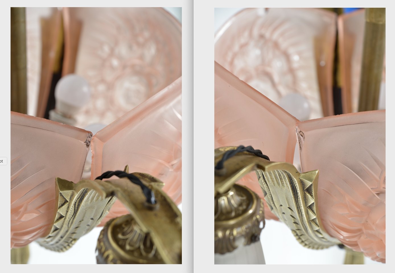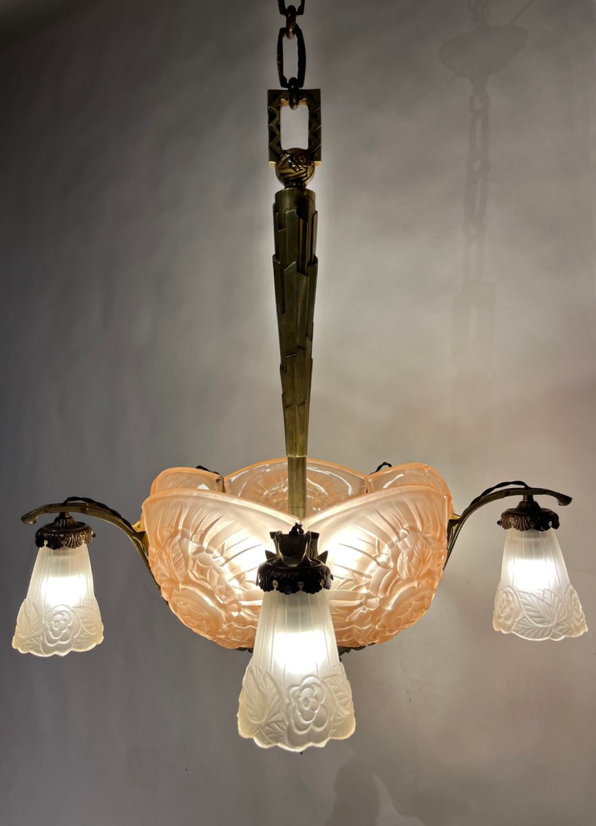 Vintage French Art Deco Brass Glass Chandelier, 1930s