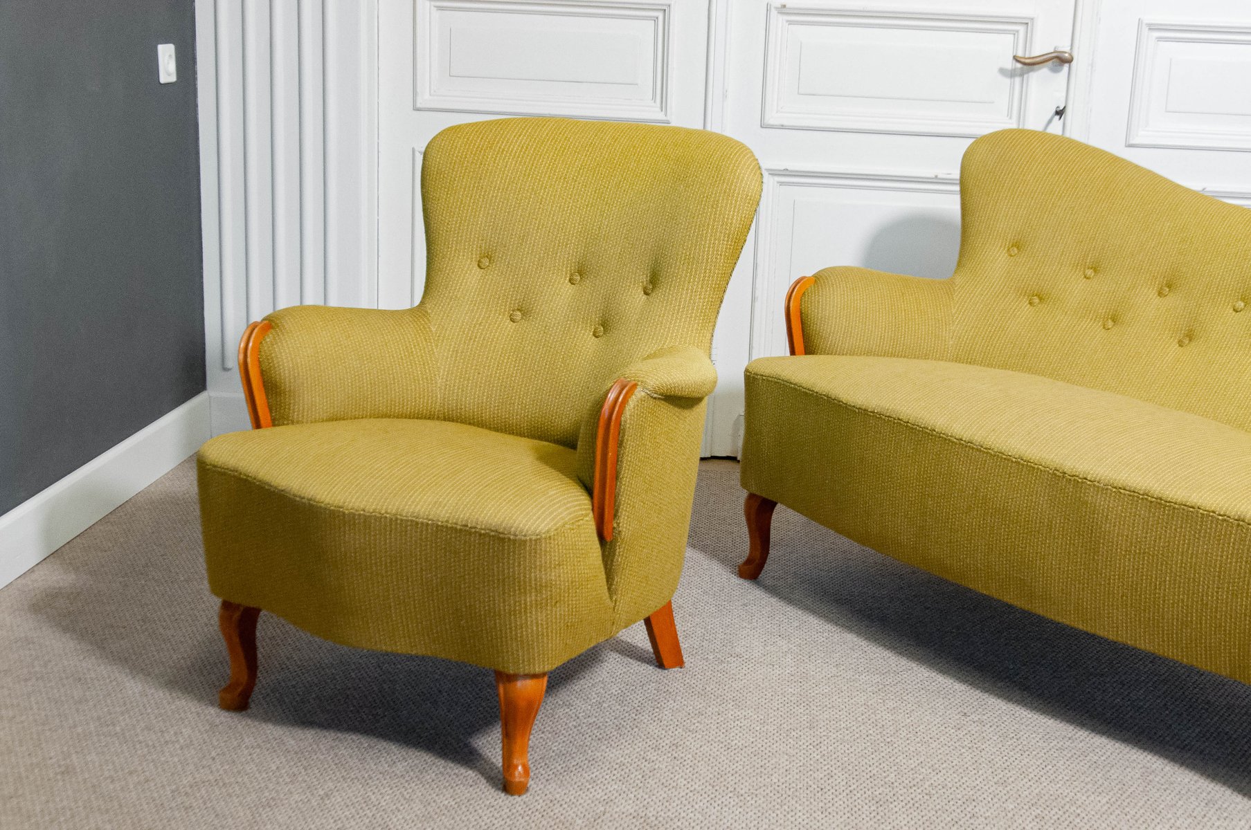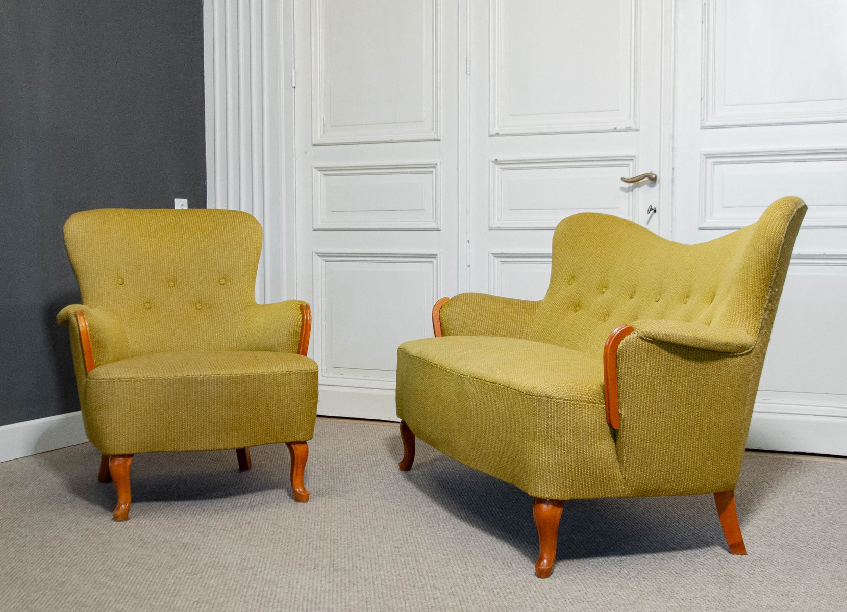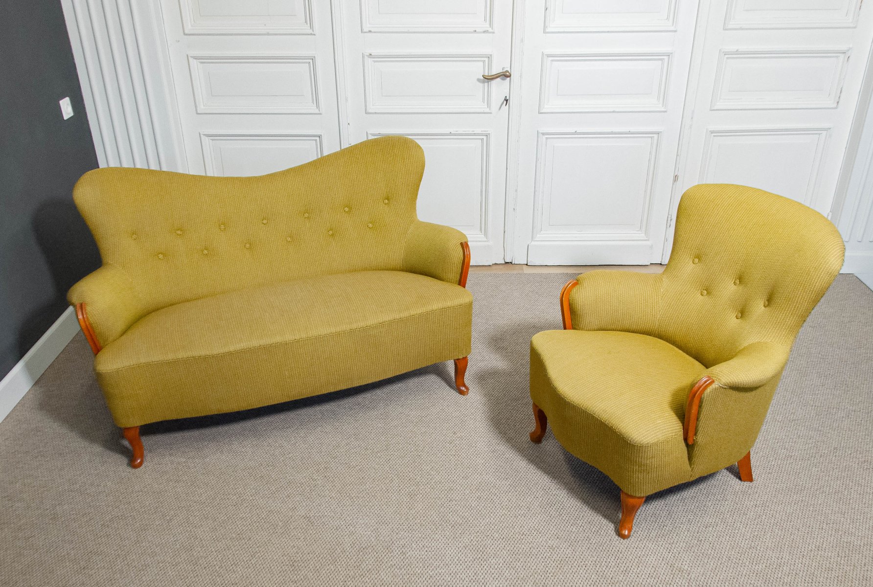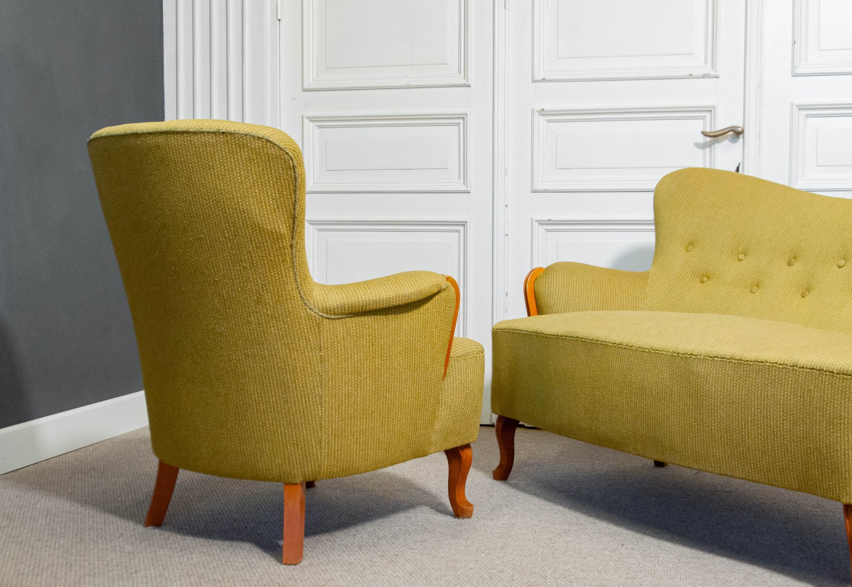 Sometime between 1904 and 1973, he designed for the world-famous NK Department Store in Stockholm. During in the 1920s, Malmsten was commissioned to create furnishings for a number of highly important clients, including the prince of Sweden, Gustaf VI Adolf in the Ulriksdal Palace (1923), Stockholm’s Concert Hall (1928), The Swedish Match Company (1928), Waldorf-Astoria in New York (1930), and the House of the League of Nations in Geneva (1934). Most of his furniture was named after the towns or clients who commissioned them.