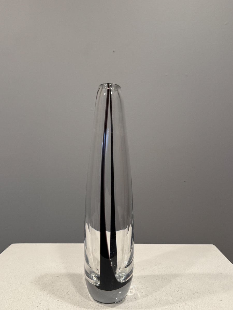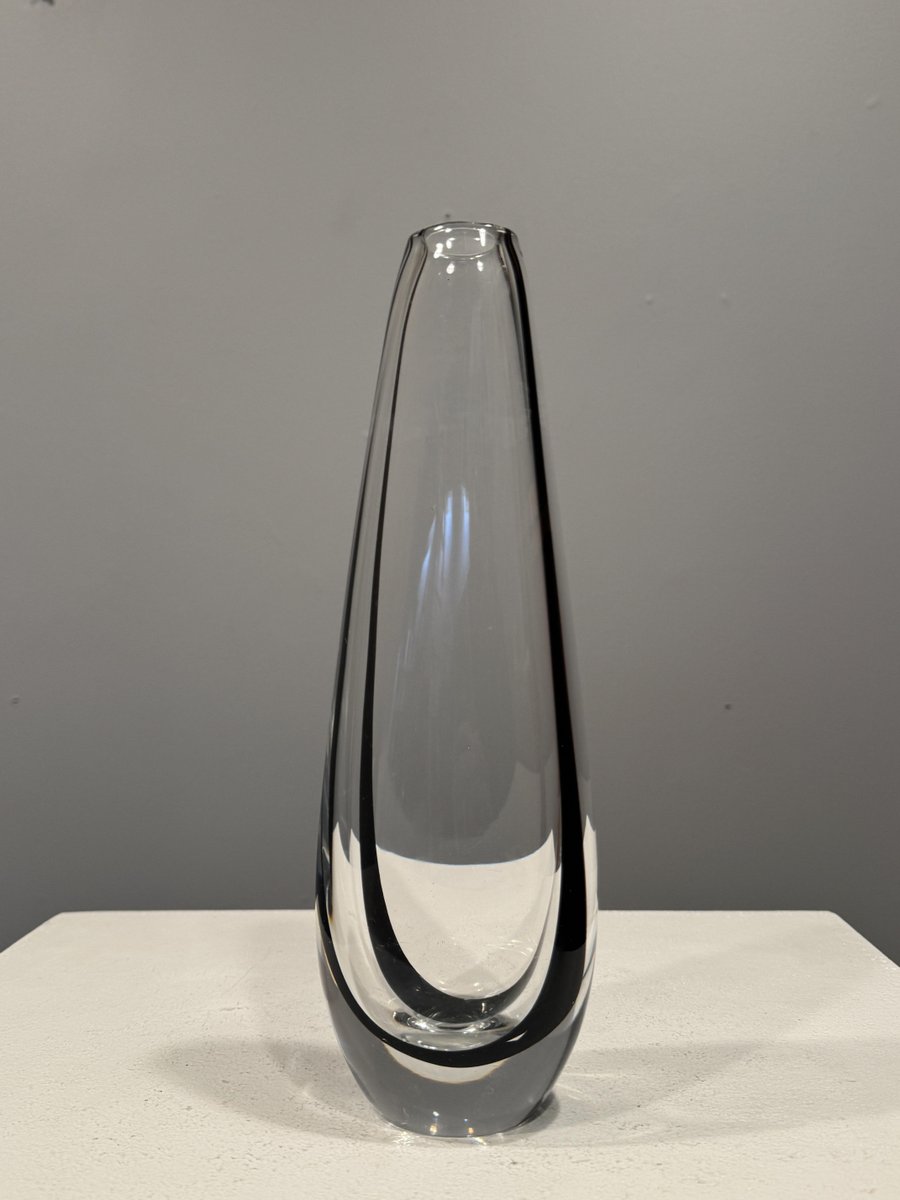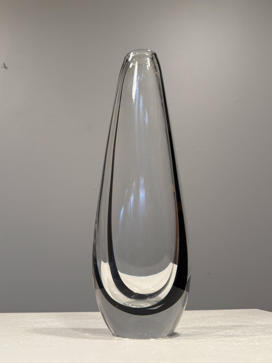 In 1942, Lindstrand left Orrefors to work for Uppsala-Ekeby, a ceramics manufacturer, where he designed groundbreaking pieces with simple lines and strong expressions, such as his Vase in Ceramic (ca. 1950s). After a 10-year tenure with the firm, he entered employment with Kosta glassworks—according to legend, Lindstrand’s Orrefors contract stated he was not allowed to work in the glass industry for 10 years after leaving. At Kosta, Lindstrand designed art glass similar to his Orrefors oeuvre, but he employed more color; among his most well-known pieces are his Höst Vase and his Atlantis Vases (both ca. 1950s), which depicted fishnet lines next to people or schools of fish.