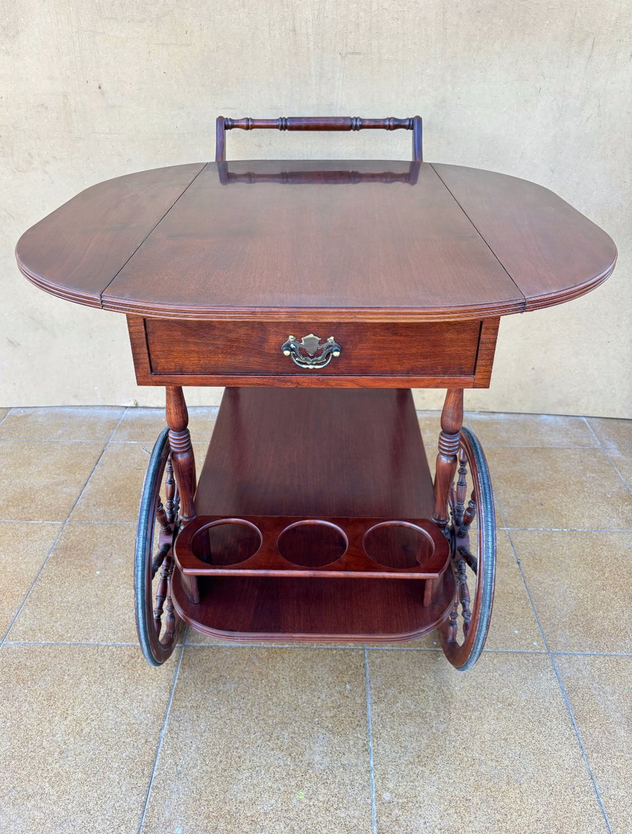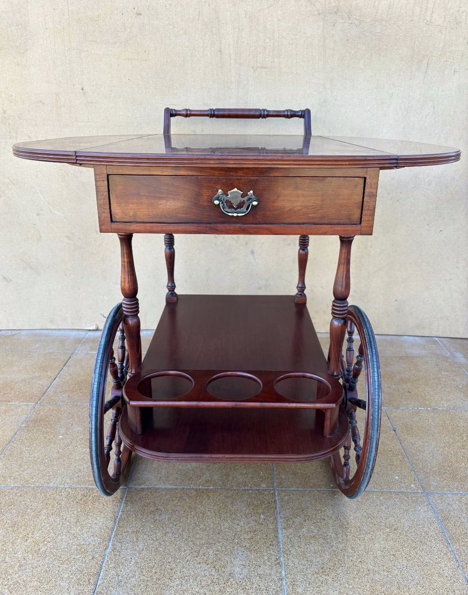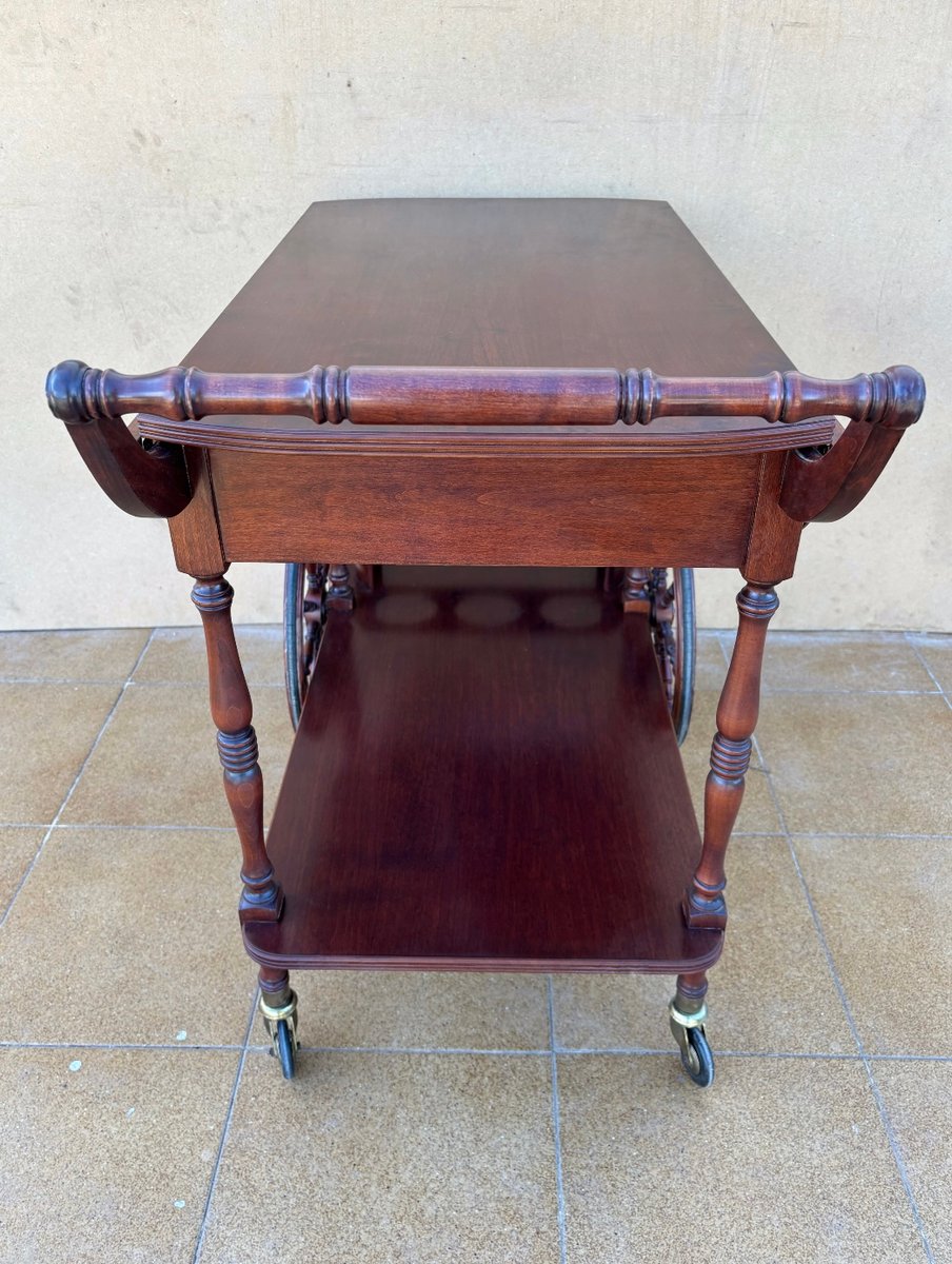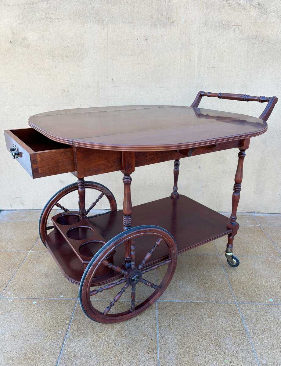 Vintage Wood Bar Cart with Spoked Wheels and Drawer, 1950s