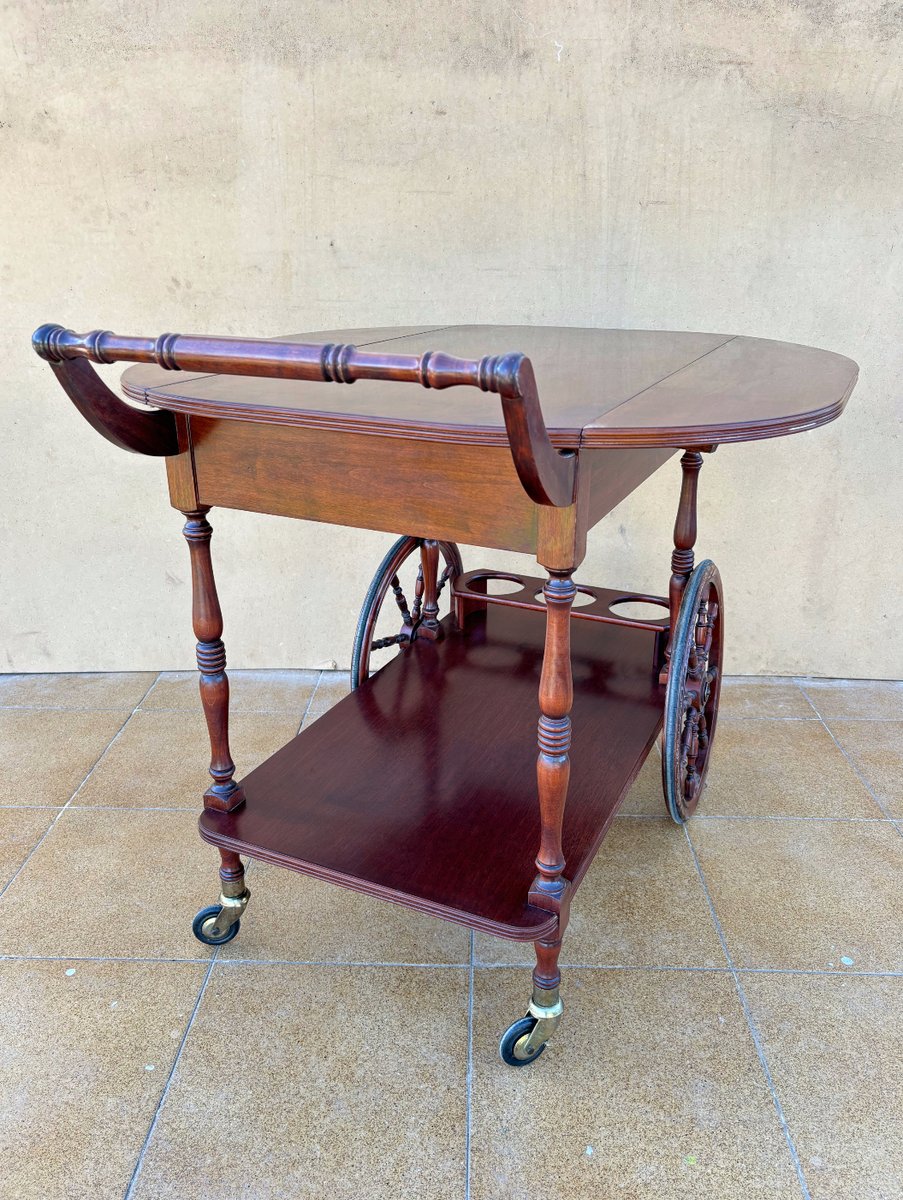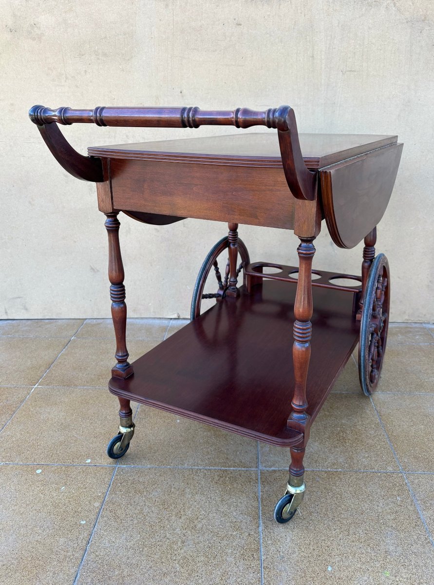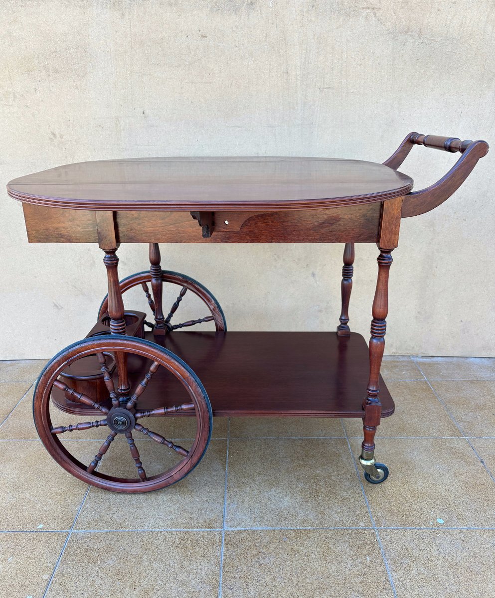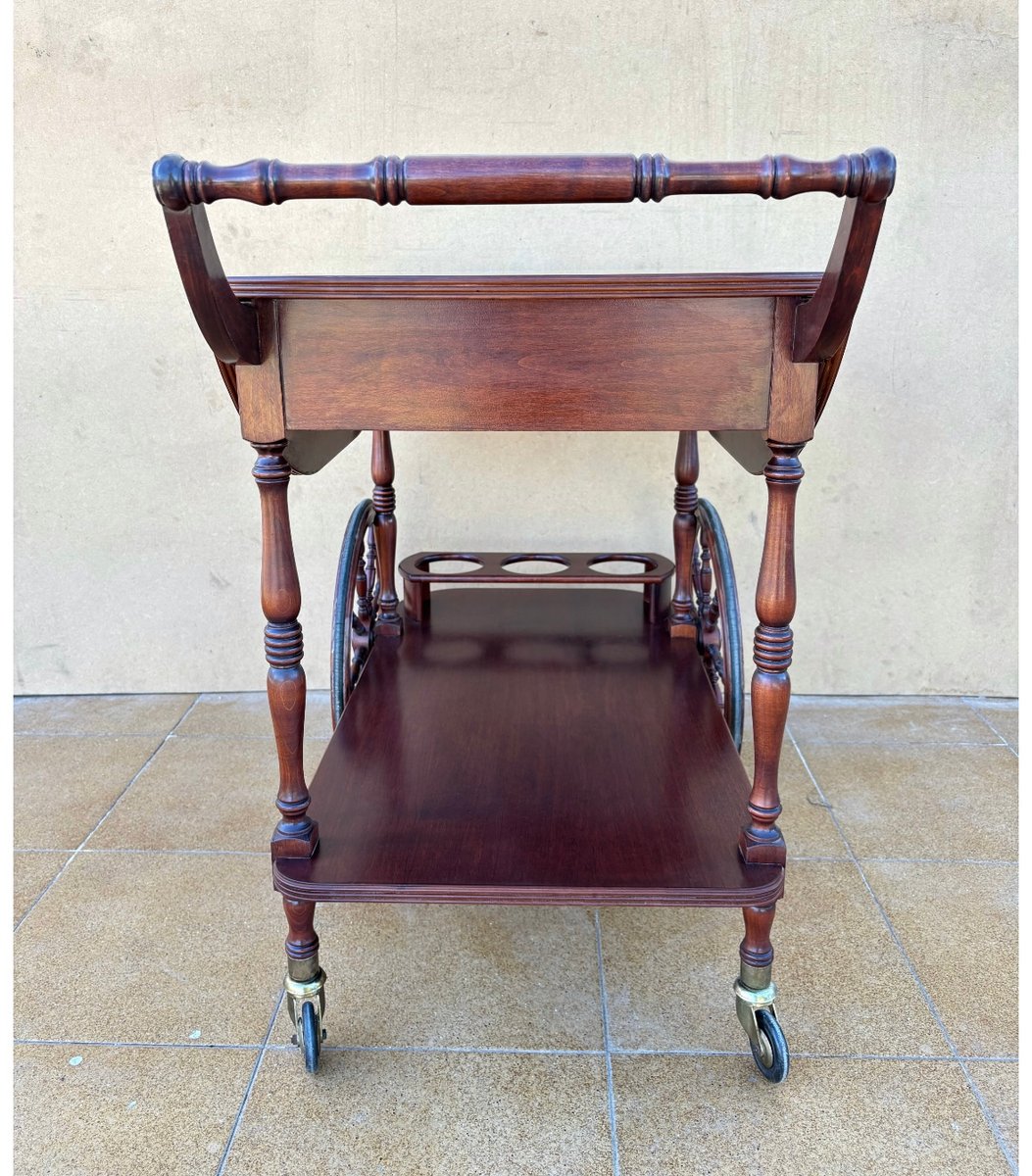 Vintage Wood Bar Cart with Spoked Wheels and Drawer, 1950s