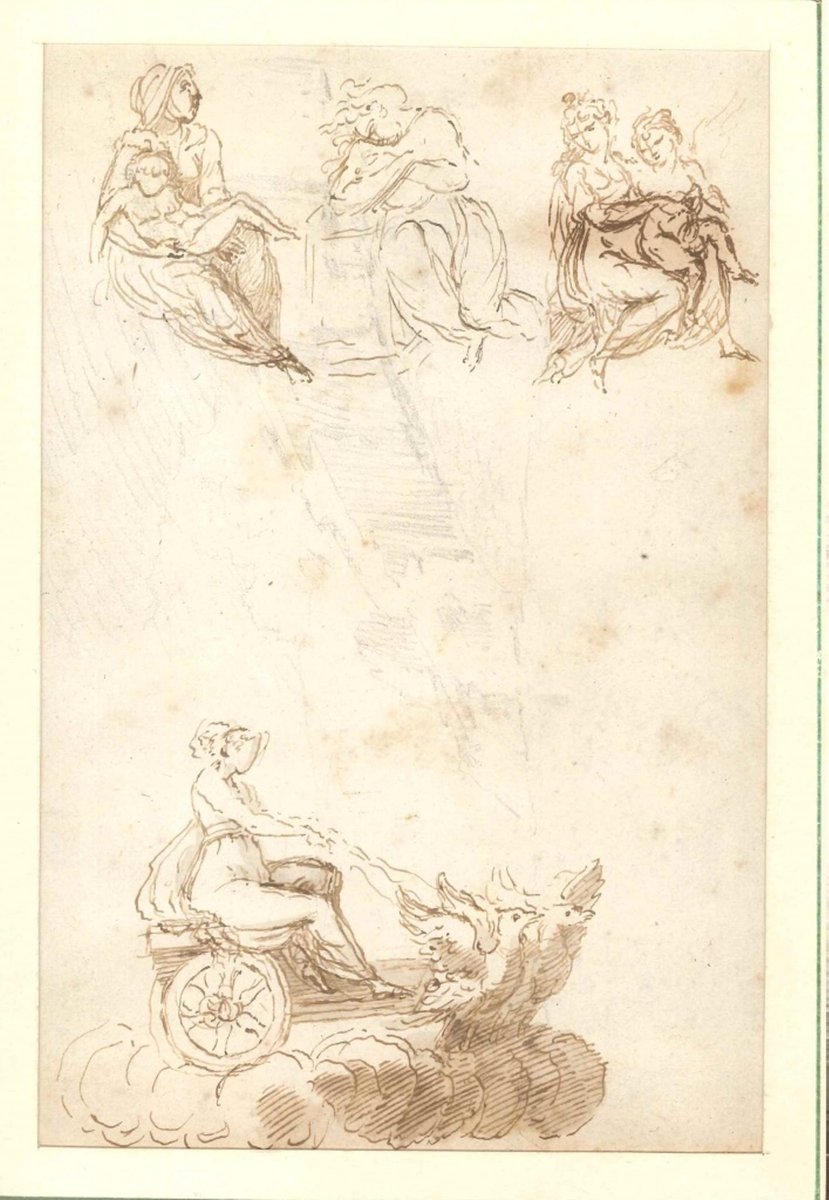 Virgin on a Winged Cart, Original Ink and Watercolor, 18th Century