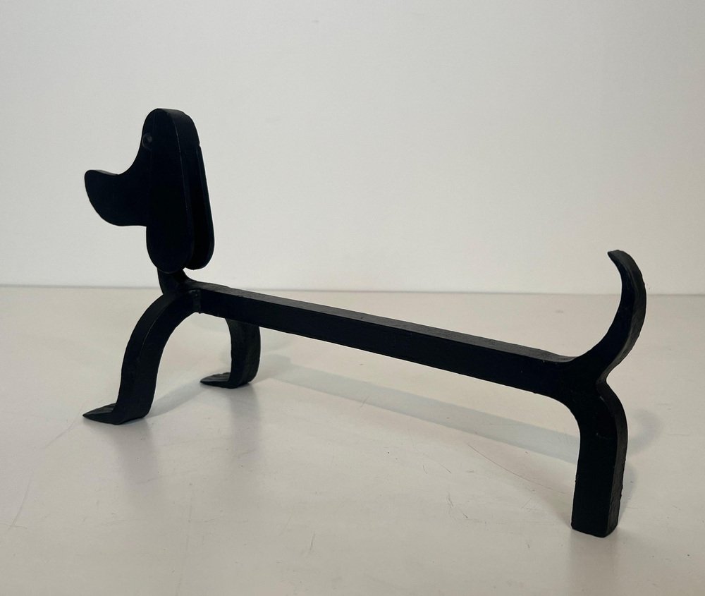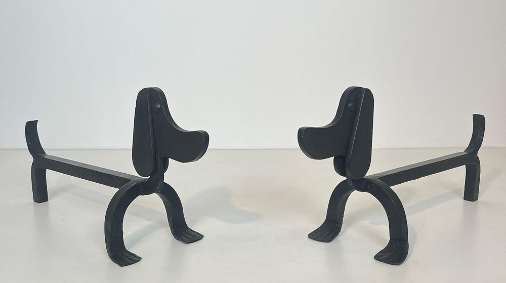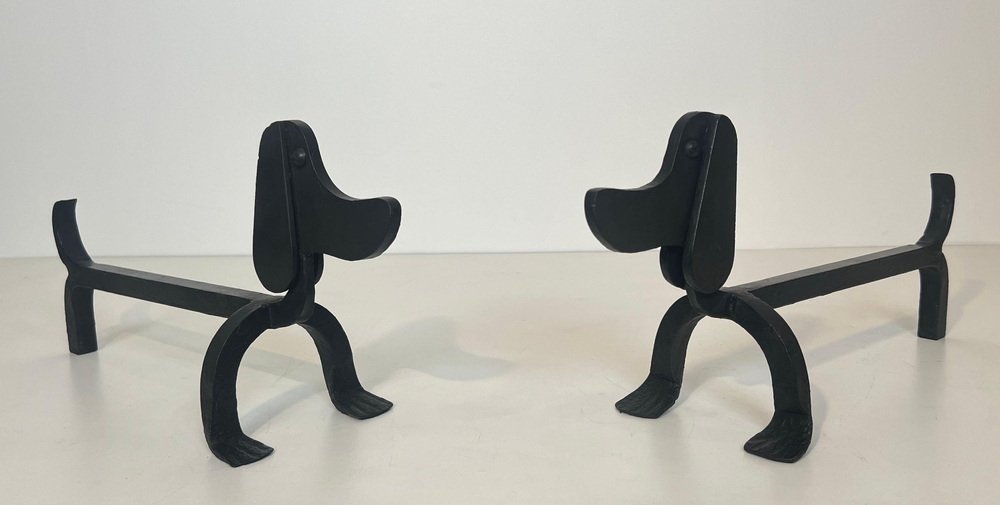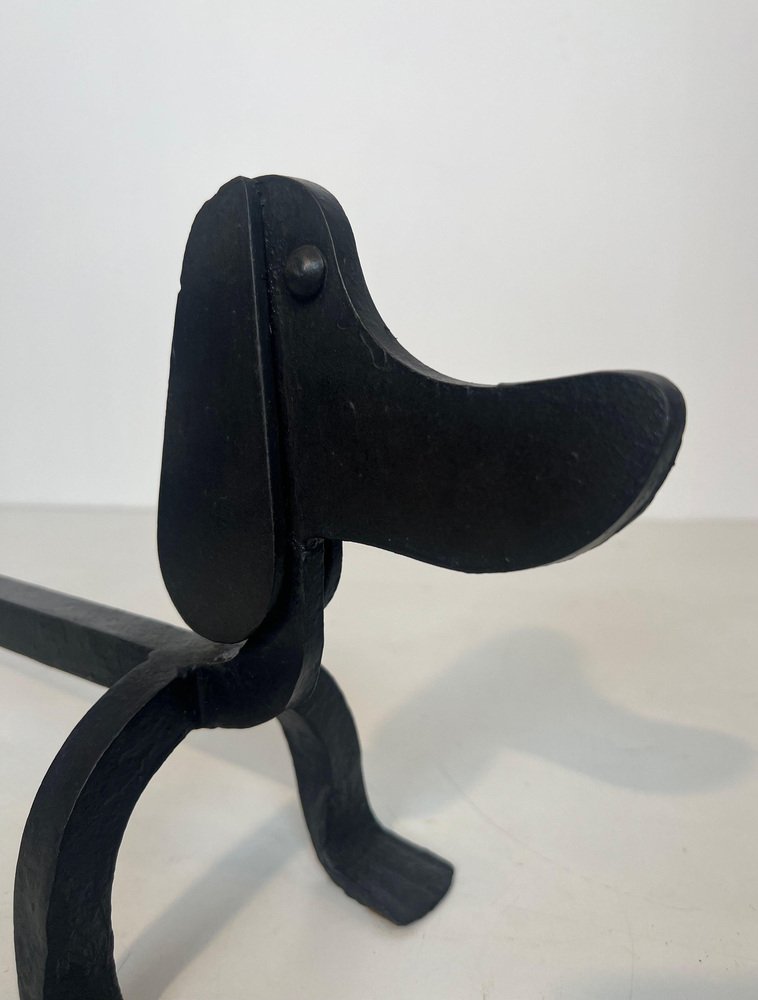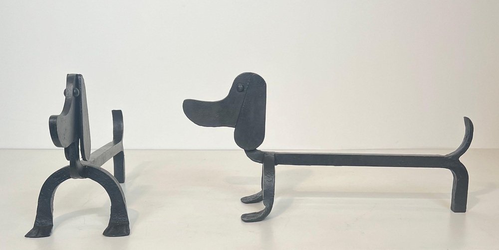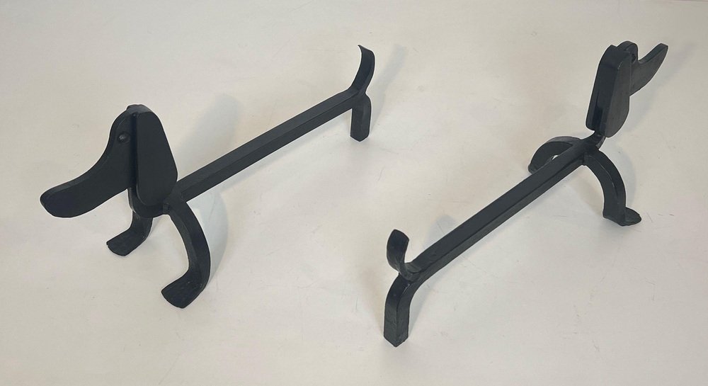 Wrought Iron Chenets Representing Dachshunds attributed to Edouard Schenck, Set of 2